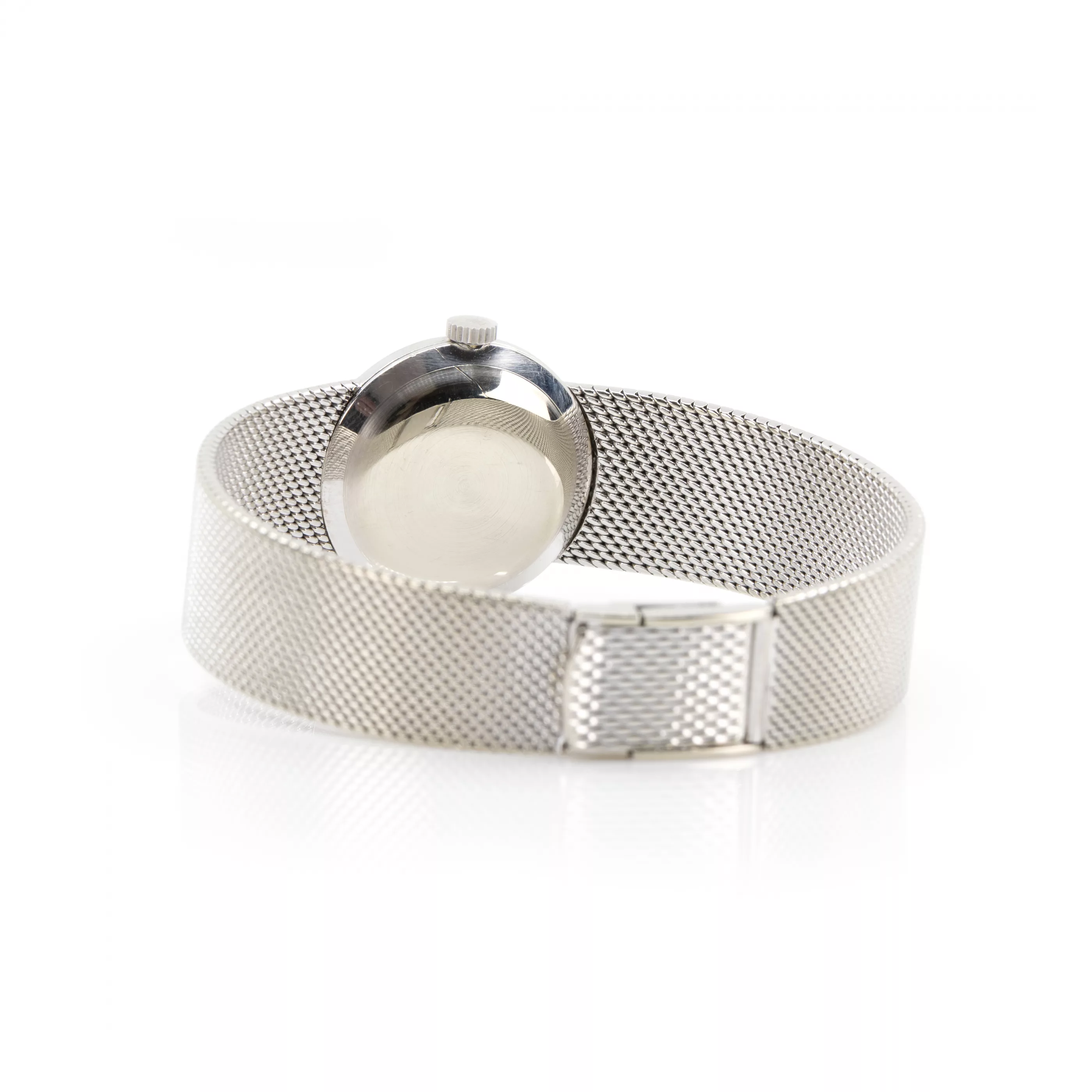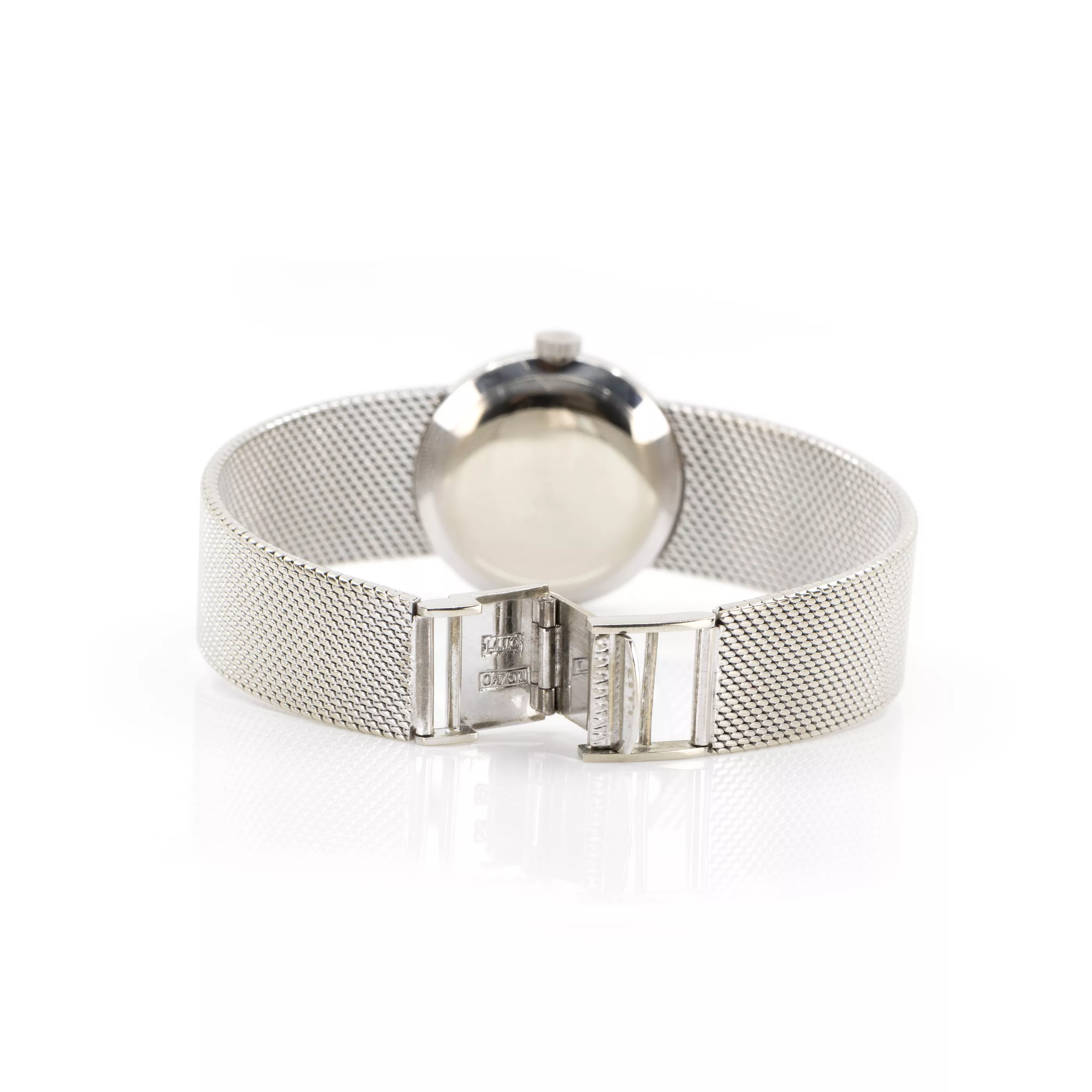 1970/1980s, manual winding, internally numbered 65050, case 750 white gold, internally hallmarked, bezel with 32 octagonal-cut diamonds, total approx. 0.64 ct, diameter 22 mm, original Milanese bracelet, 750 white gold, original clasp, 750 white gold, hallmarked, length 16.5 cm, total weight approx. 41.6 g, function tested, working, condition good, without original box or papers