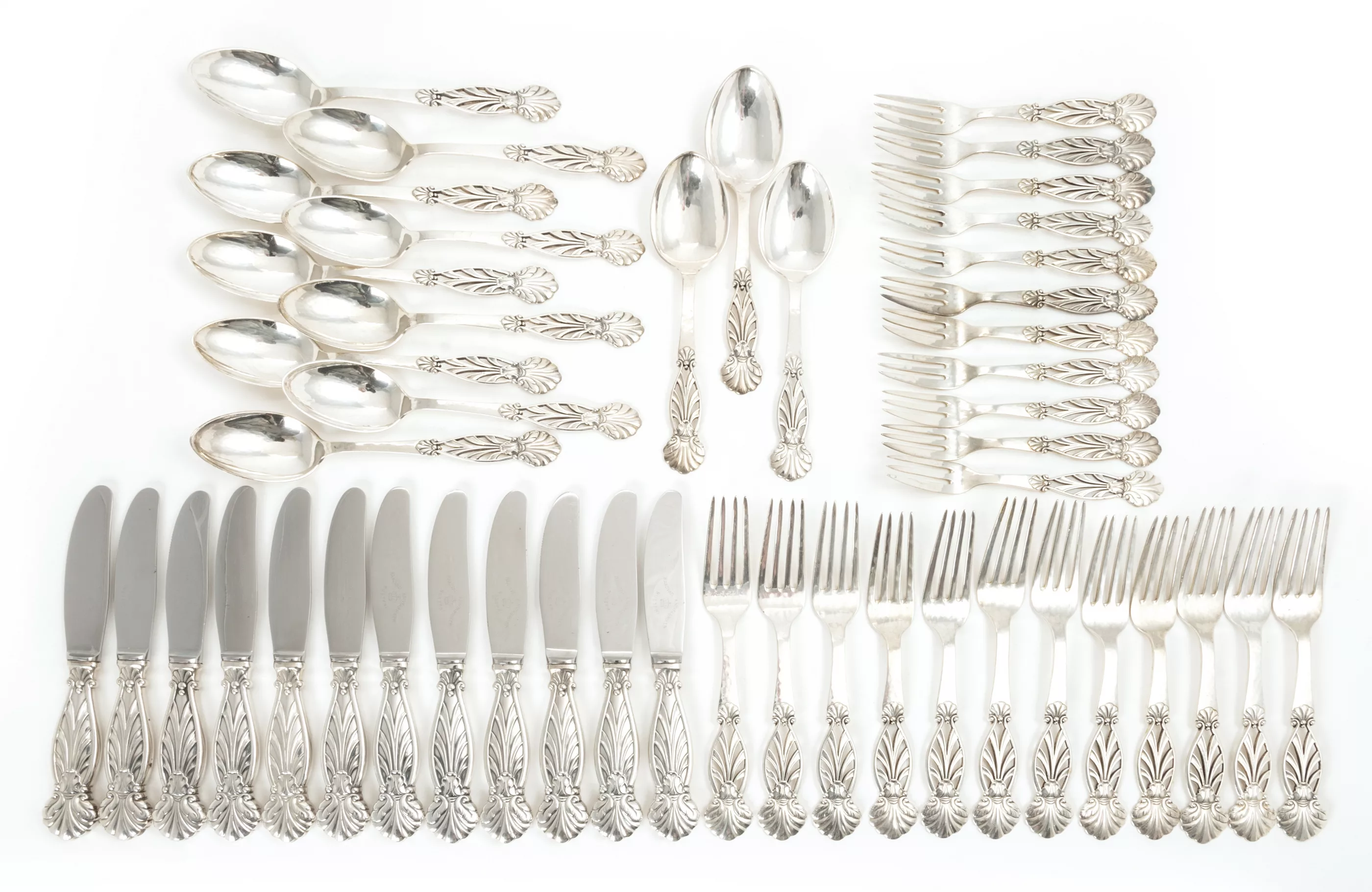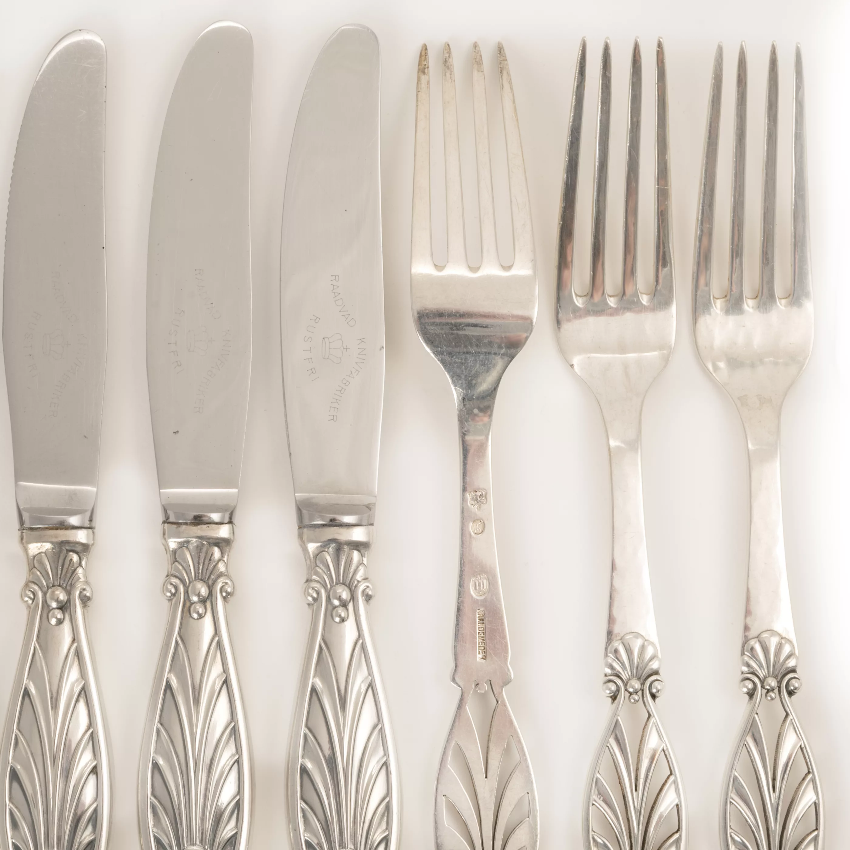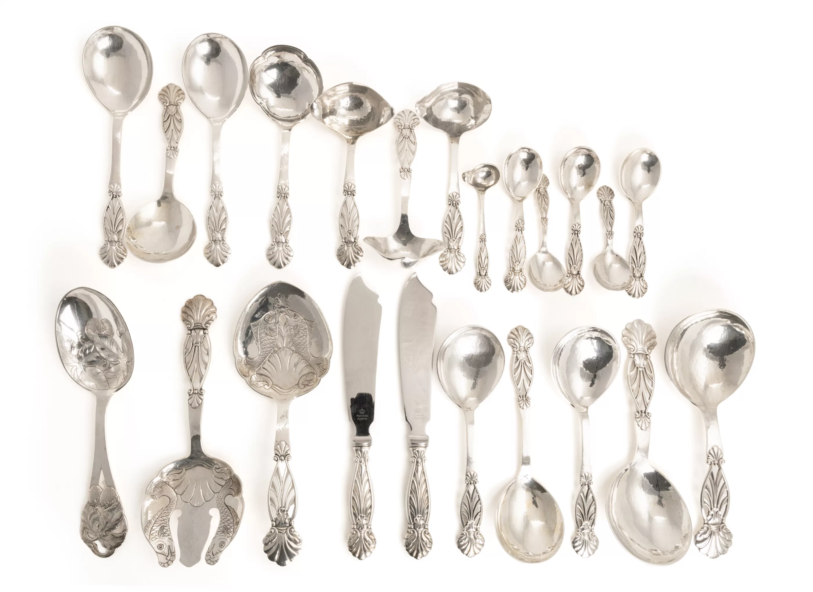 107-tlg., 1929-1963, 826/830 und 925 Silber, punziert, Manufakturmarke und Stadtmarke, zum Teil Firmenmarke Hansen und Andersen, Kopenhagen, 1937-1947, partiell verso monogrammiert, 12 Speisegabeln, 12 Speisemesser, 5 Speiselöffel, 12 Vorspeiselöffel, 12 Kuchengabeln, 11 Kaffeelöffel, 2 Tranchiermesser, 1 Obstsalatlöffel mit Erdbeerdekor, 4 Sahnelöffel, 2 Kuchenheber, 2 Fischvorlegebesteckteile, 9 Vorlegelöffel, 4 Suppenkellen, 1 Flaschenöffner, 4 kleine (Fisch-)Gabeln, 2 kleine Löffel, dazu 12 Fischmesser von Johan Axel Prip, Kopenhagen, nach 1930, Gesamtgewicht (ohne Messer und Flaschenöffner) ca. 3.792,6 g