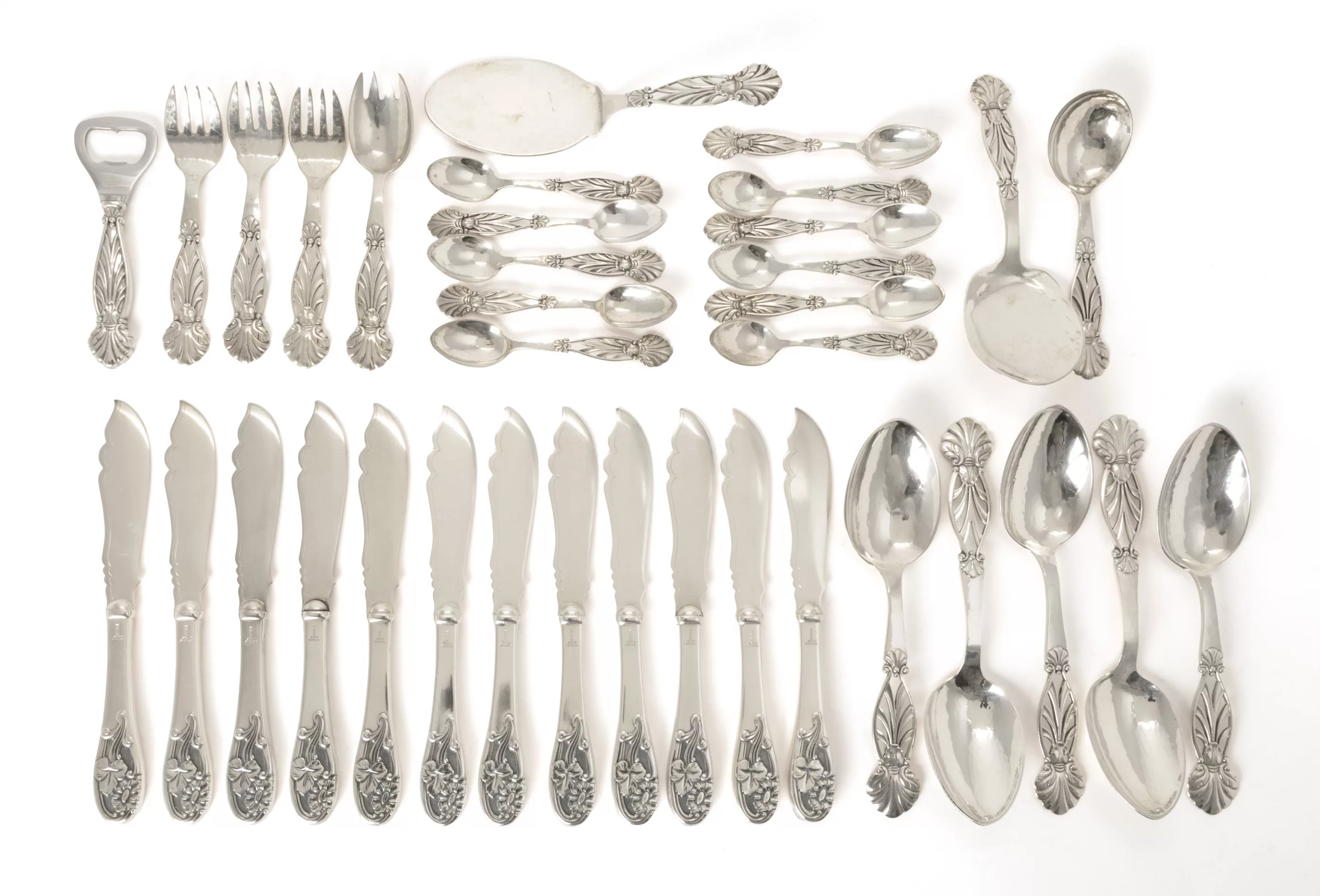 107-pcs, 1929-1963, 826/830 and 925 silver, hallmarked, manufacturer's mark and city mark, partly company mark Hansen and Andersen, Copenhagen, 1937-1947, partially monogrammed on verso, 12 dinner forks, 12 dinner knives, 5 dinner spoons, 12 starter spoons, 12 cake forks, 11 coffee spoons, 2 carving knives, 1 fruit salad spoon with strawberry decoration, 4 cream spoons, 2 cake servers, 2 fish serving utensils, 9 serving spoons, 4 soup ladles, 1 bottle opener, 4 small (fish) forks, 2 small spoons, plus 12 fish knives by Johan Axel Prip, Copenhagen, after 1930, total weight (excluding knives and bottle opener) approx. 3.792,6 g