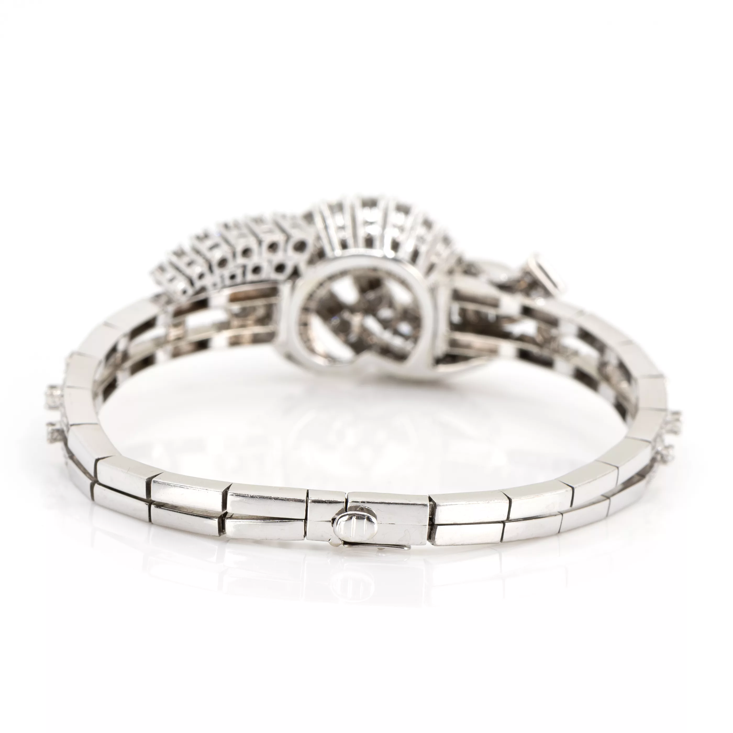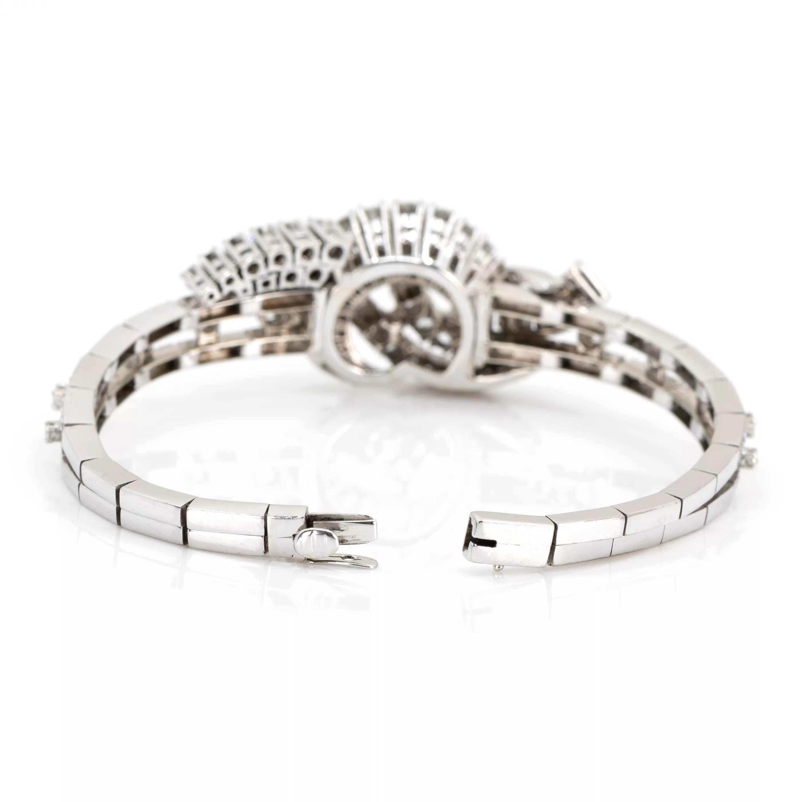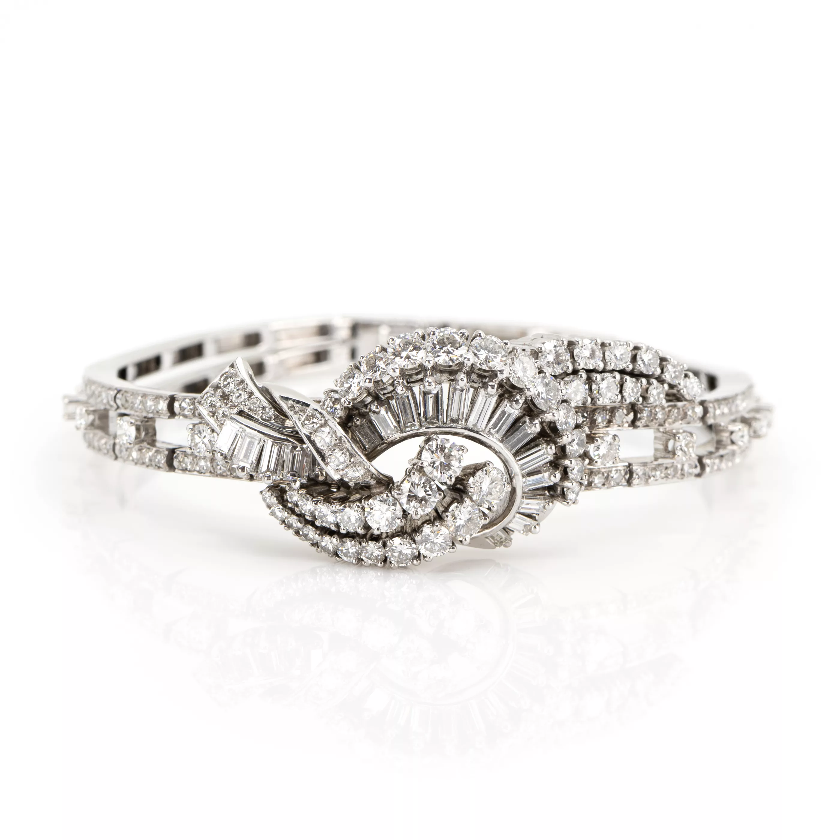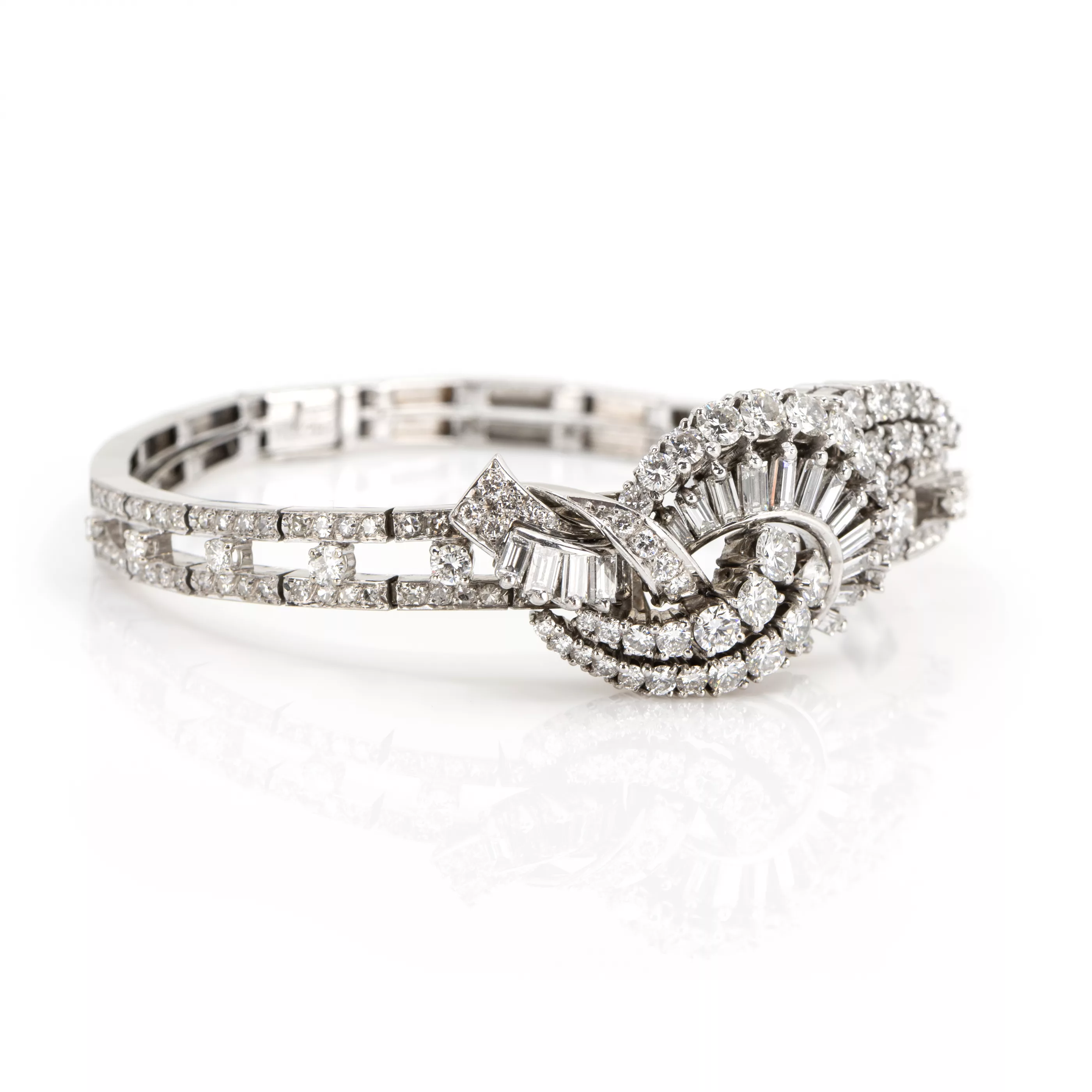750 white gold, hallmarked, 118 brilliant- and octagonal-cut diamonds, total approx. 5.55 ct, 18 baguette-cut diamonds, total approx. 1.50 ct, total approx. 7.05 ct, G, vvs-vs, length 17.5 cm, width 2 cm, weight approx. 38.6 g