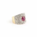 750 Gelbgold, punziert, 60 Diamanten im Brillantschliff, gesamt ca. 0,66 ct, H, vs-si, oval facettierter Rubin, ca. 0,75 ct, Ringdurchmesser 18 mm, Gewicht ca. 9,2 g