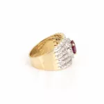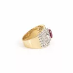 Damenring mit Brillant-Rubinbesatz750 Gelbgold, punziert, 60 Diamanten im Brillantschliff, gesamt ca. 0,66 ct, H, vs-si, oval facettierter...