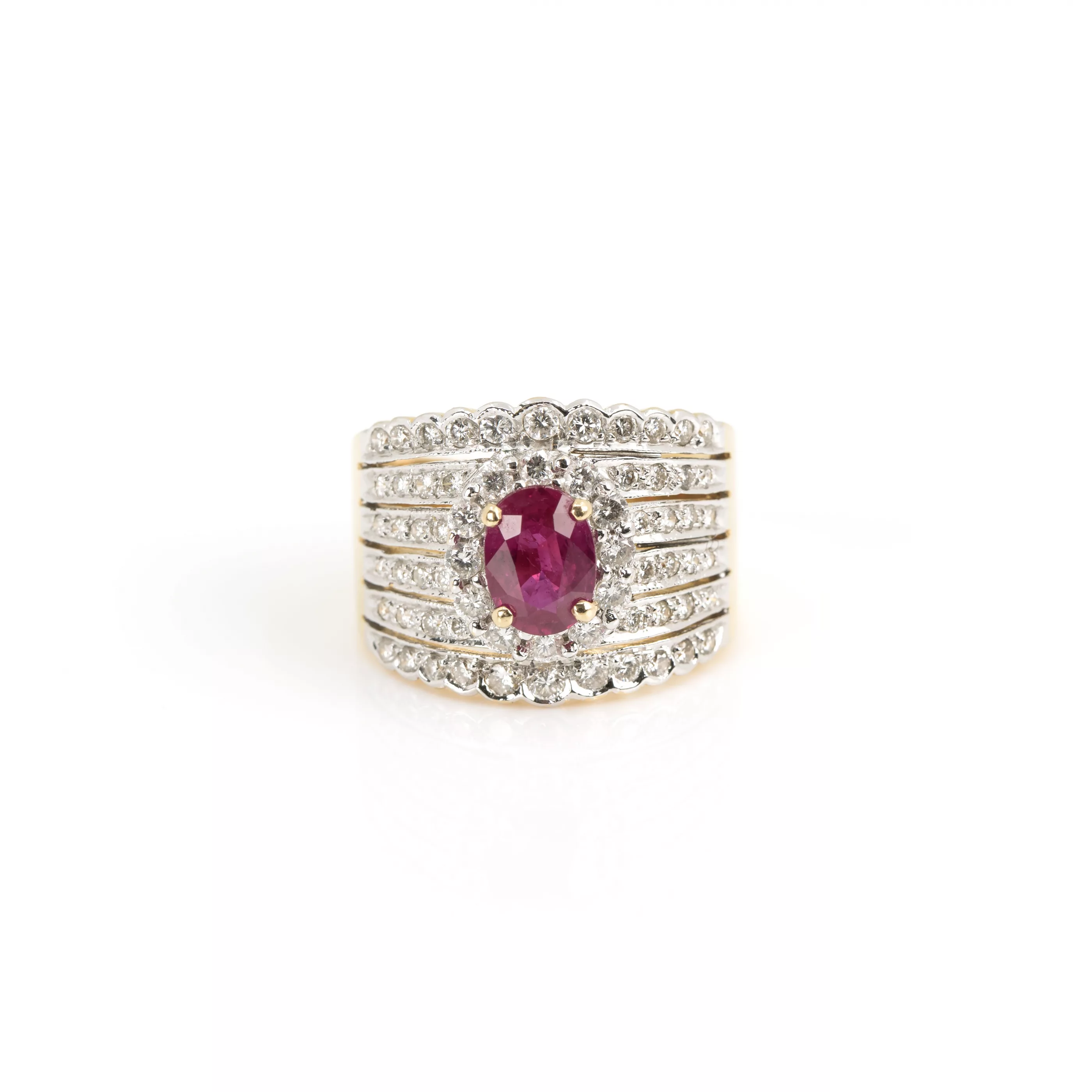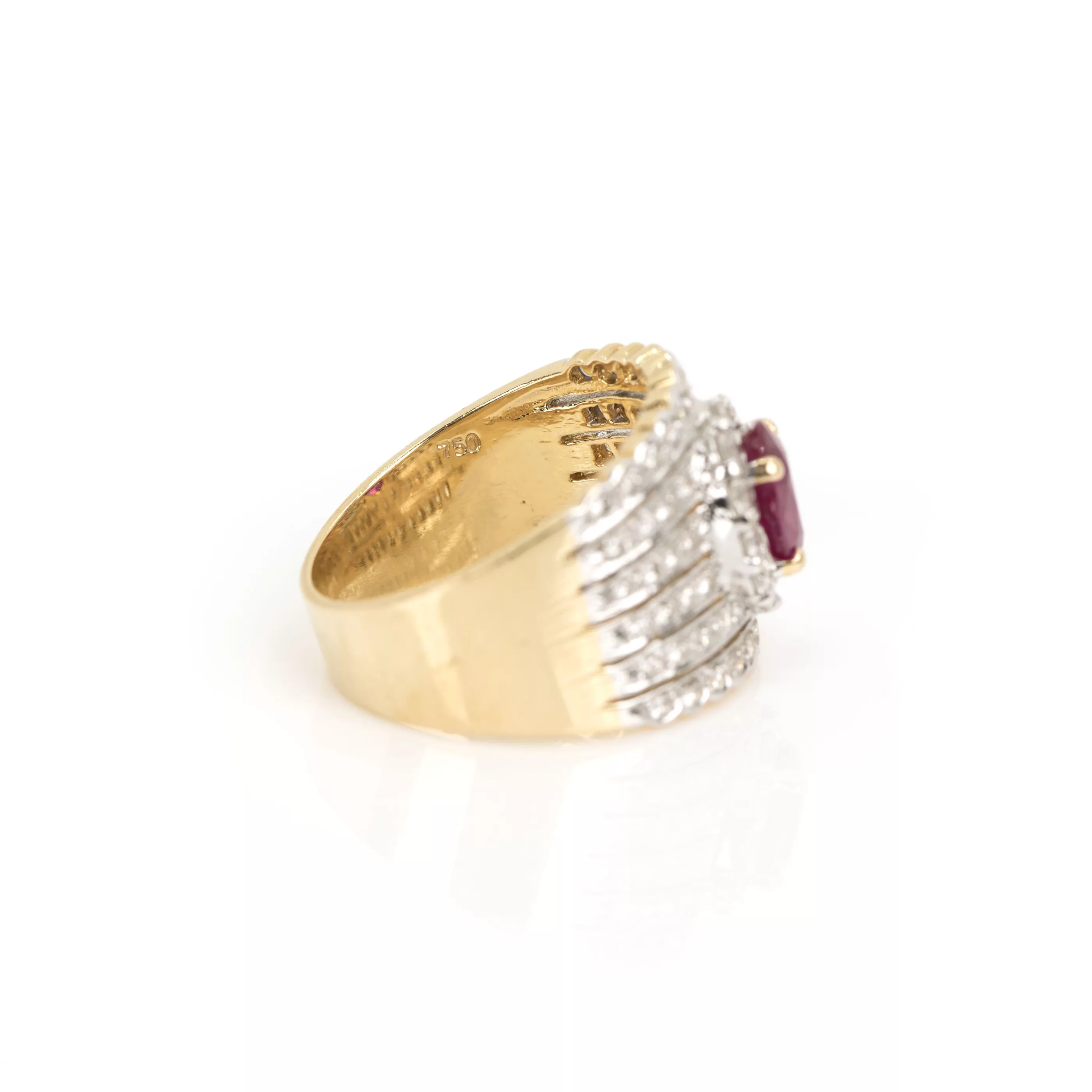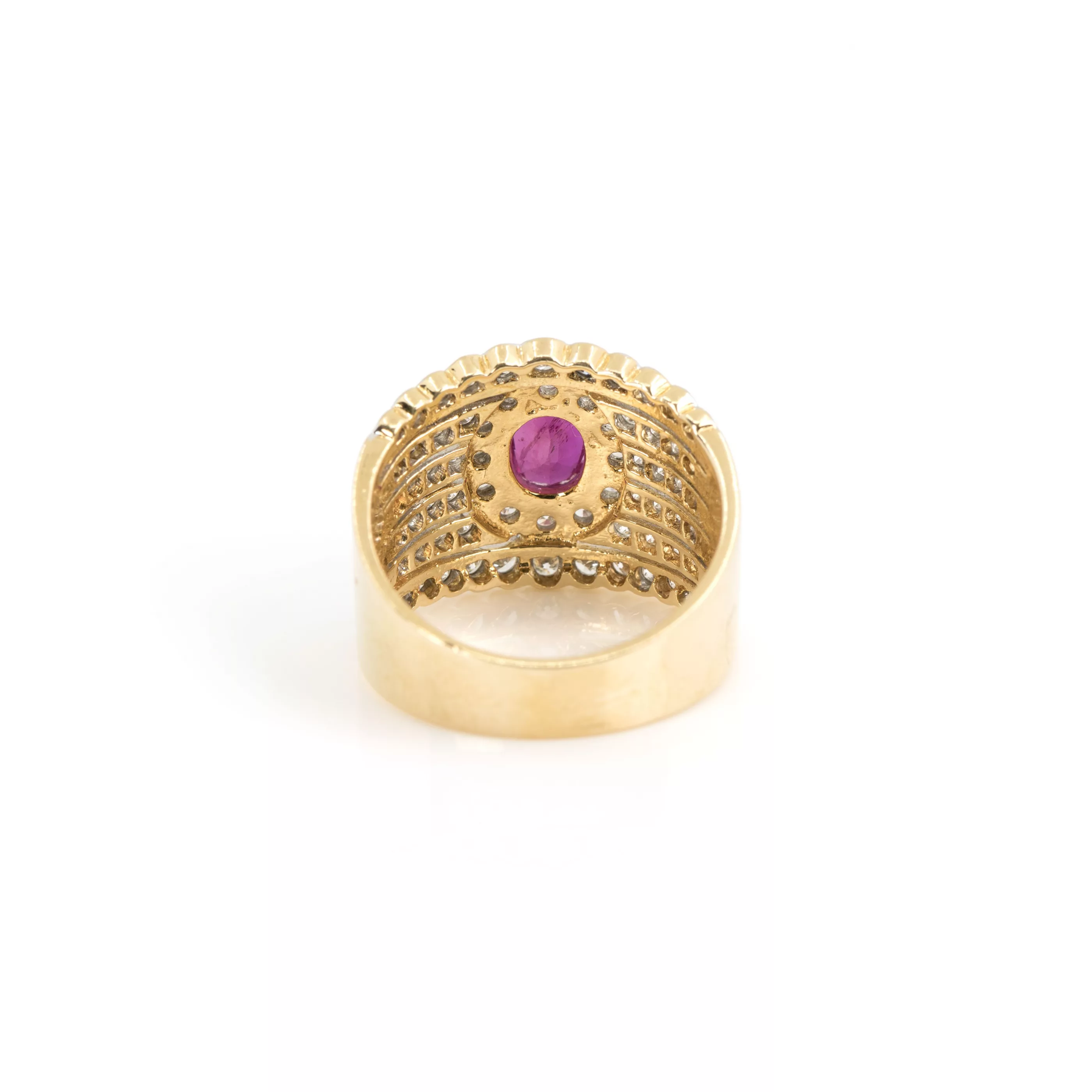 750 Gelbgold, punziert, 60 Diamanten im Brillantschliff, gesamt ca. 0,66 ct, H, vs-si, oval facettierter Rubin, ca. 0,75 ct, Ringdurchmesser 18 mm, Gewicht ca. 9,2 g
