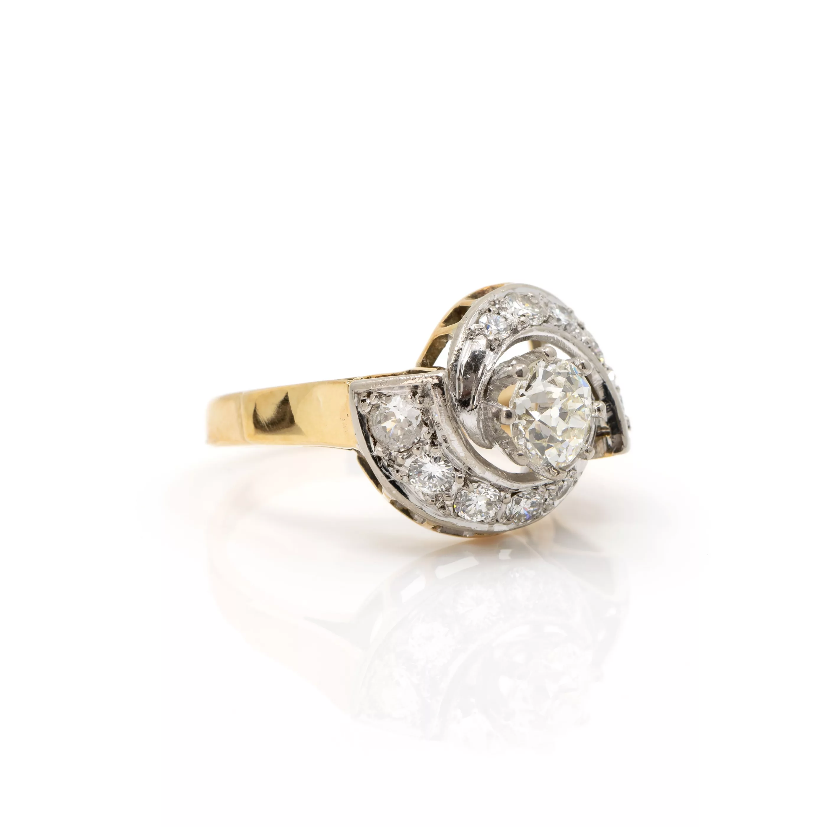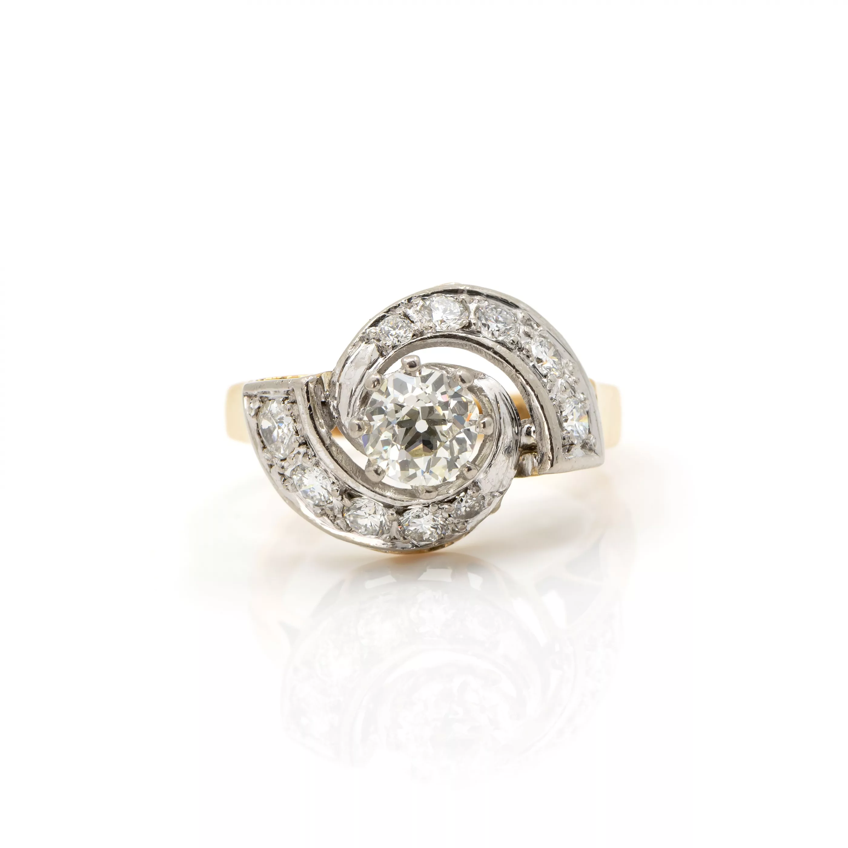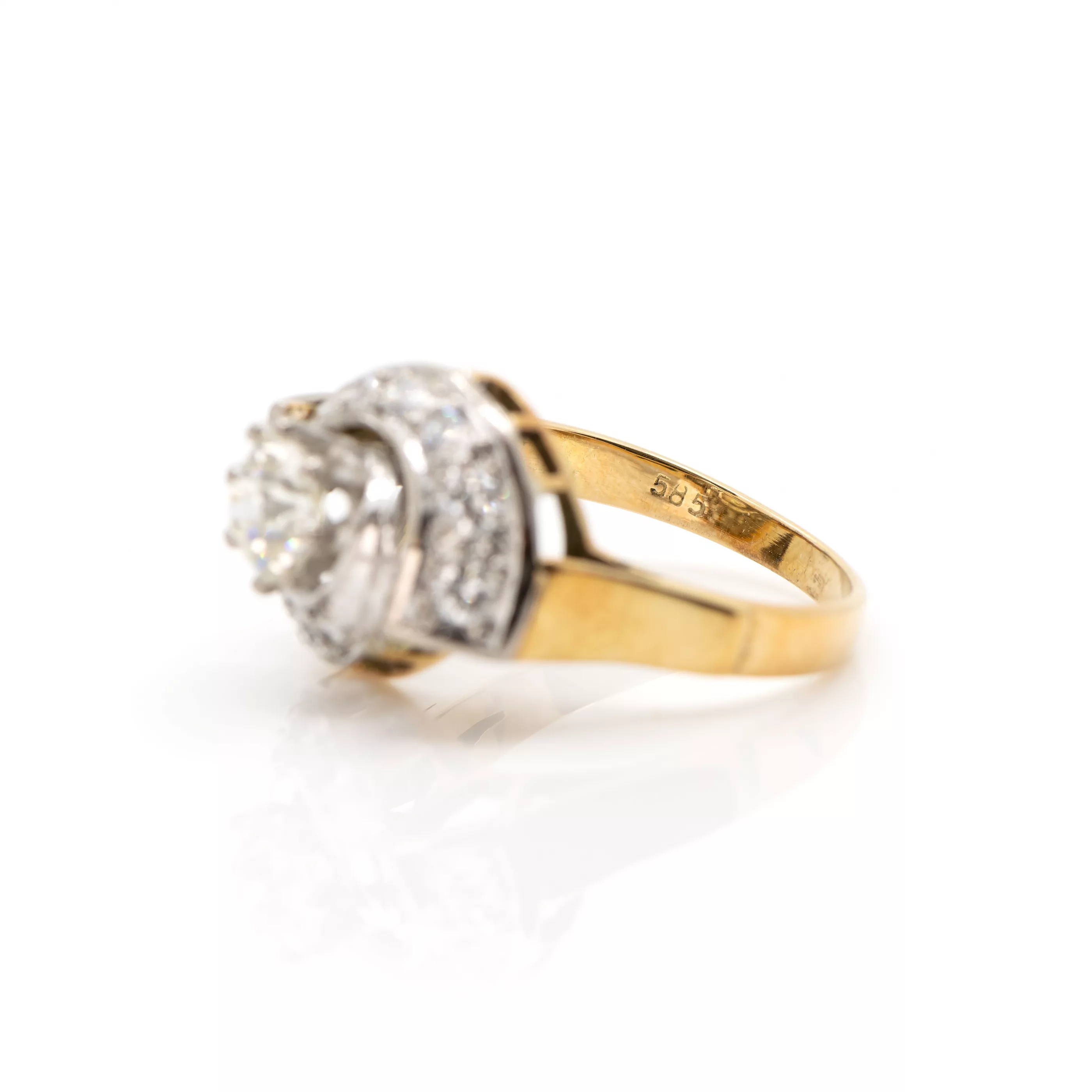 585 Weißgold, punziert, zentraler Diamant im Brillantschliff, ca. 1,00 ct, die übrigen Diamanten im Brillantschliff gesamt ca. 0,60 ct, K-L, si, Ringdurchmesser 18,5 mm, Gewicht ca. 6,3 g