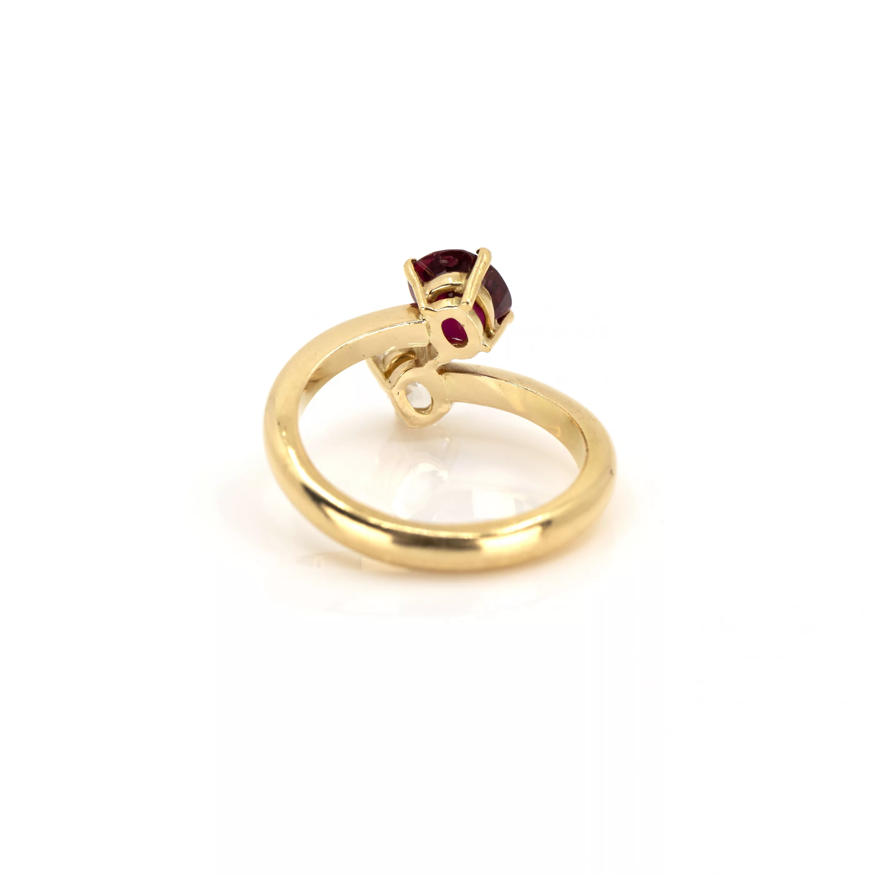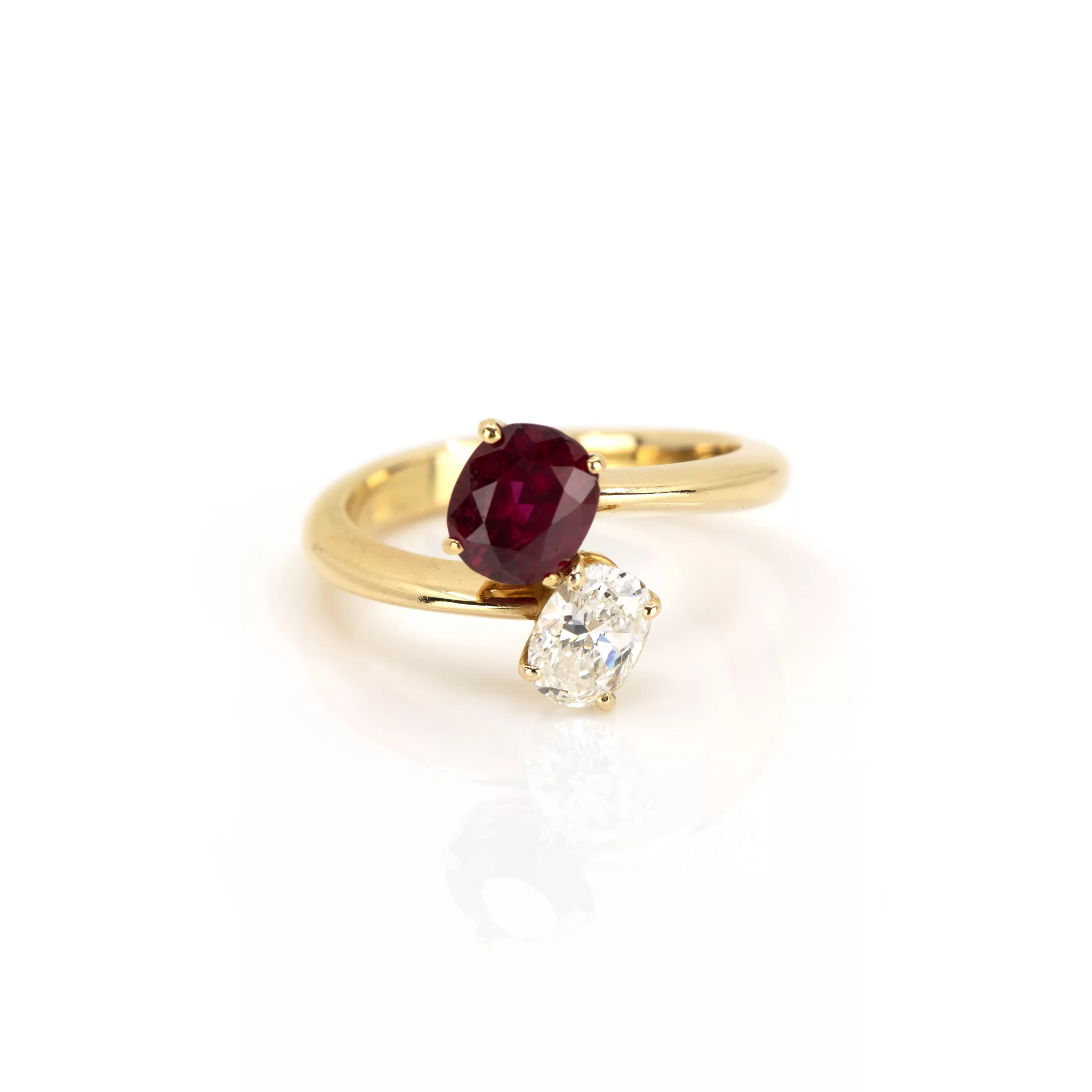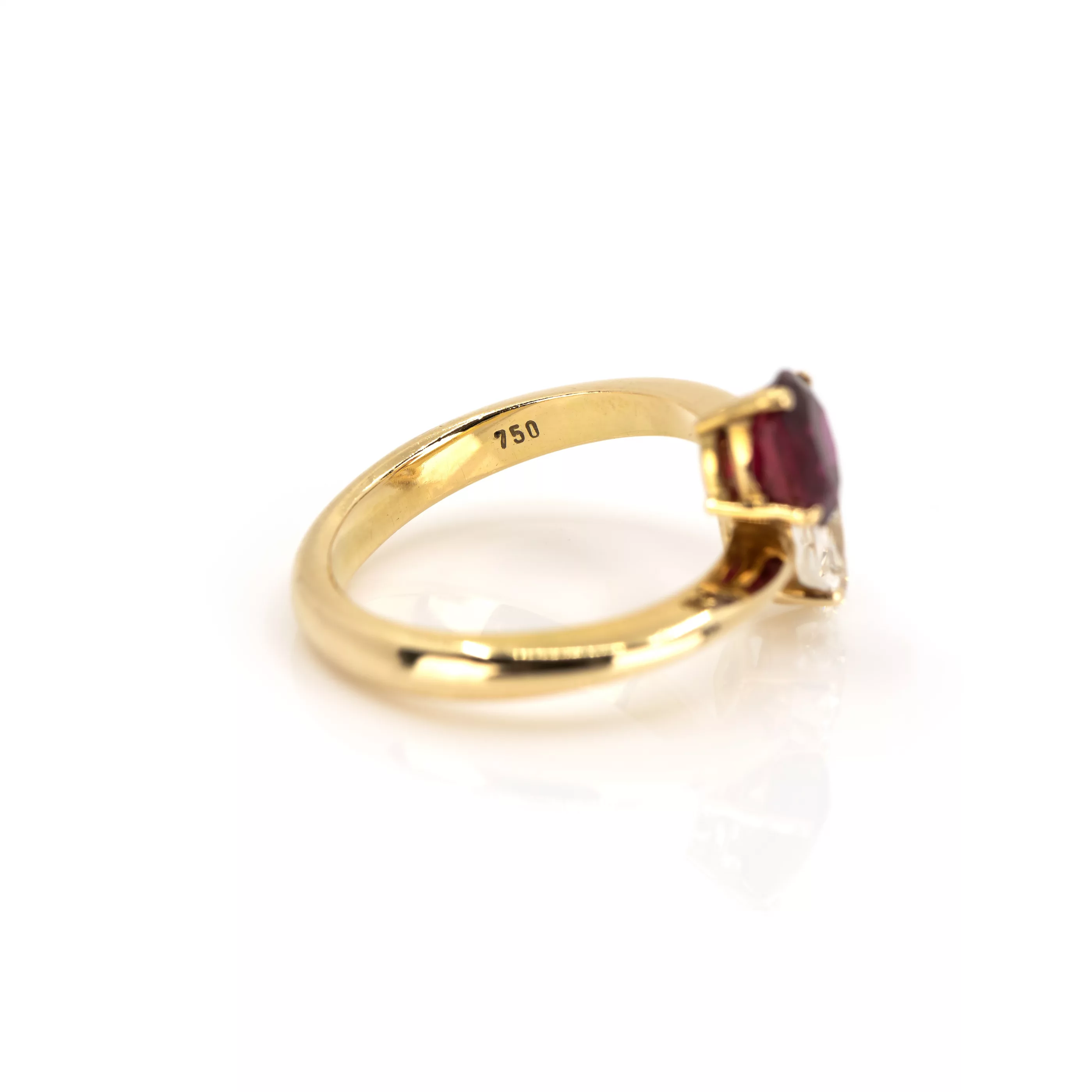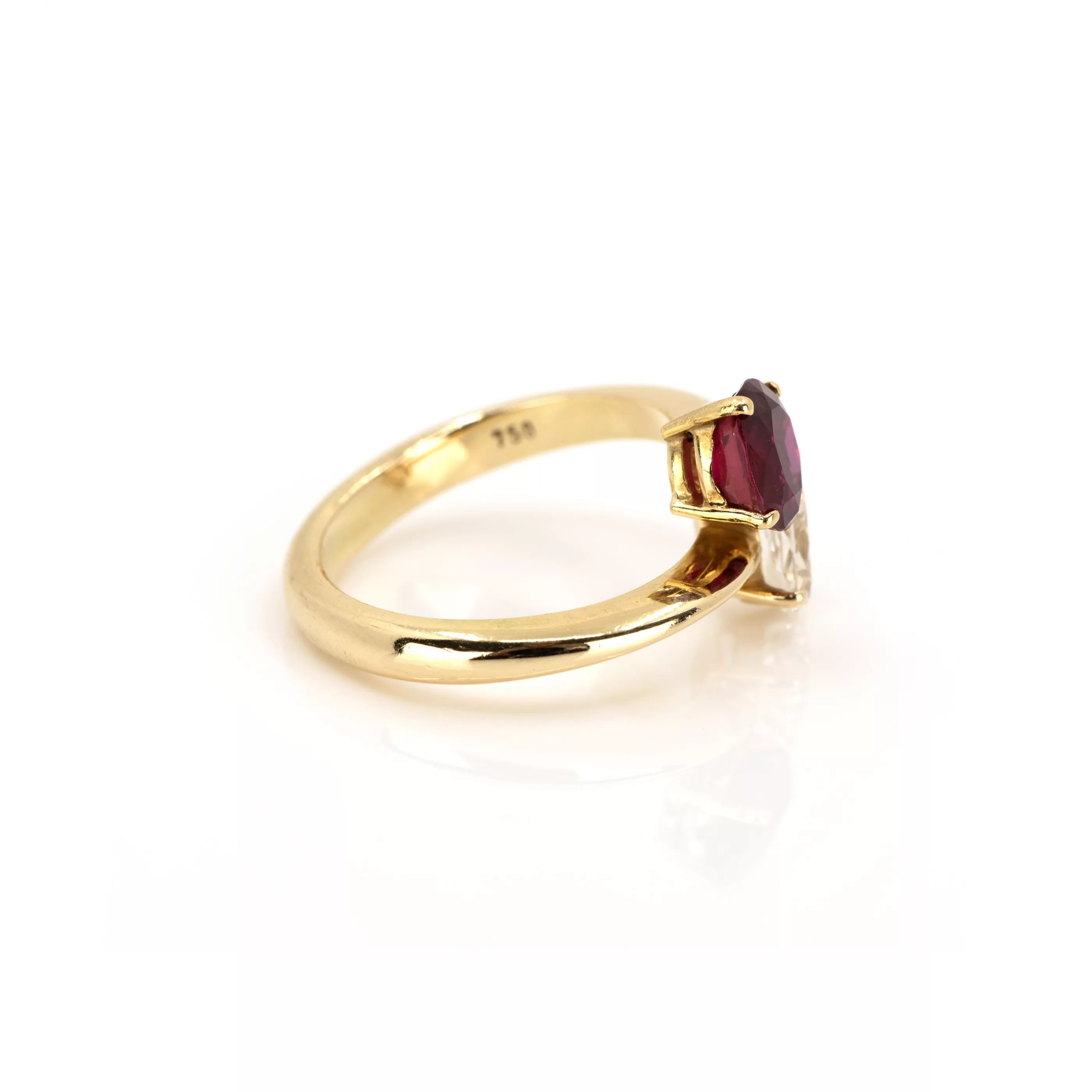 Damenring mit Rubin-Diamantbesatz750 Gelbgold, punziert, Diamant im Ovalschliff, ca. 0,50 ct, H, vs, oval facettierter Rubin, ca. 1,00 ct,...