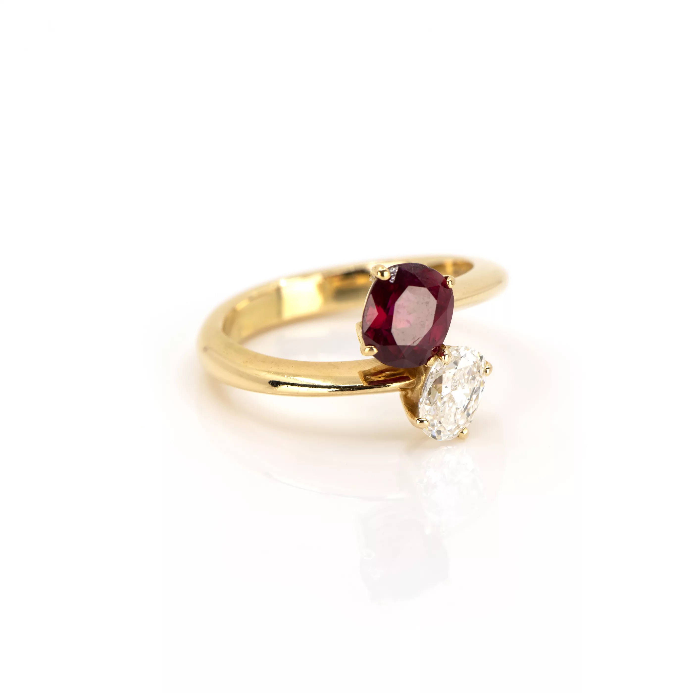 750 yellow gold, hallmarked, oval cut diamond, approx. 0.50 ct, H, vs, oval faceted ruby, approx. 1.00 ct, ring diameter 17.5 mm, weight approx. 6 g