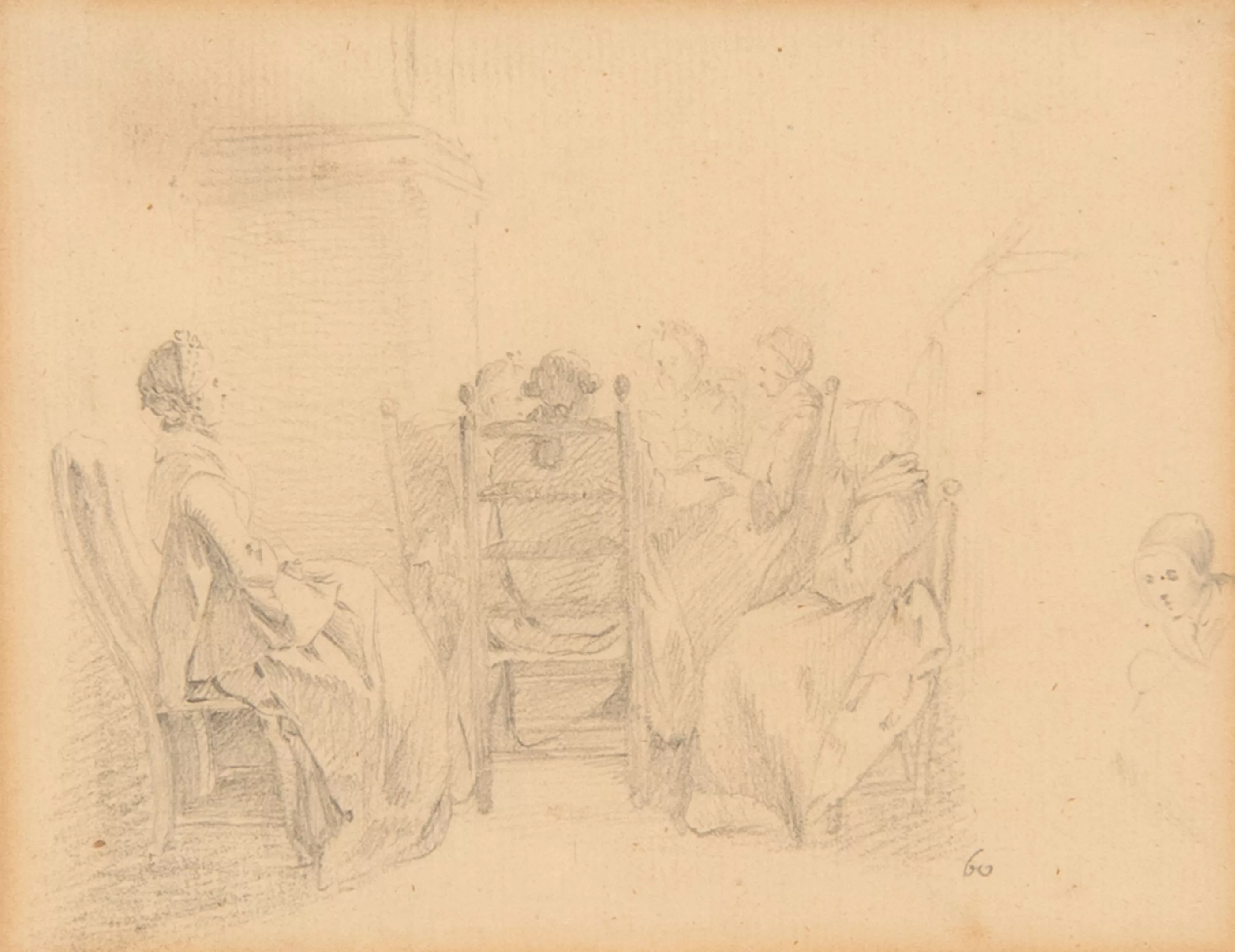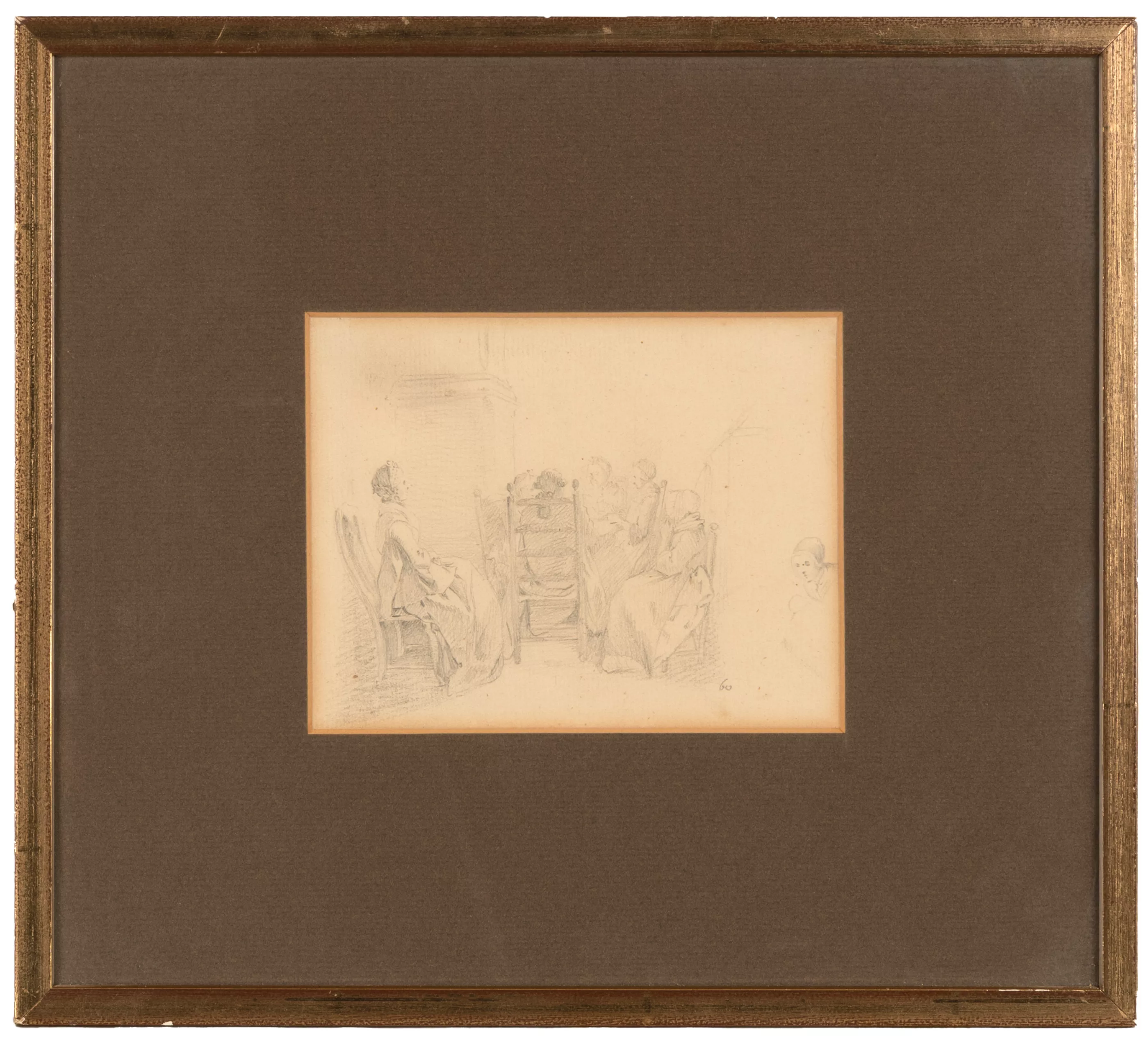 Studie einer Gesellschaft, Bleistift auf Papier, 11,3 cm x 14,5 cm Blattmaß, Papier leicht gebräunt, partiell fleckig