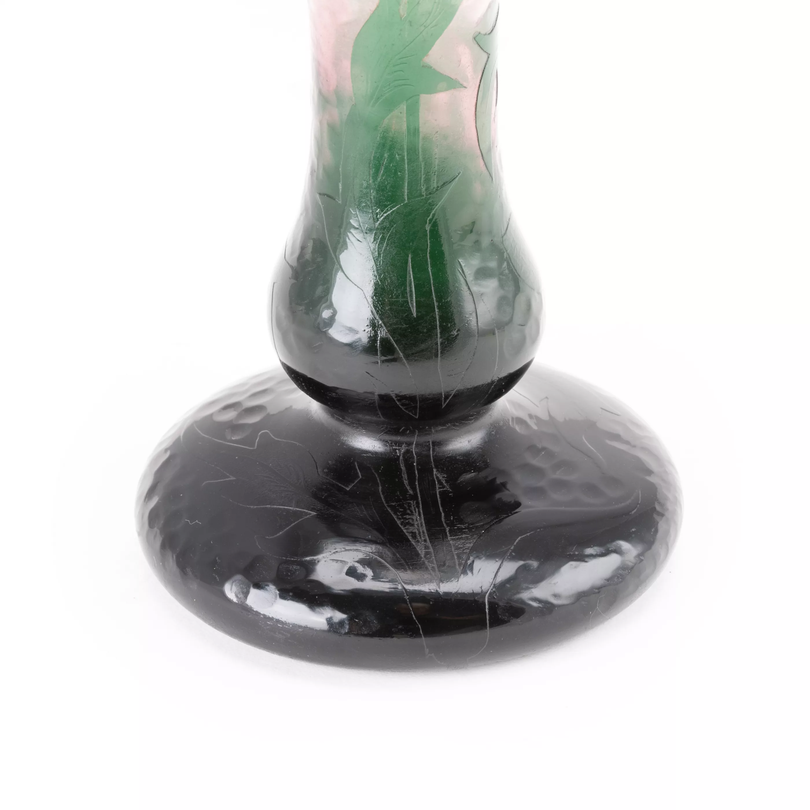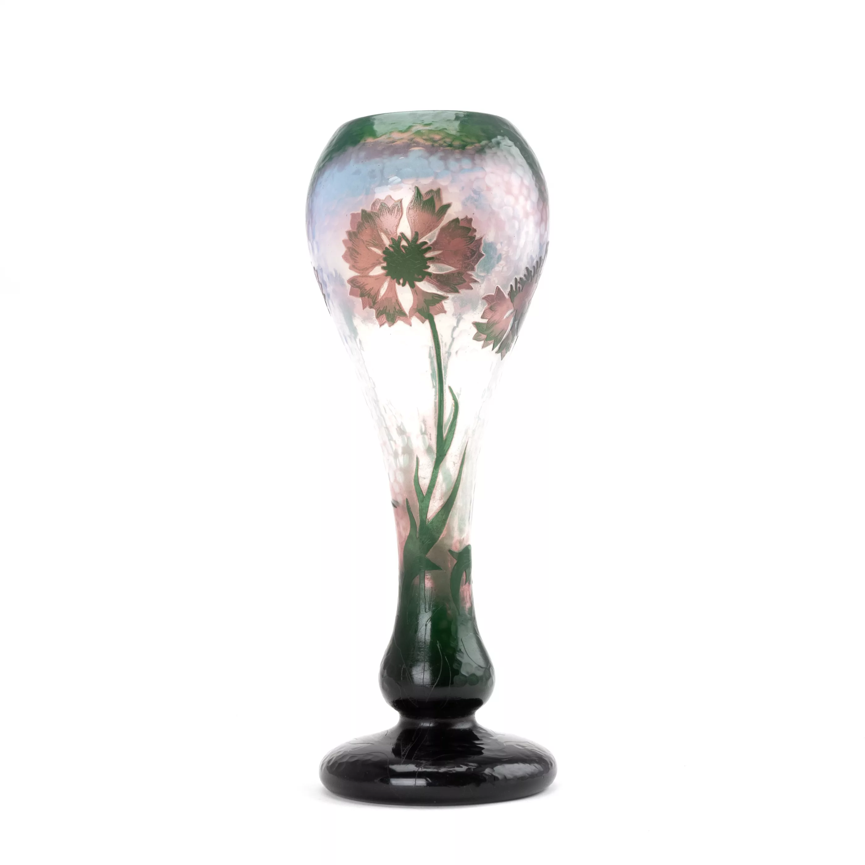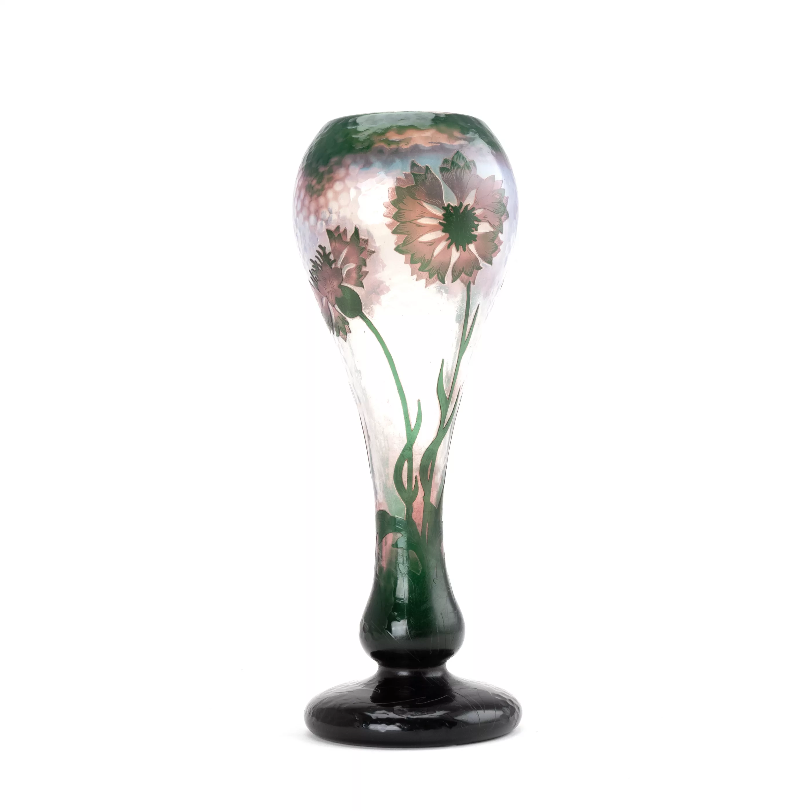 Daum Frères, Nancy, c. 1910, cameo vase of wheel-cut Martelé glass, flashed glass with cornflowers, leaves and stems against an opalescent pink and green background in hammered decoration, height 30 cm, incised signature Daum Nancy and Lorraine Cross on the underside, minimal scratches and rubbing in places.