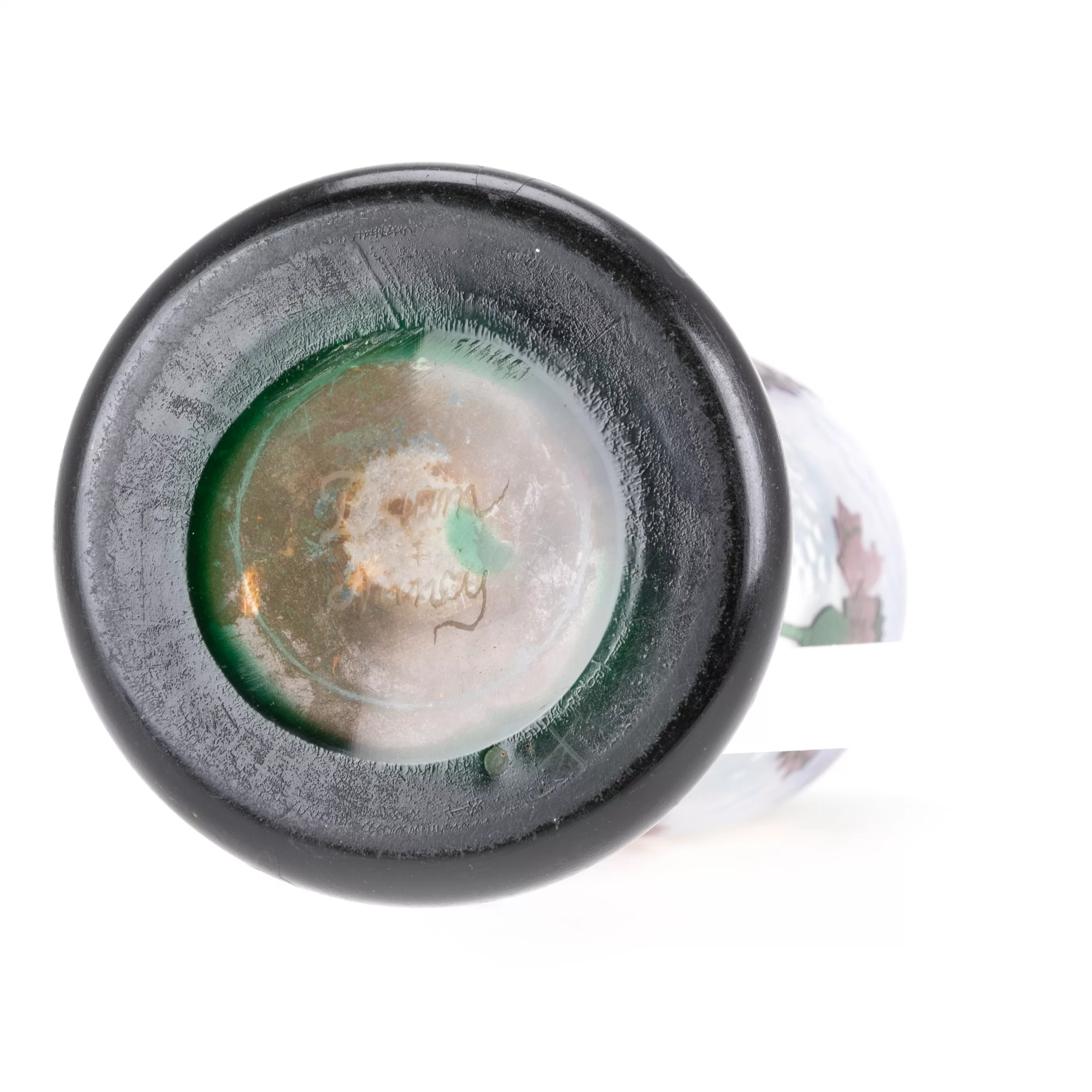 Daum Frères, Nancy, um 1910, Kamee-Vase aus Martelé-Glas mit Radschliff, Überfangglas mit Kornblumen, Blättern und Stängeln vor einem...
