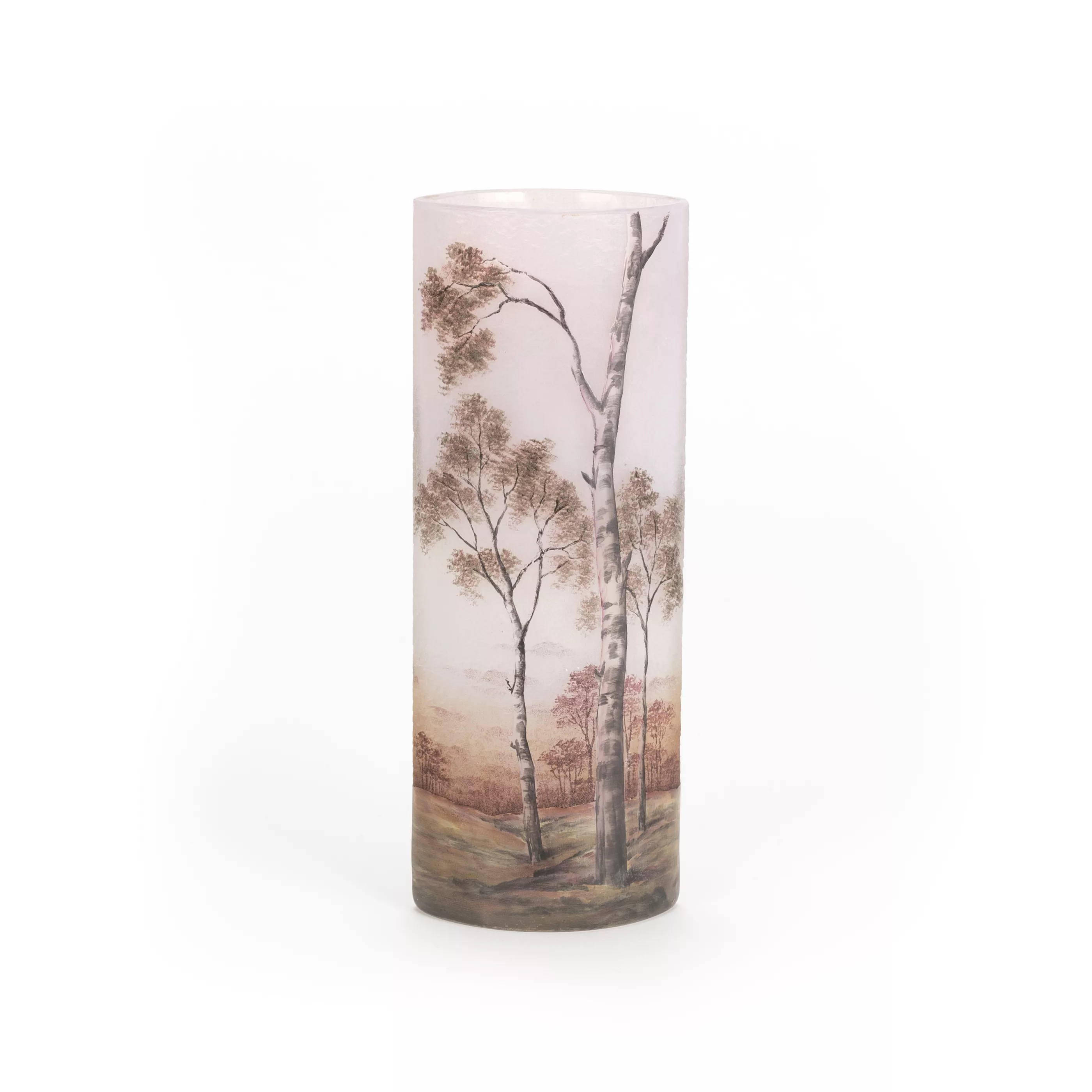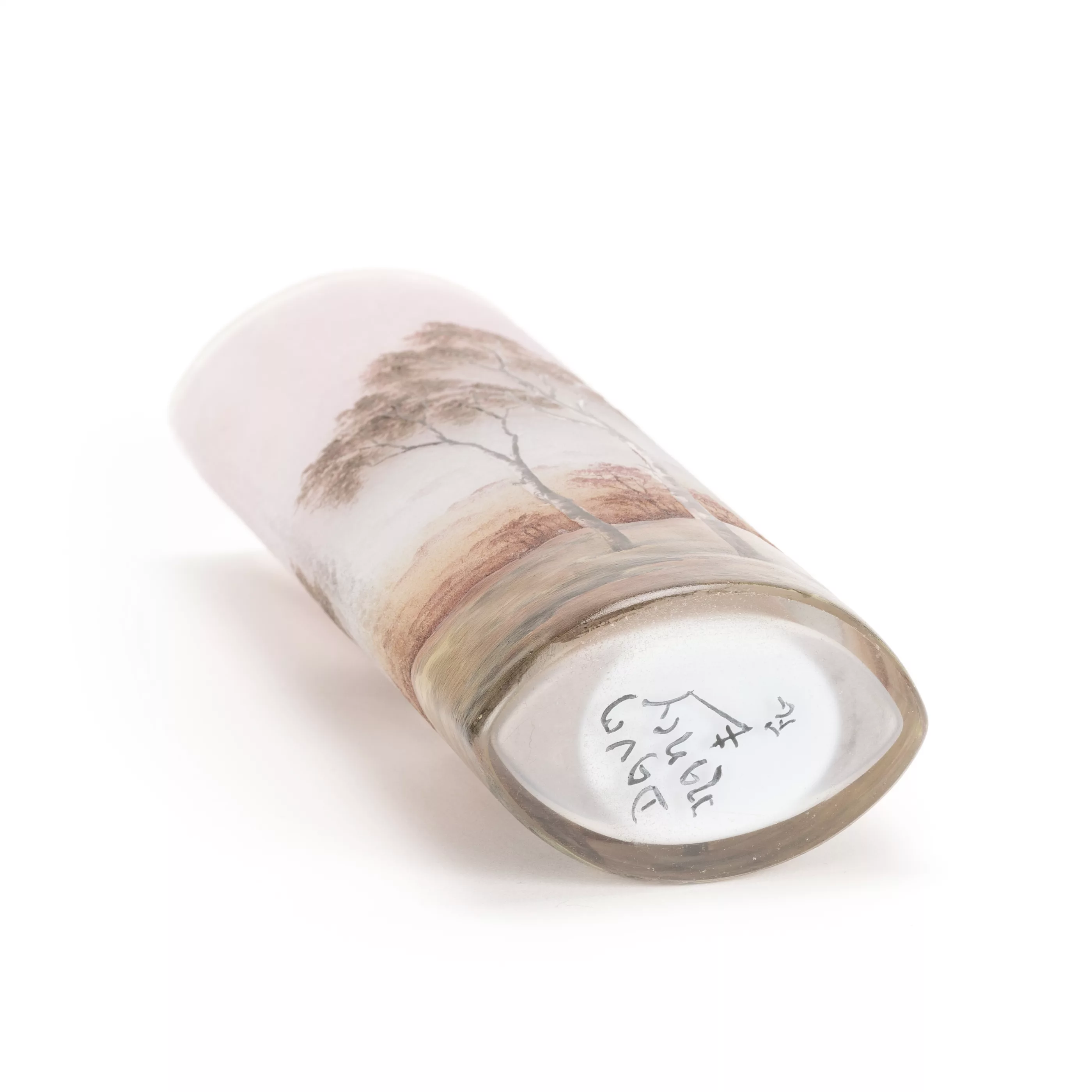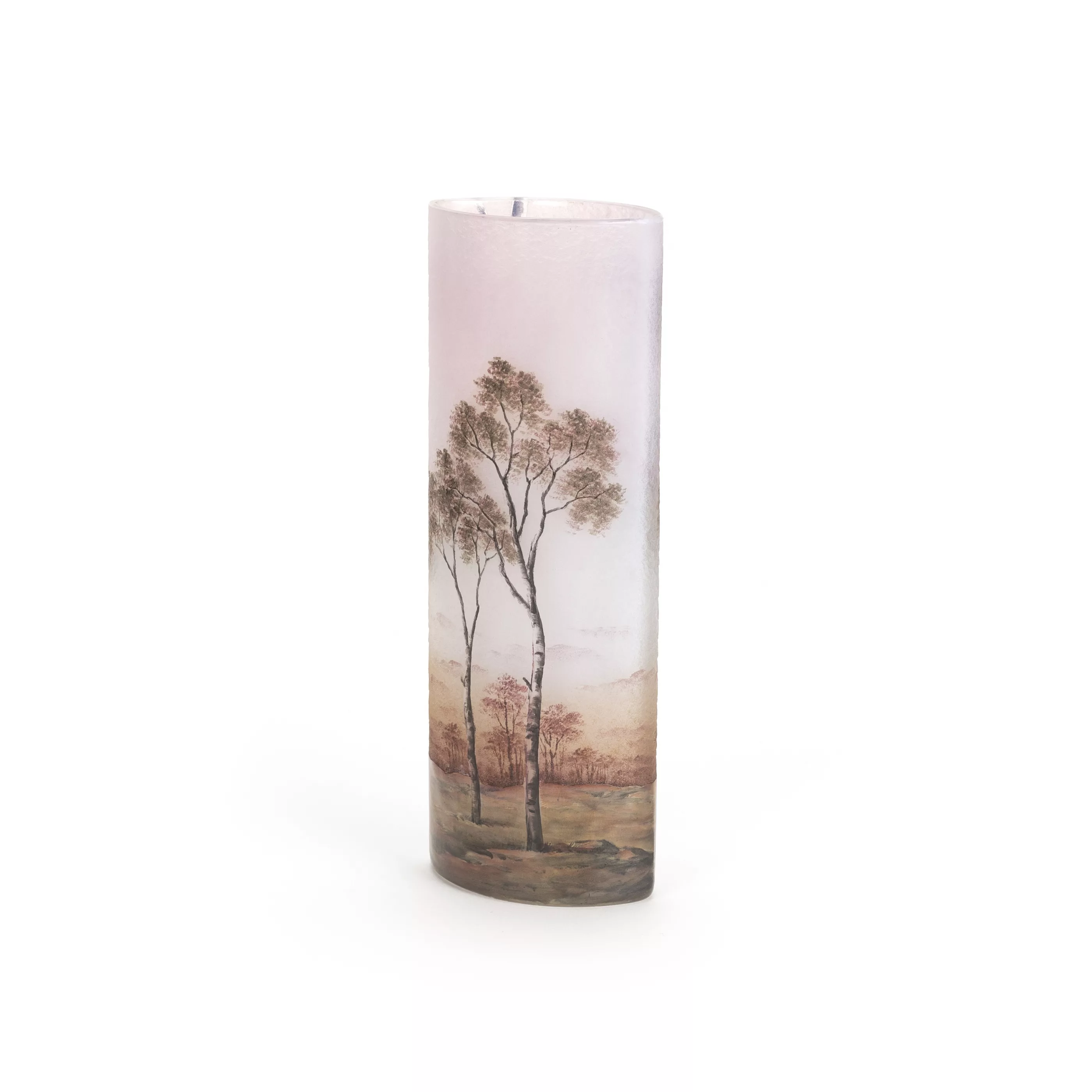 'Daum Frères Nancy, France, early 20th century, of straight form on an oval stand, cased glass, clear and milk white, slightly pink, etched, heightened with black solder and polychrome enameled decoration with a landscape of trees in the dawn, height 17 cm, signed Daum, Nancy, Lorraine cross, FG, tiny chip on the underside