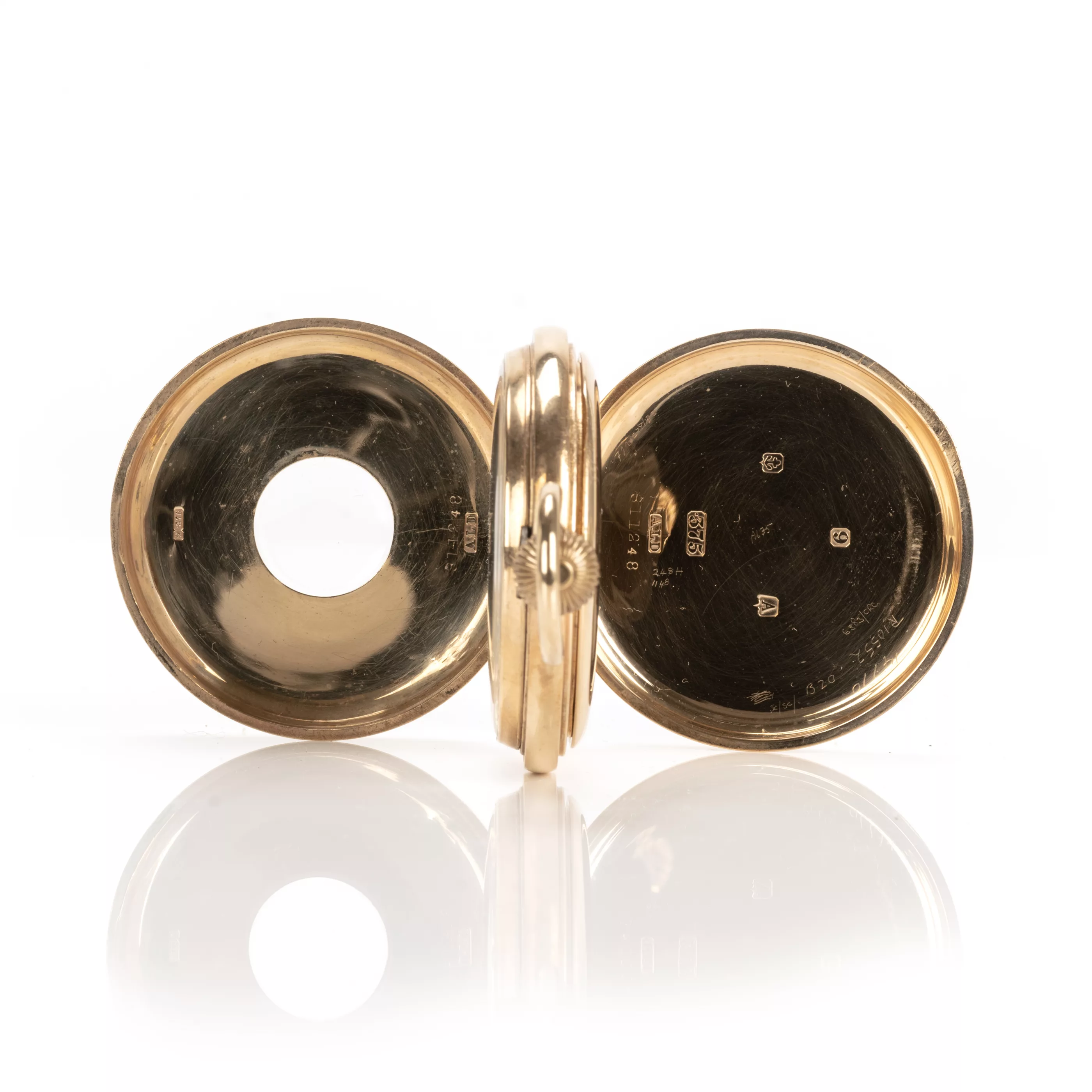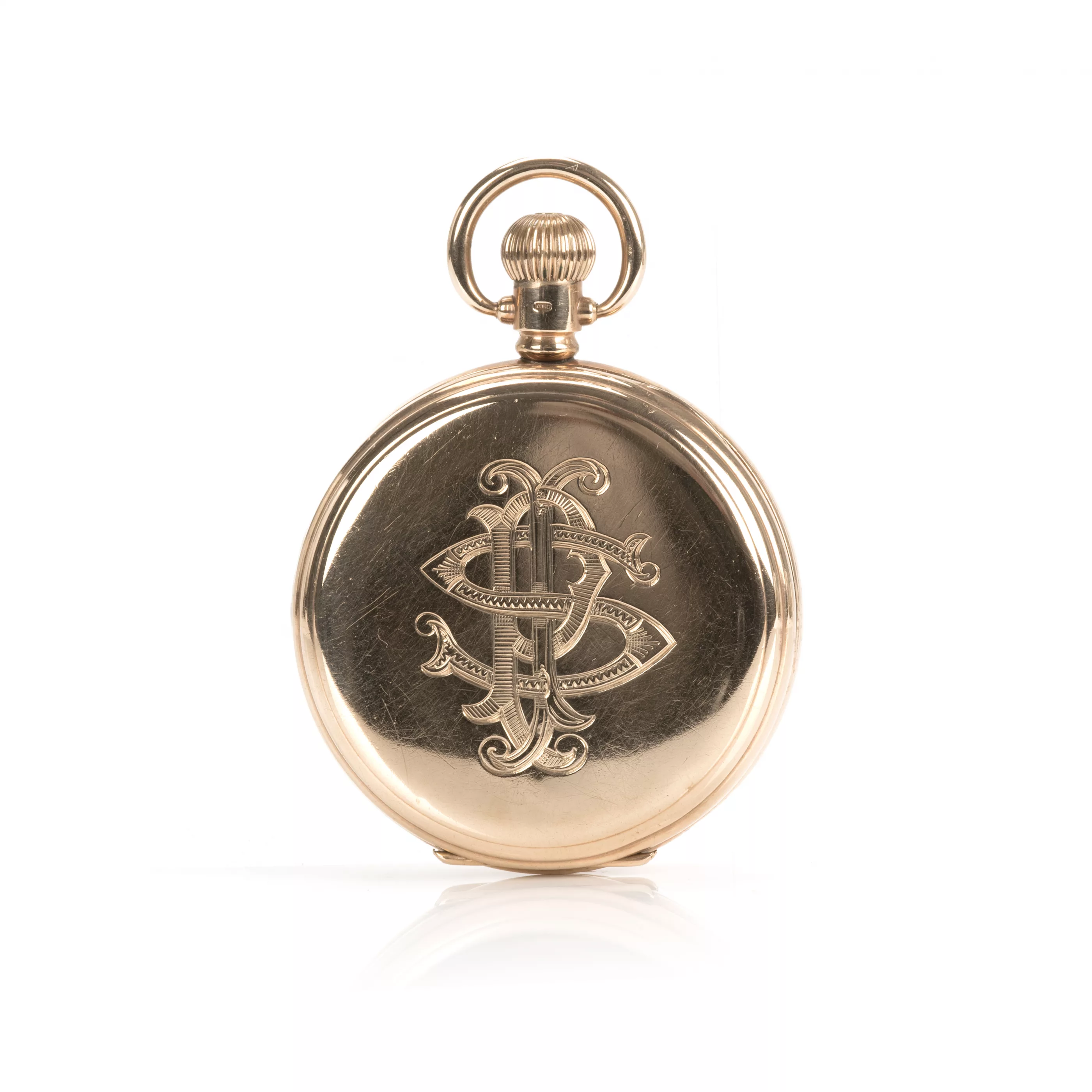 American pocket watch with Swiss movement, crown winding, enamelled dial with roman numerals, small second with arabic numerals, case no. 311248 | movement no. 811248 | ref. no. 998, case 375 red gold, hallmarked, inner cover 375 red gold, hallmarked, diameter 52 mm, total weight approx. 109.0 g, functional, tested, condition good, case SP monogrammed, dial with cracks, wear to outer numerals, partial dents and scratches to case, condition and functionality tested by our master watchmaker, note: The buyer's premium is 25% incl. VAT. For the use of the online bidding consoles there is an additional fee of 3% plus VAT (3.57%).