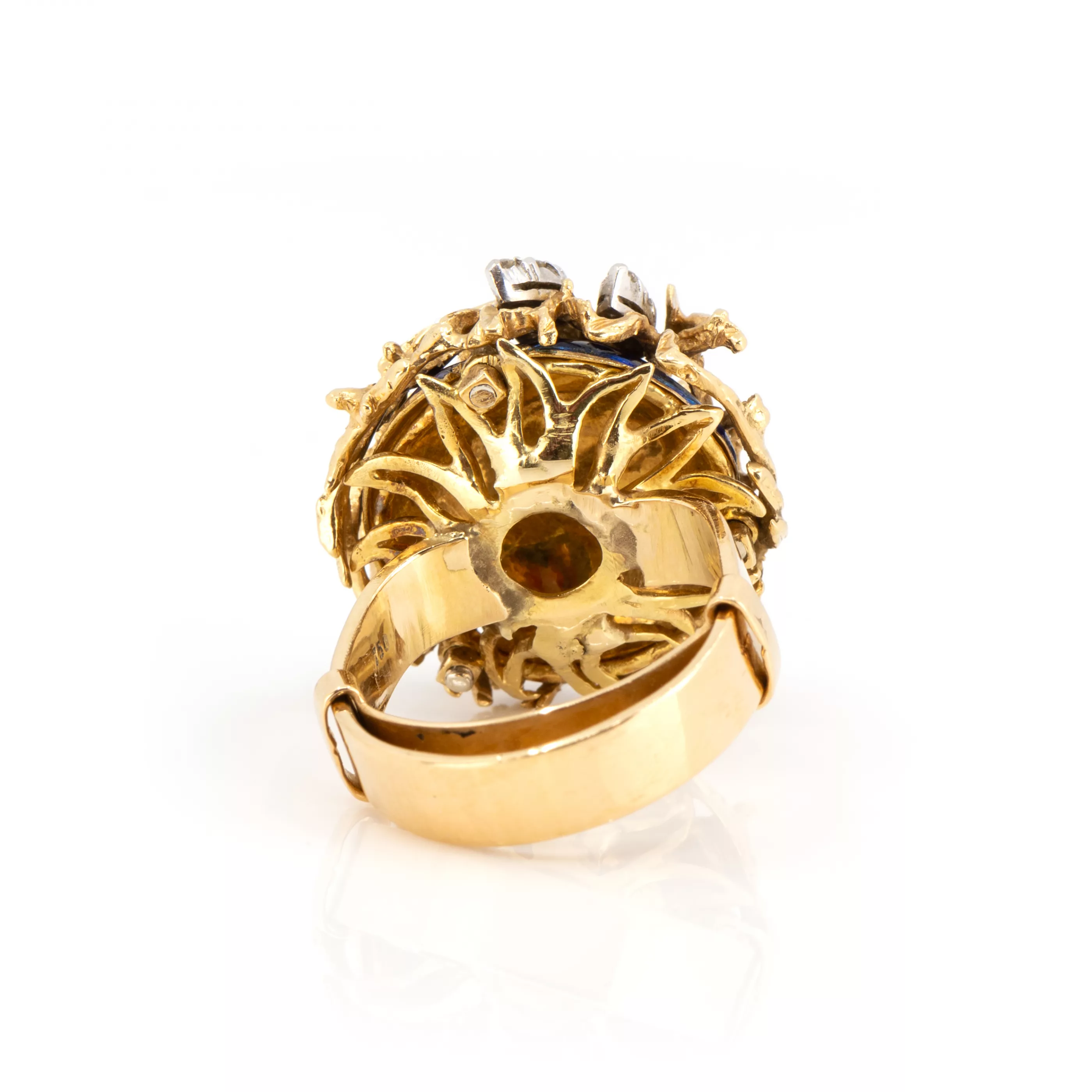 750 yellow gold, hallmarked, above a blue enamel hemisphere 20 brilliant-cut diamonds, total approx. 0.30 ct, H-I, vs, RW 56, adjustable, weight approx. 19.2 g