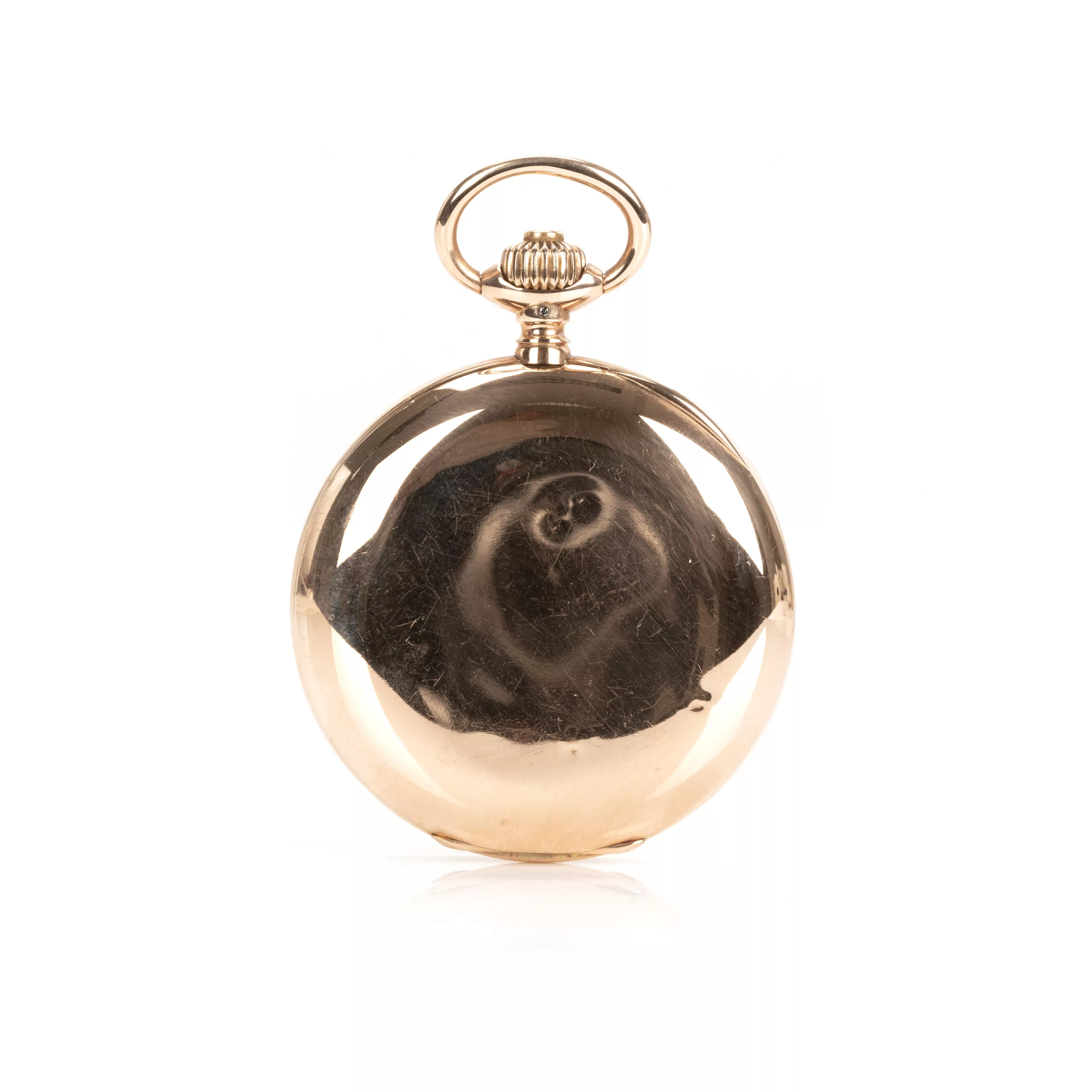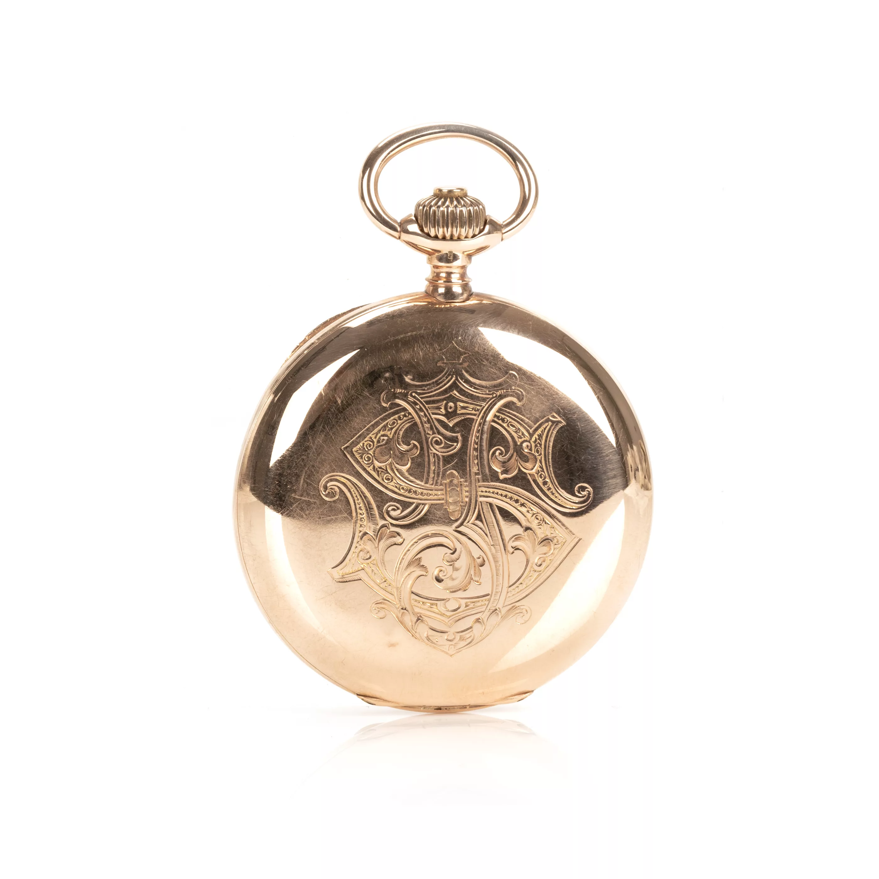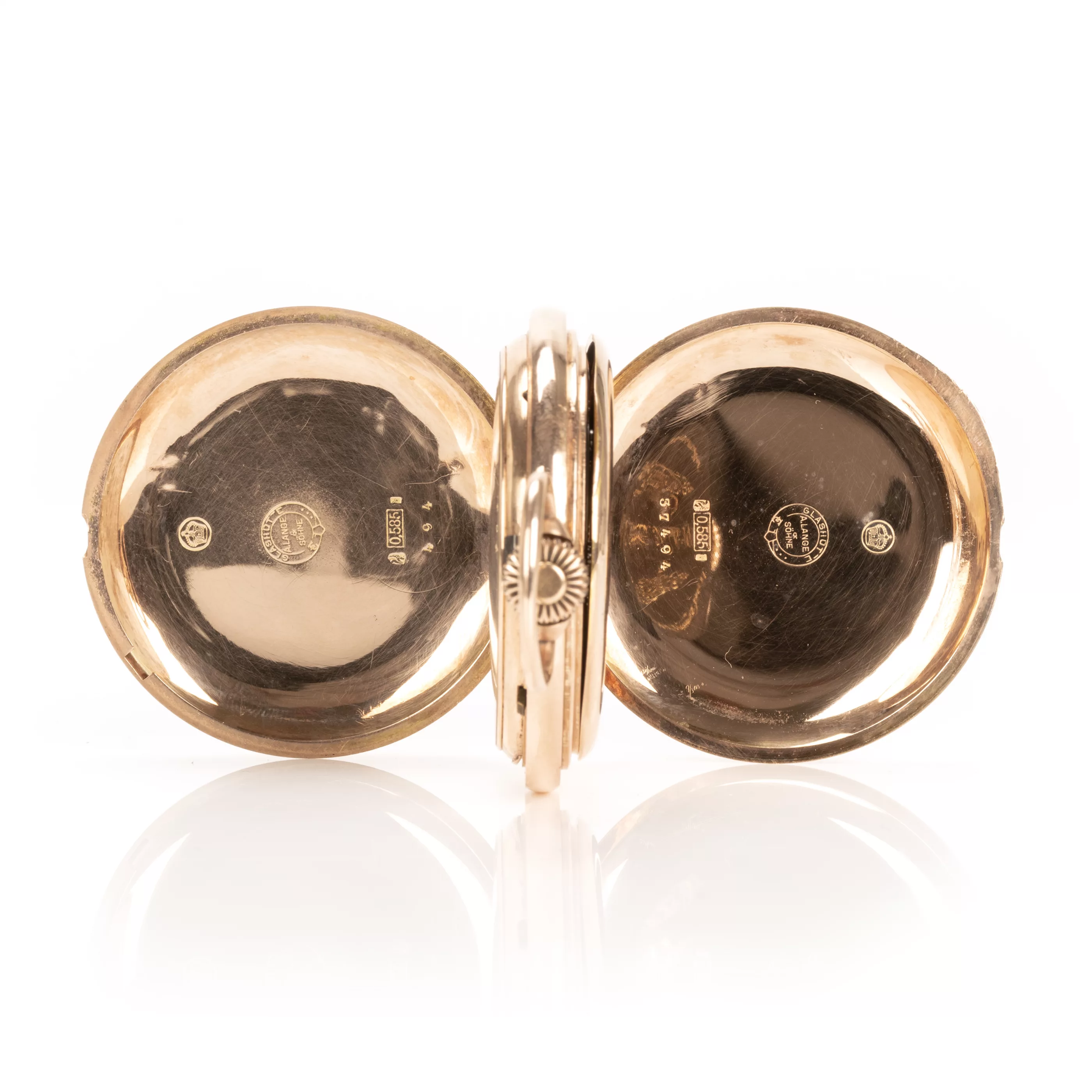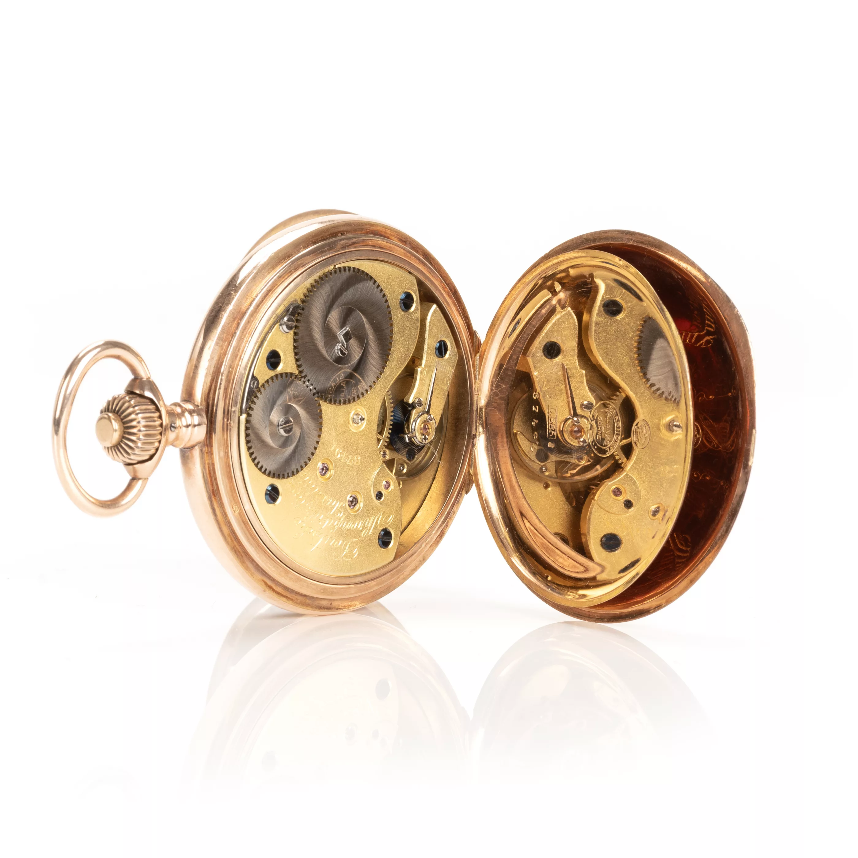 Year 1901, crown winding, enamel dial with arabic numerals, small second, case/movement no. 37494, case 585 red gold, hallmarked, inner cover 585 red gold, hallmarked, diameter 52 mm, total weight approx. 101.6 g, functional, condition good, case with minor dents, case SJ monogrammed, inner cover with dedication, condition and functionality checked by our master watchmaker, note: The buyer's premium is 25% incl. VAT. For the use of the online bidding consoles there is an additional fee of 3% plus VAT (3.57%).