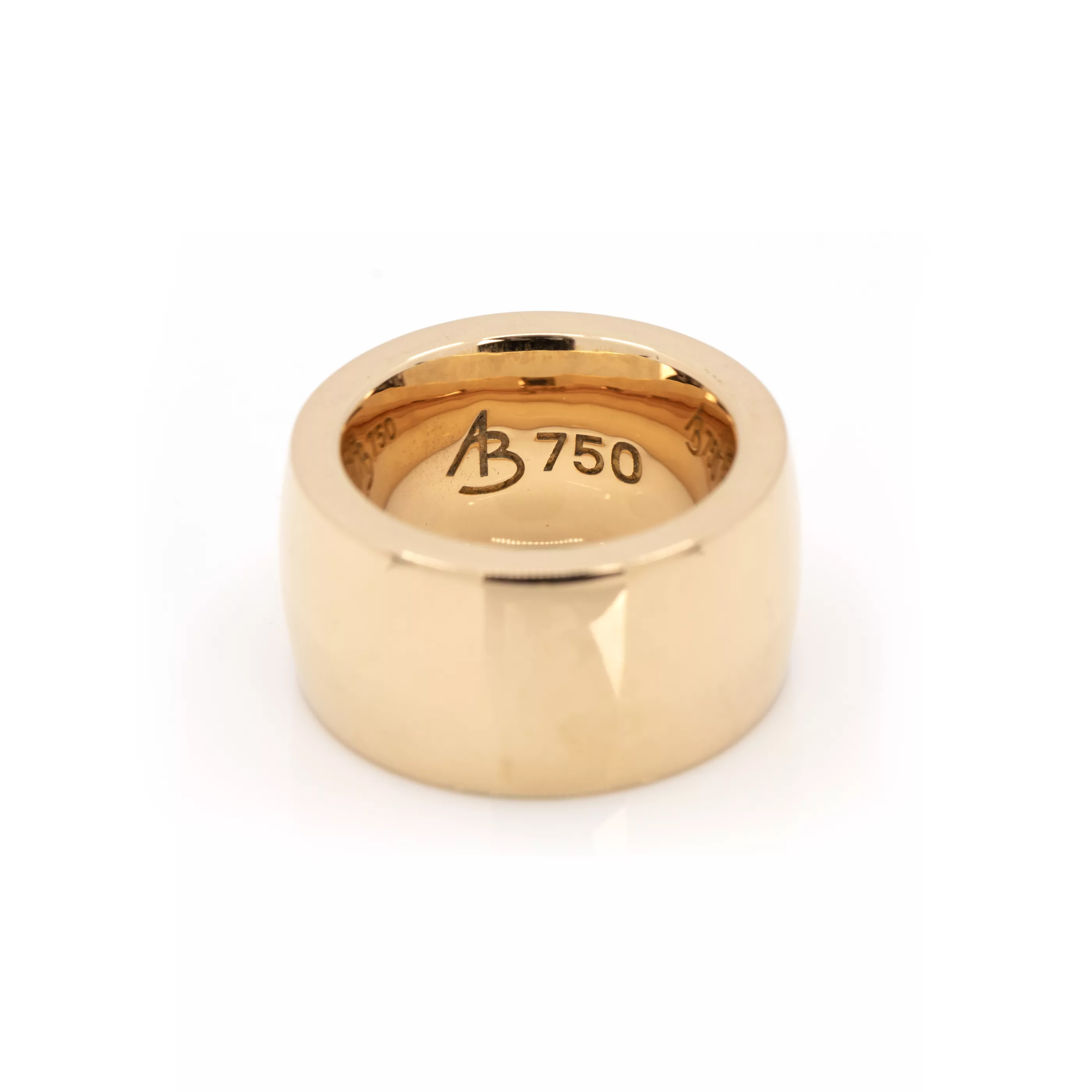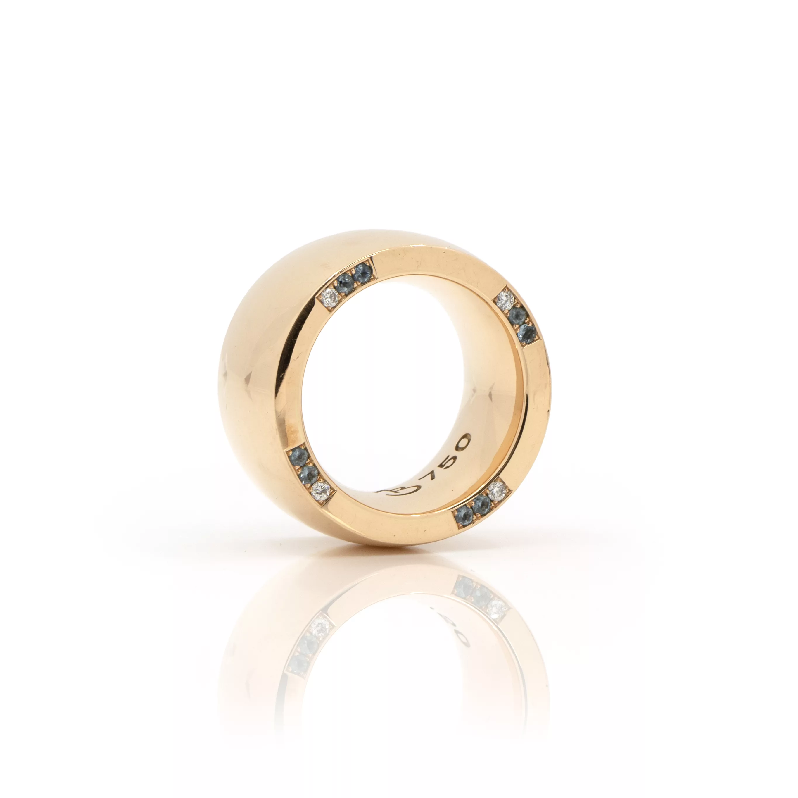 750 Rotgold, punziert, dazu Markenpunze Braucksiepe Goldschmiede, Essen, 4 Diamanten im Brillantschliff, gesamt ca. 0,08 ct, F, vvs, 8 Aquamarine im Rundschliff, RW 61/62, Gewicht ca. 30,2 g, Kopie der Rechnung anbei