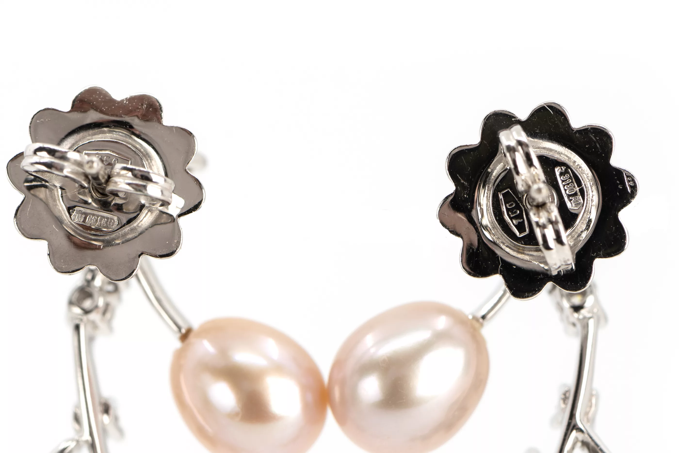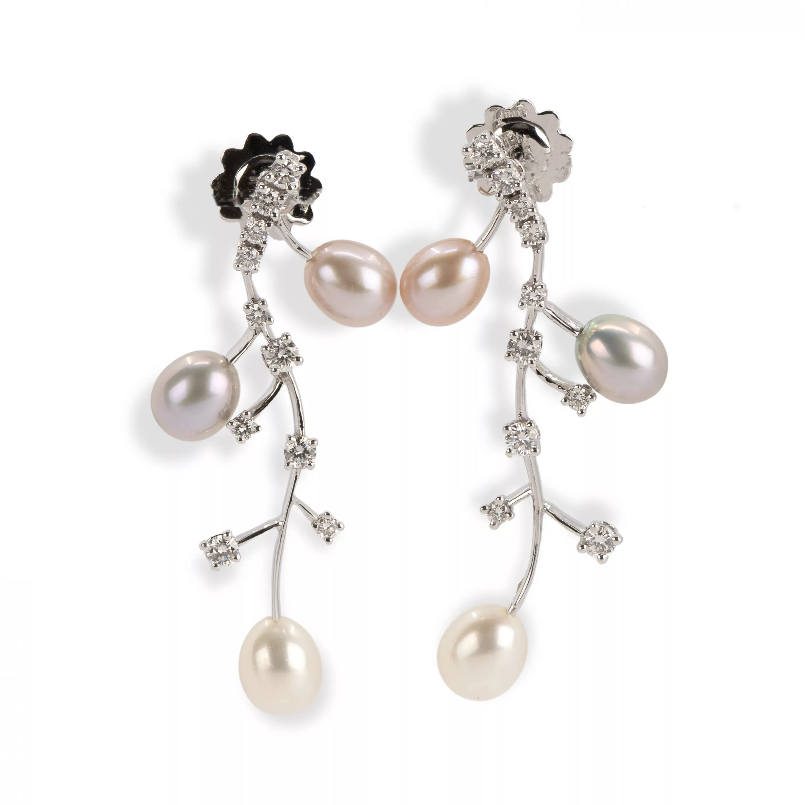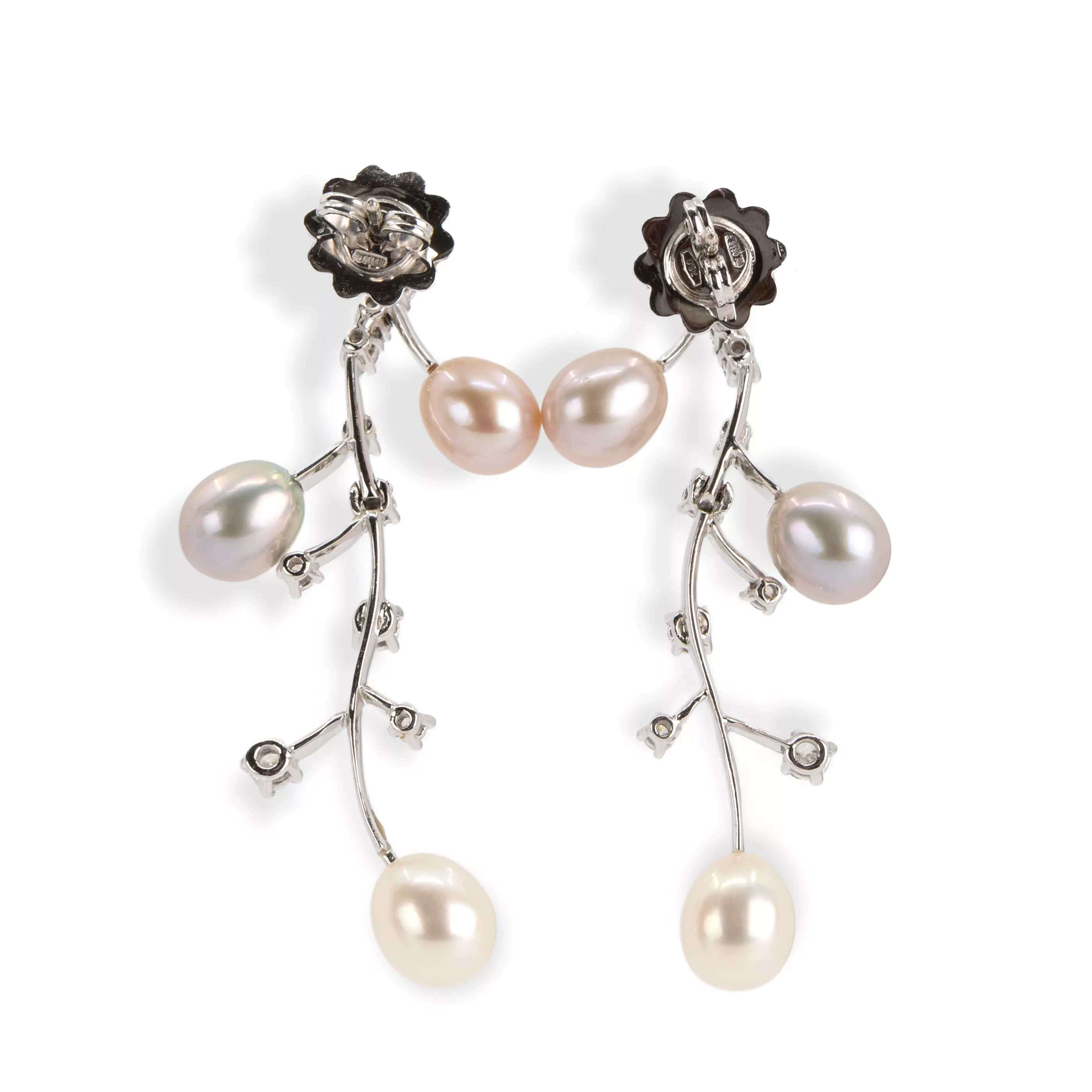 Italien, 750 Weißgold, punziert, jeweils 10 Diamanten im Brillantschliff, je 1,16 ct punziert, gesamt 2,32 ct, H-I, vs-si, jeweils 3 tropfenförmige Perlen in hellblau, hellrosa und weiß, Ø 7 - 7,6 mm, Länge 5 cm, Gesamtgewicht ca. 11,7 g