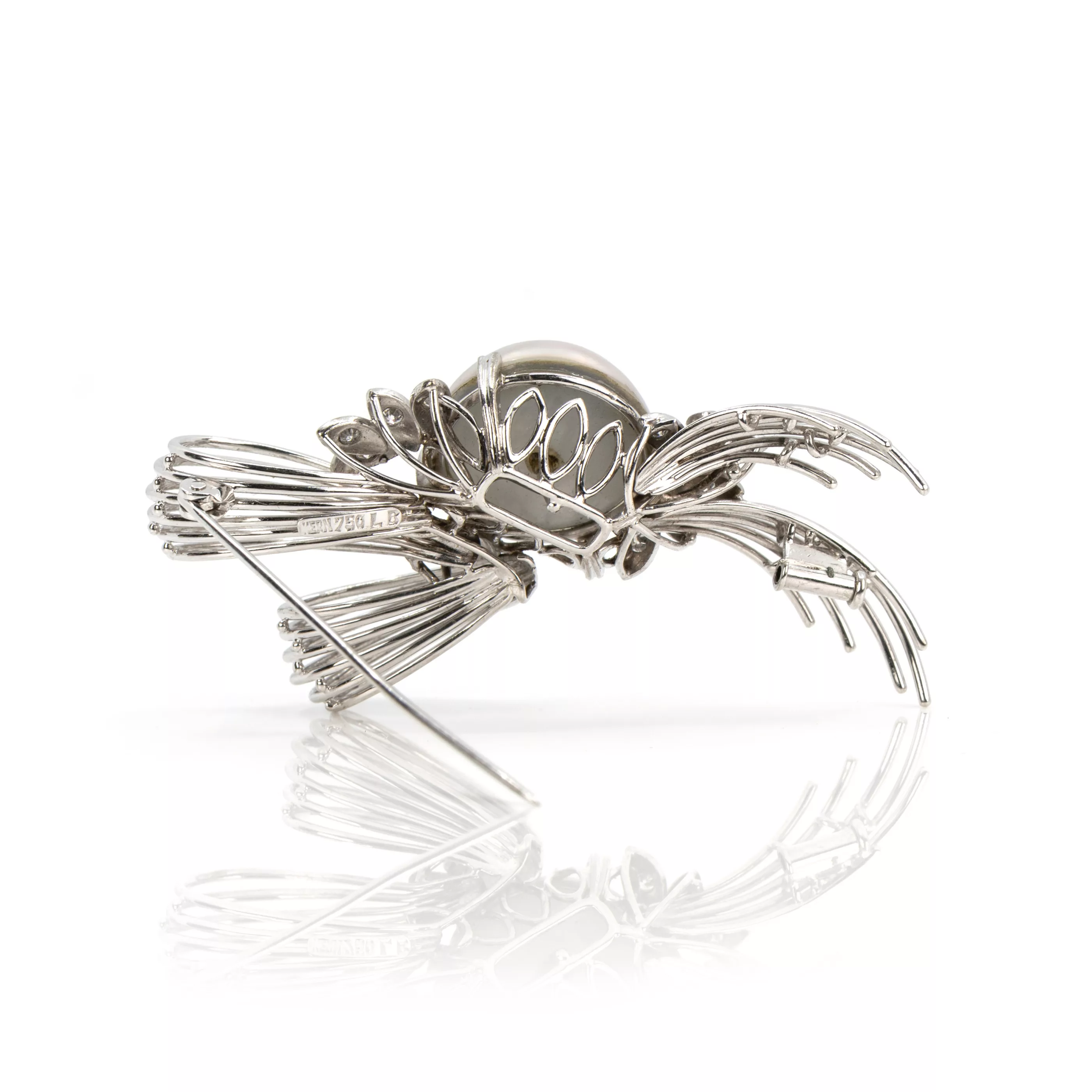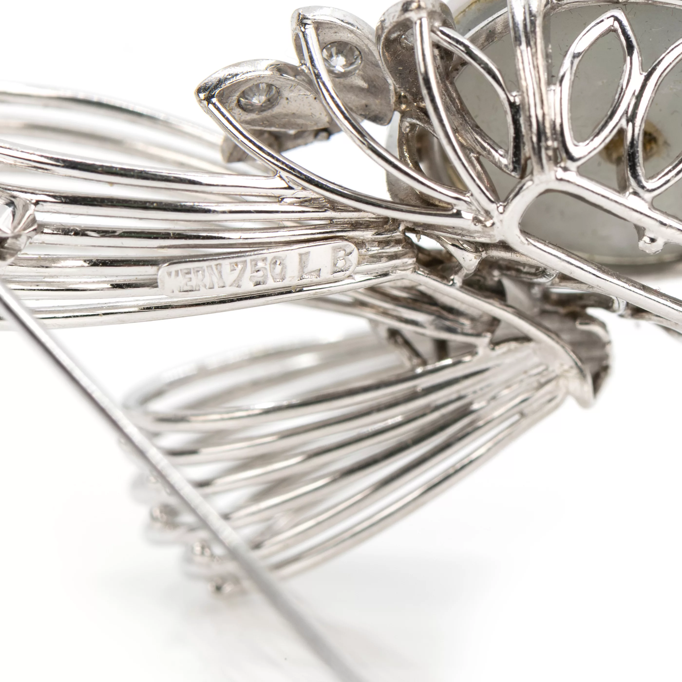 750 Weißgold, punziert, 12 Diamanten im Brillantschliff, gesamt ca. 0,35 ct, G, vvs-vs, grau-lila changierende Mabé-Perle, Ø 17 mm, Länge 6 cm, Gewicht ca. 18,6 g
