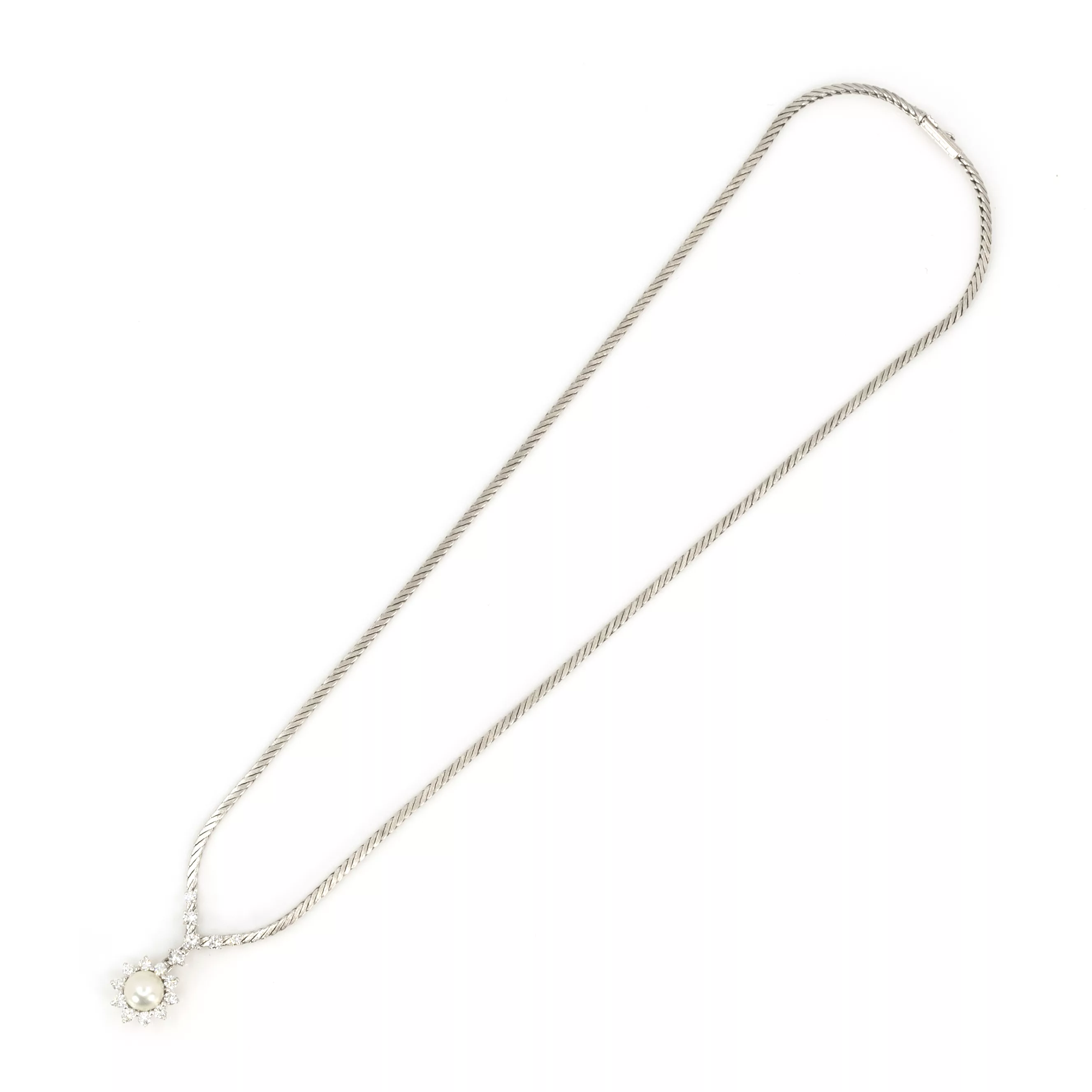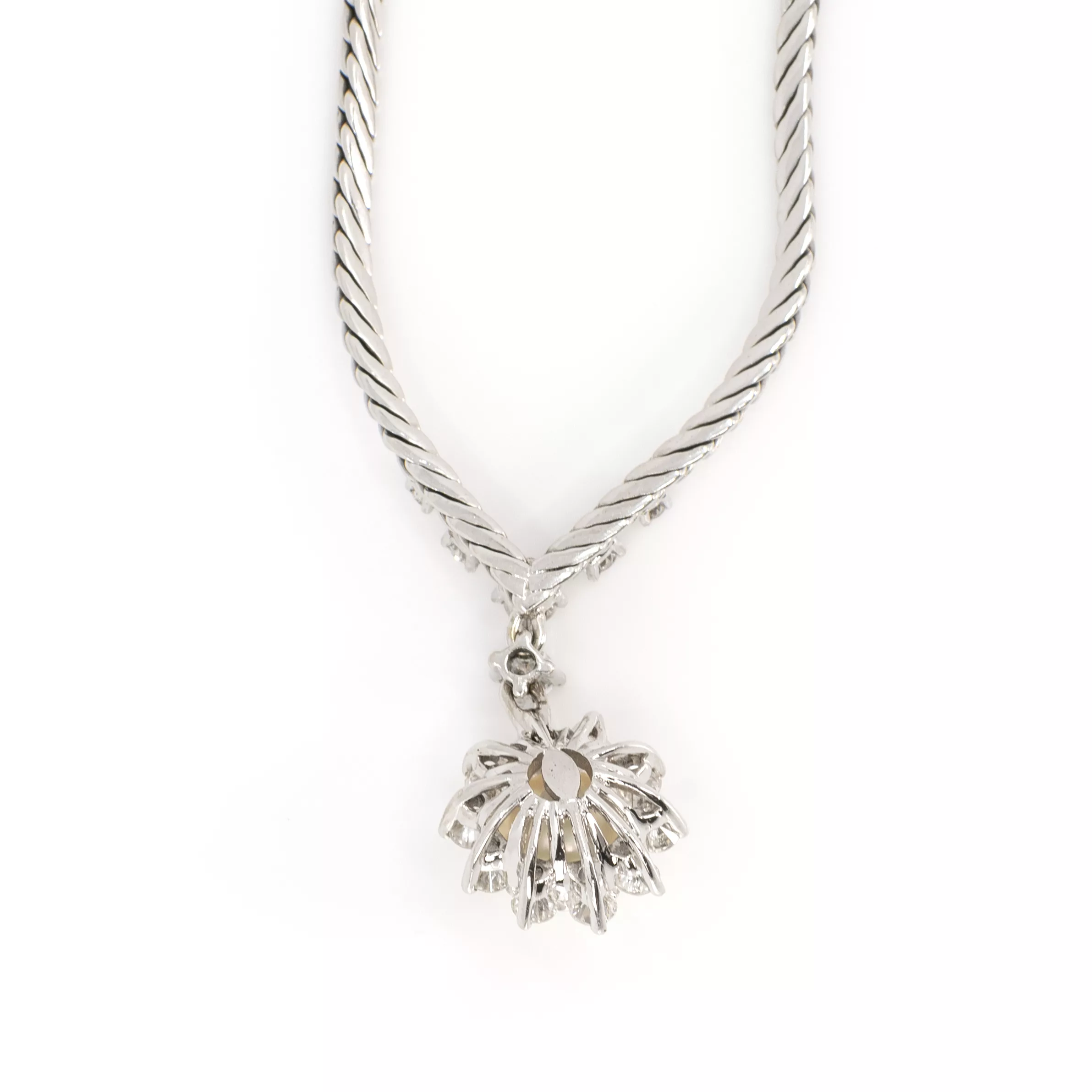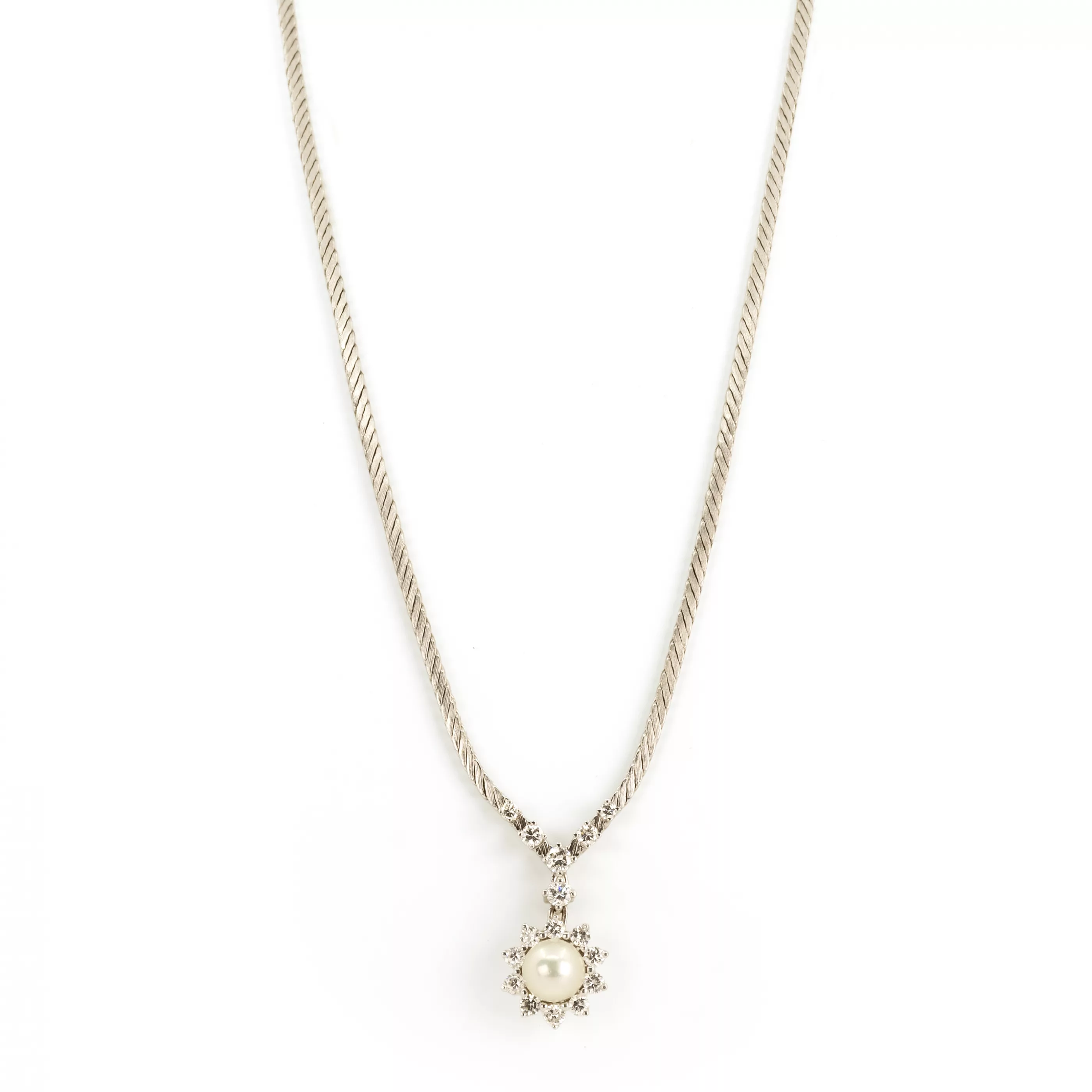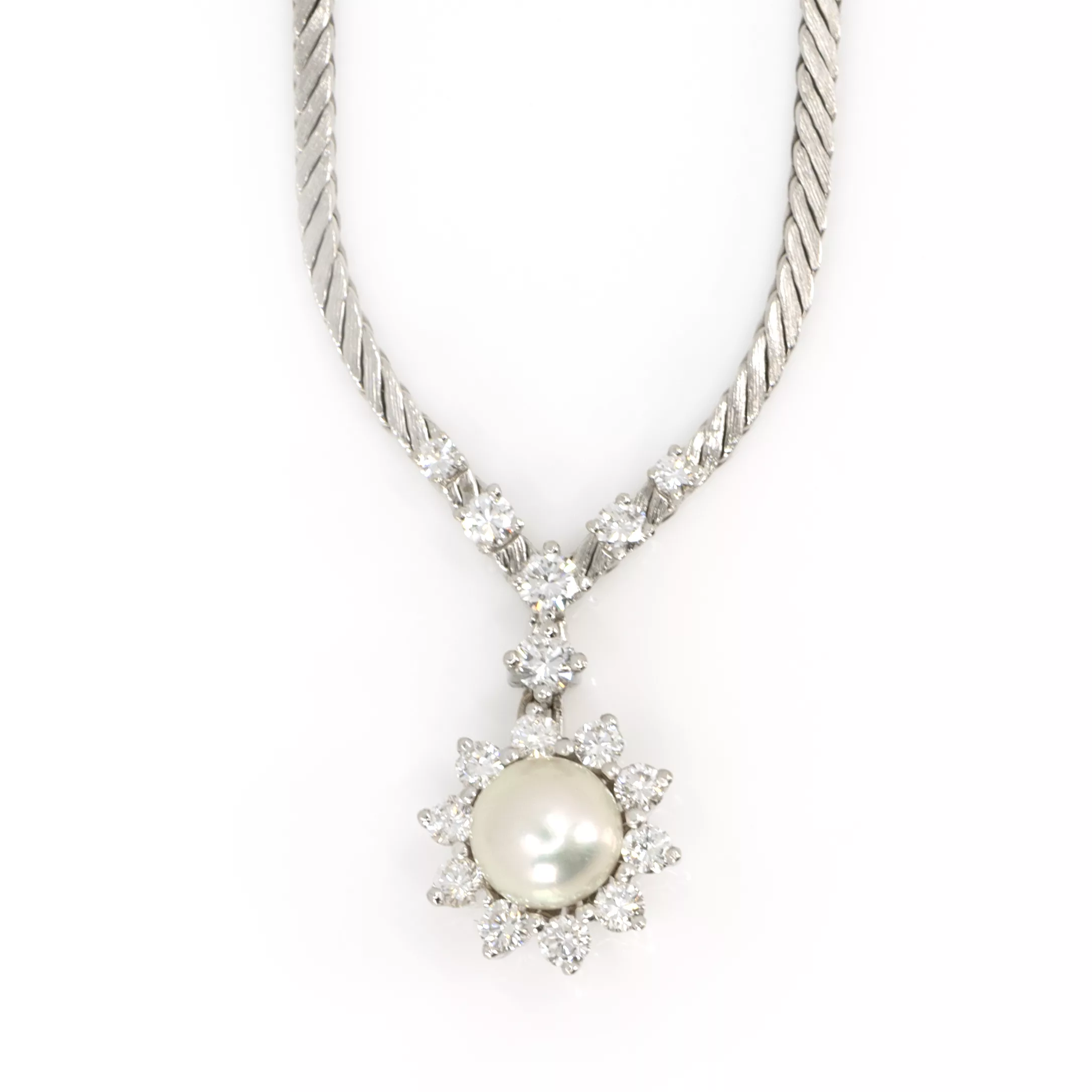 750 white gold, hallmarked, 16 brilliant-cut diamonds, total approx. 0.85 ct, G-H, vs, cultured pearl in the centre, Ø 7.4 mm, chain length 46 cm, weight approx. 19.3 g