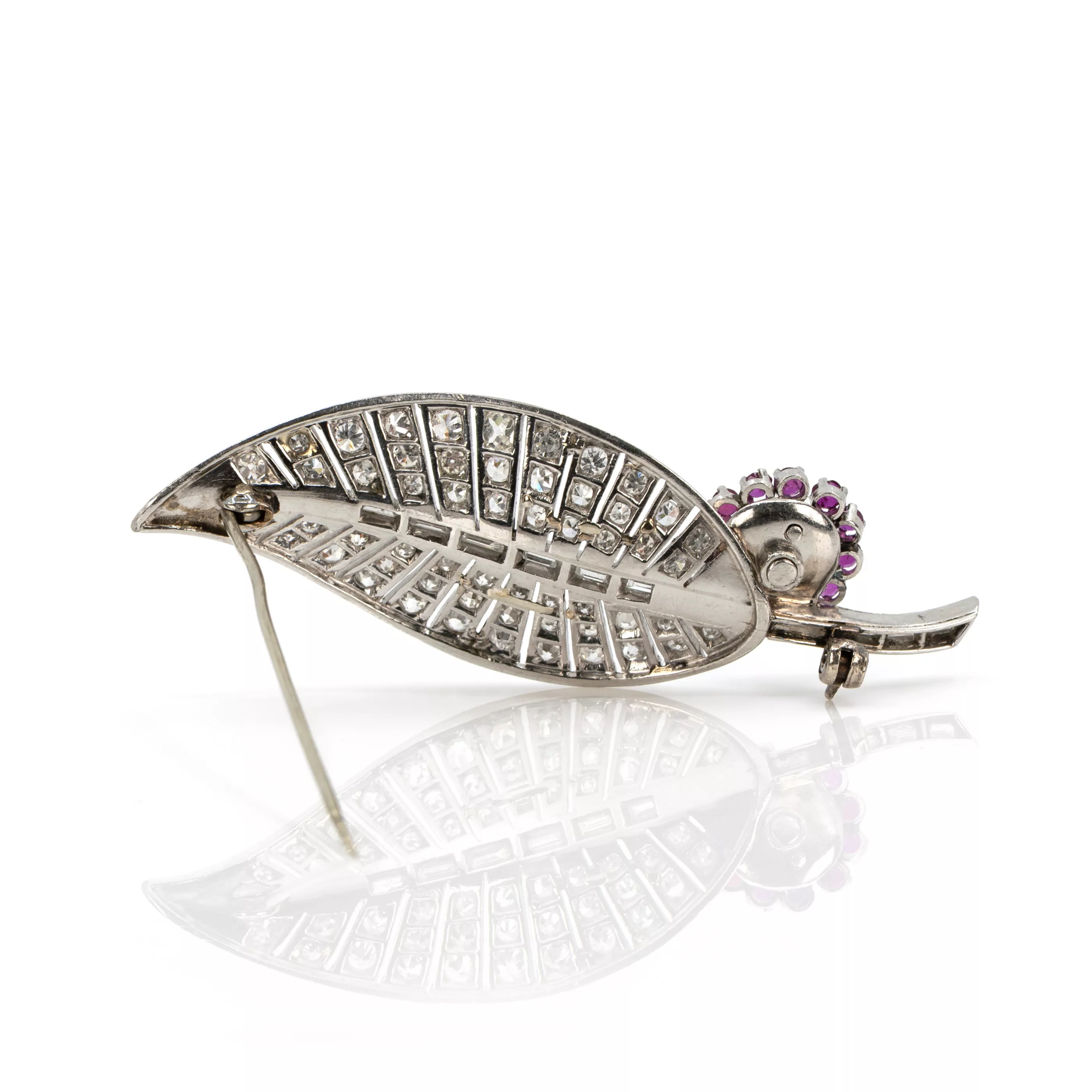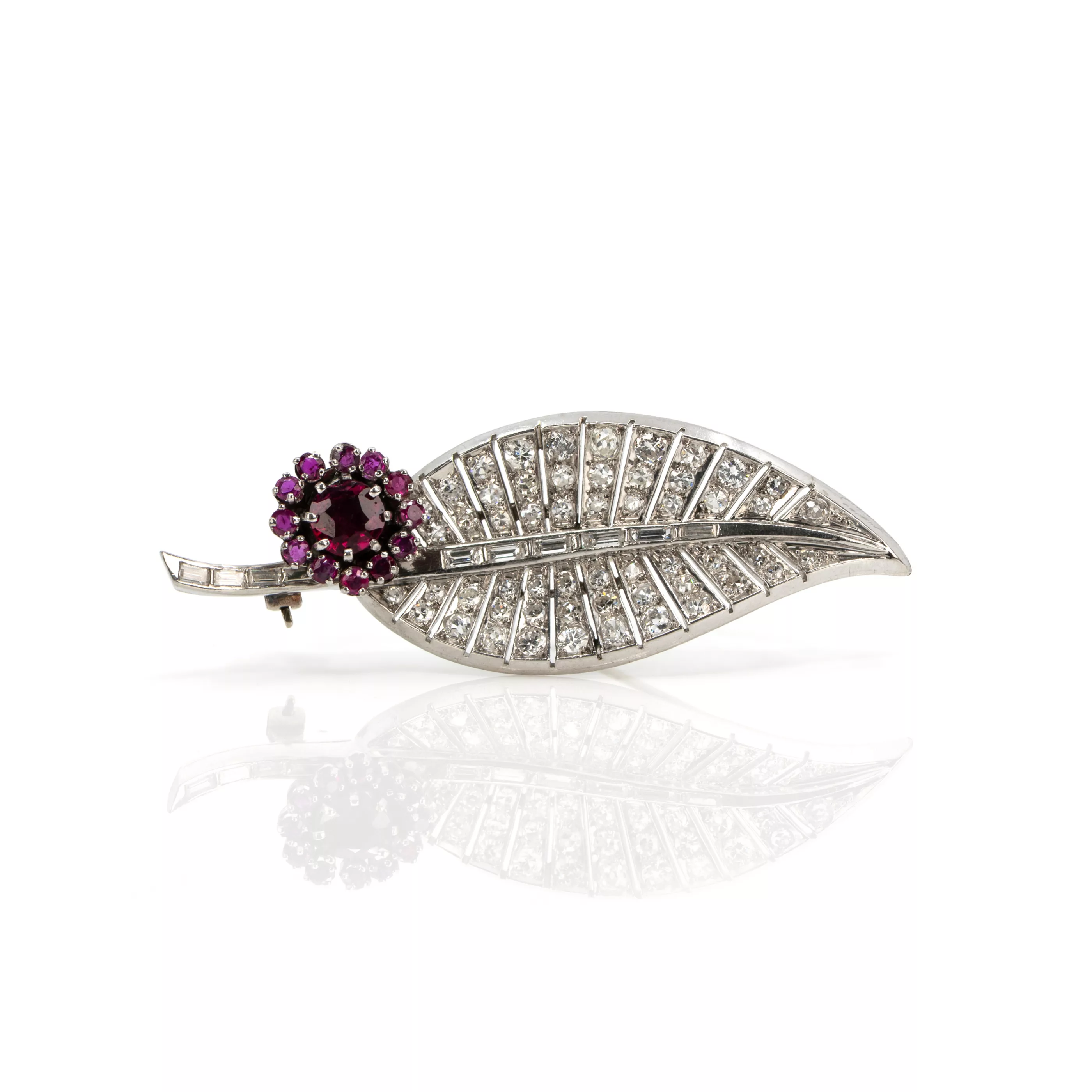 750 Weißgold, geprüft, 54 Diamanten im Achtkant- und Altschliff, sowie 3 Diamanten im Baguetteschliff, gesamt ca. 1 ct, H-J, si, 13 Rubine im Rundschliff, gesamt ca. 0,75 ct, Gewicht ca. 13,5 g, mittlerer Rubin seitlich mit Bestoßung
