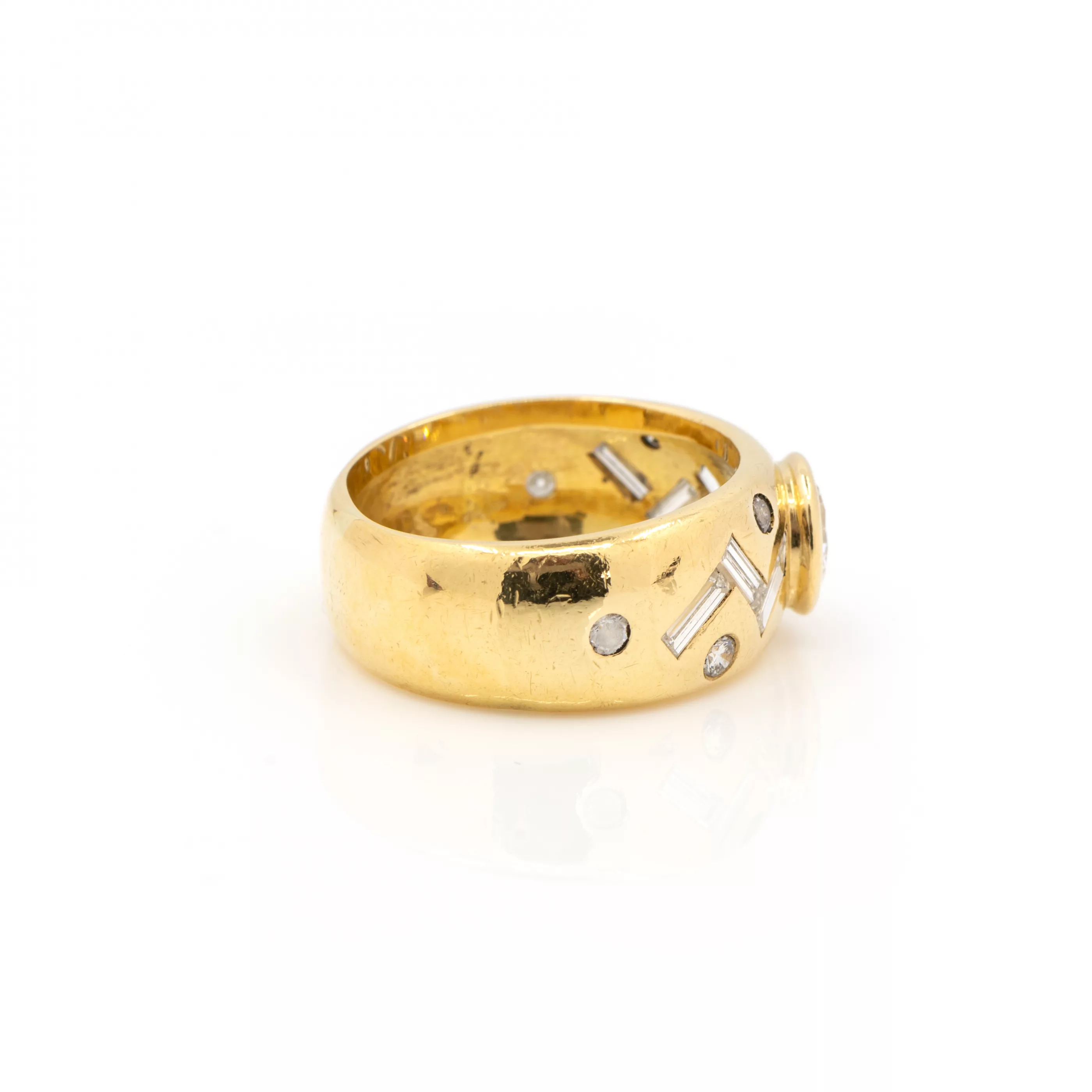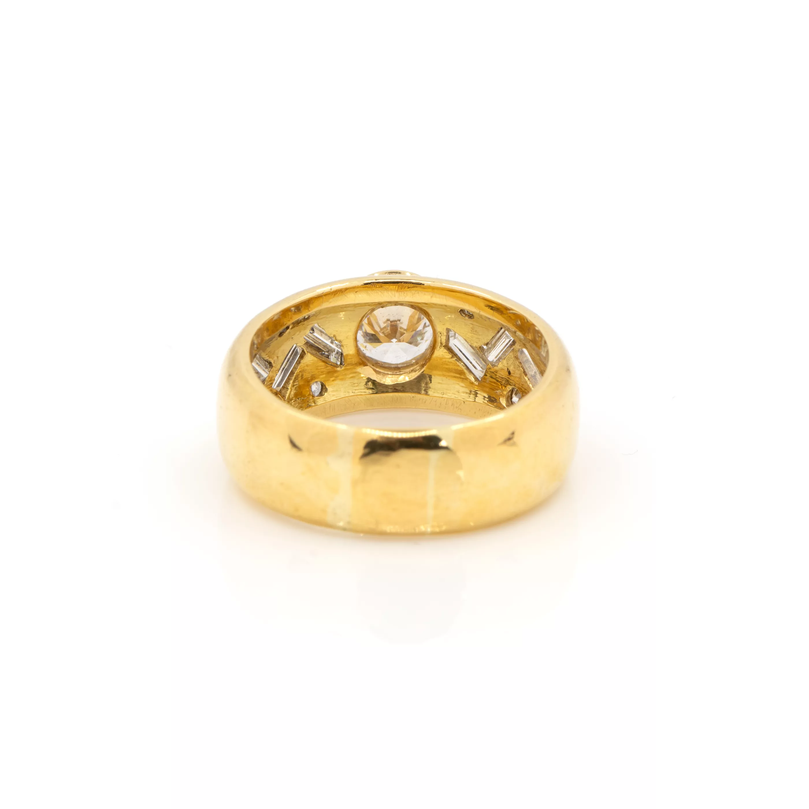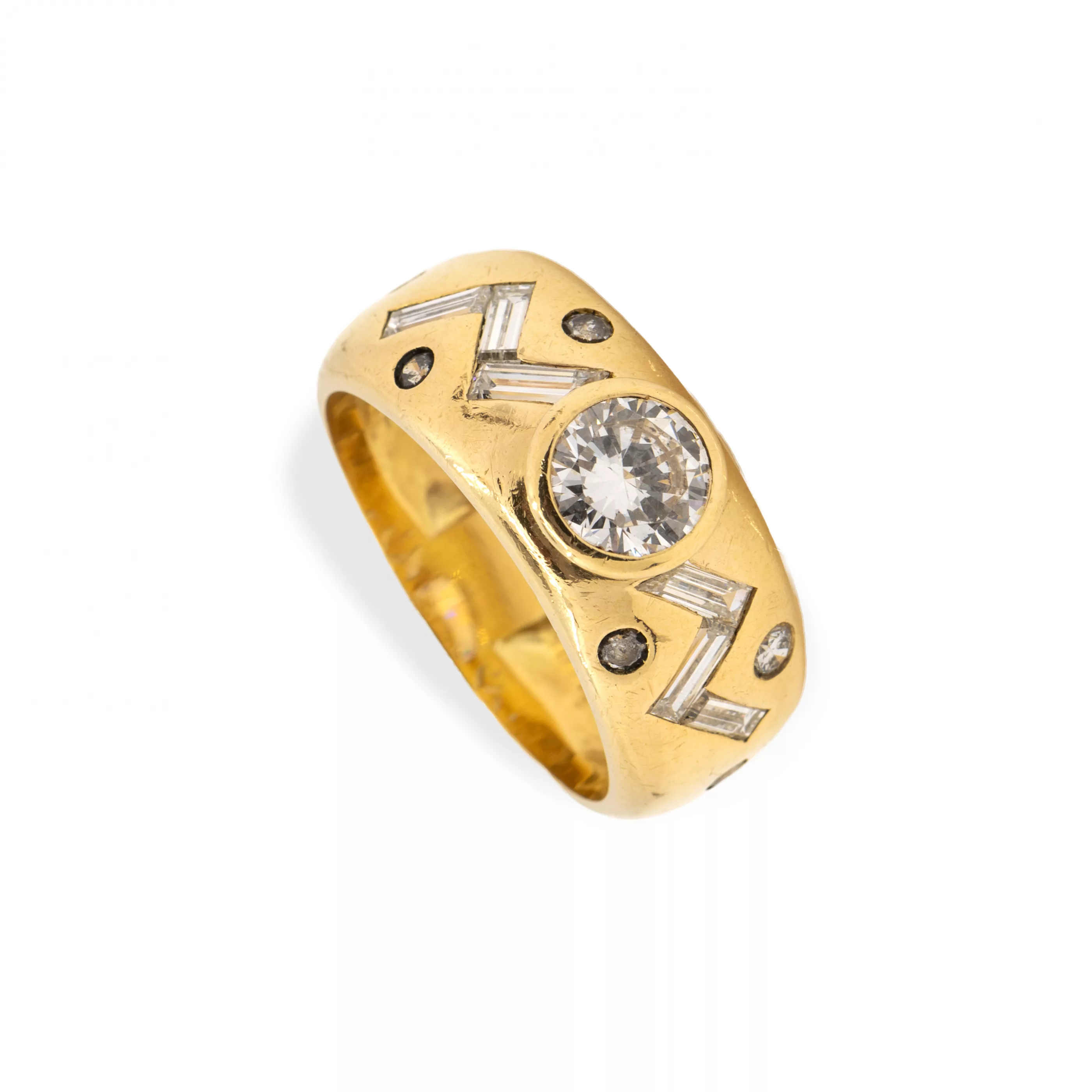 750 Gelbgold, punziert, 1 Diamant im Brillantschliff, 6 Diamanten im Achtkantschliff und 6 Diamanten im Baguetteschliff, zentraler Diamant ca. 0,90 ct, die übrigen Diamanten gesamt ca. 0,98 ct, zentraler Diamant und die Baguettediamanten H, vs, die übrigen Diamanten pi, RW 60, Gewicht ca. 12,1 g, 5 der kleinen Diamanten mit starken Tragespuren