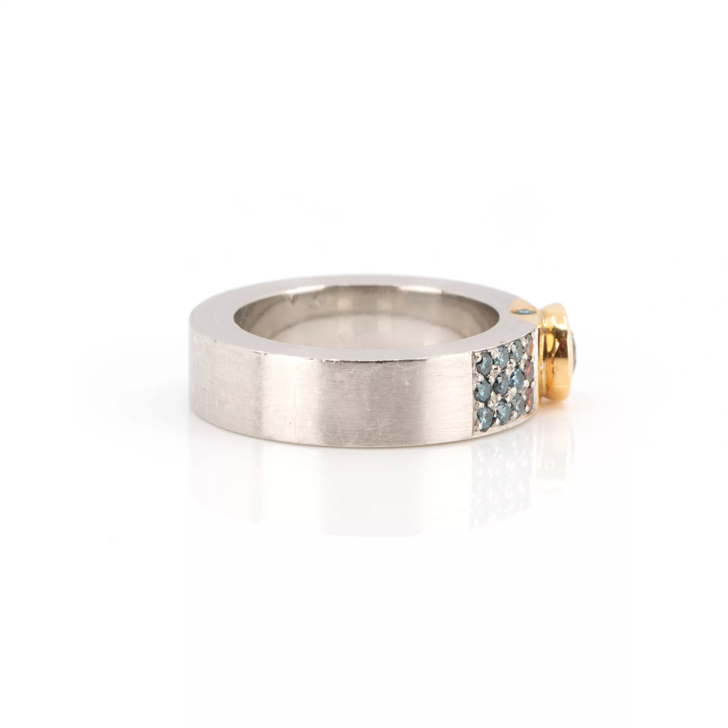950 Platin und 750 Roségold, punziert sowie Meisterpunze Marlis Badry, zentraler Diamant im Brillantschliff, 0,52 ct, Fancy Natur, dazu 34 cognacfarbene und grün-blaue Diamanten im Brillantschliff, gesamt 0,58 ct, RW 55, Gewicht ca. 22,5 g, Ringschiene mit minimalen Tragespuren, Schmuckpass und Rechnung von 2013 anbei