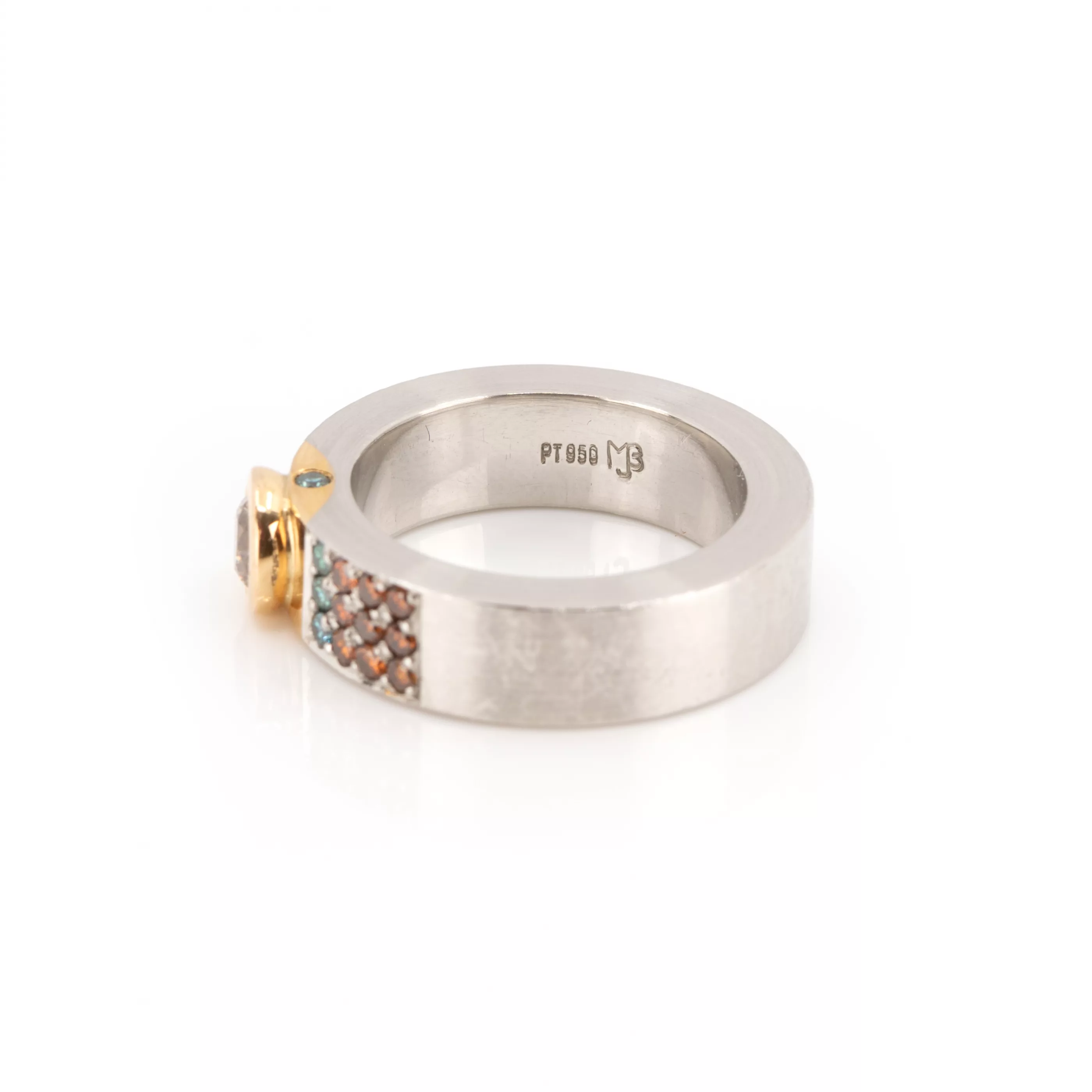 950 platinum and 750 rose gold, hallmarked and master's mark Marlis Badry, central brilliant-cut diamond, 0.52 ct, fancy natural, with 34 cognac and green-blue brilliant-cut diamonds, total 0.58 ct, RW 55, weight approx. 22.5 g, ring band with minimal signs of wear, jewelry certificate and invoice from 2013 enclosed