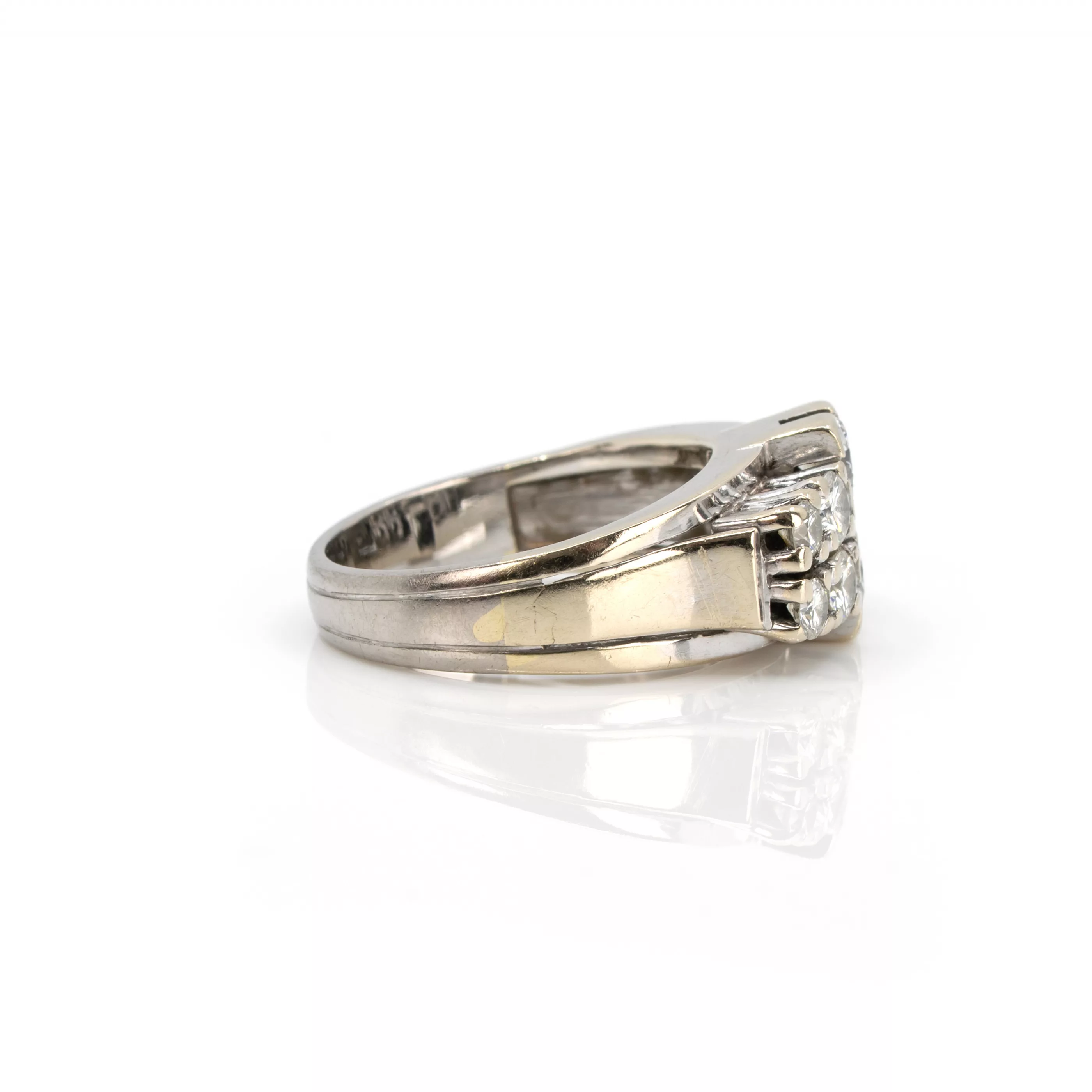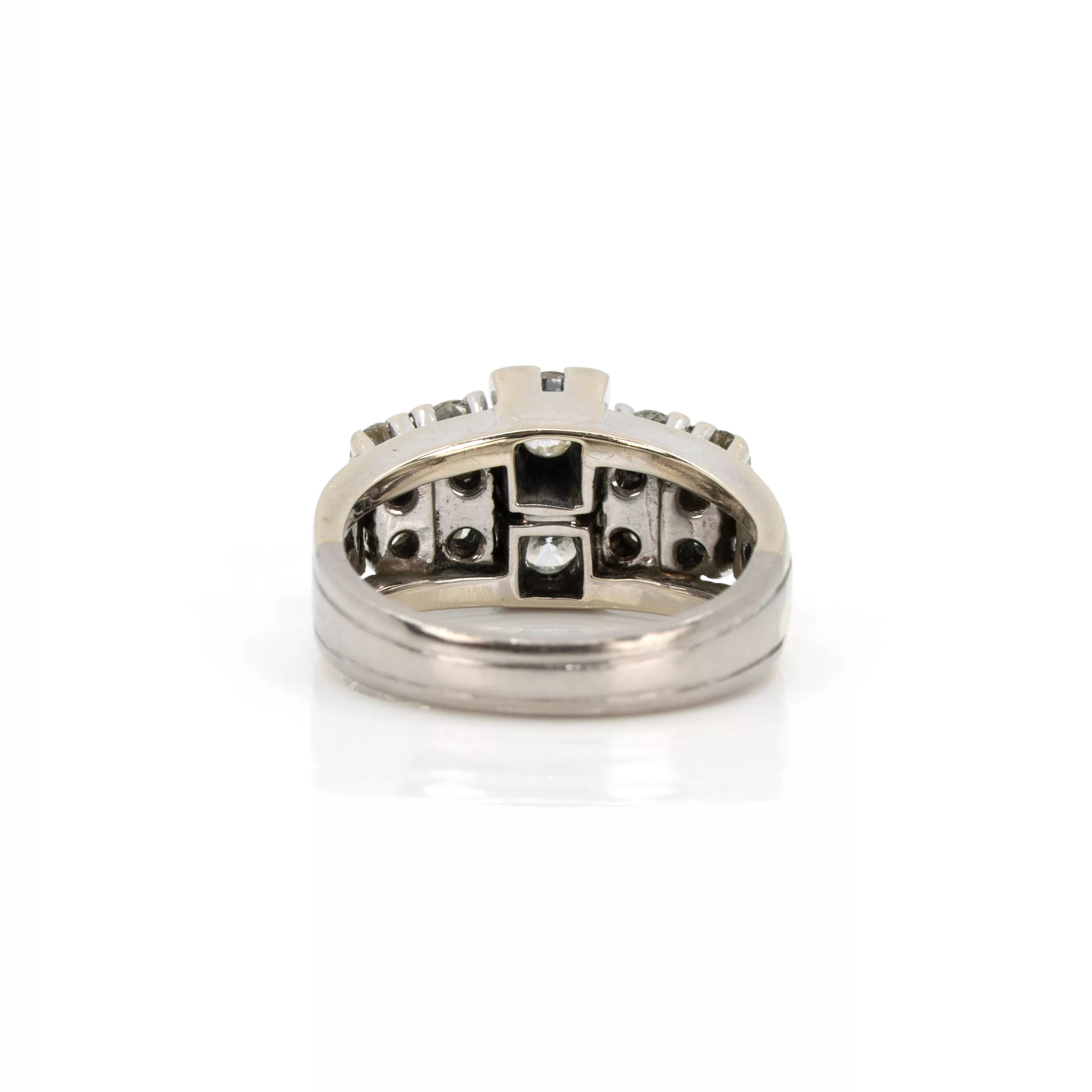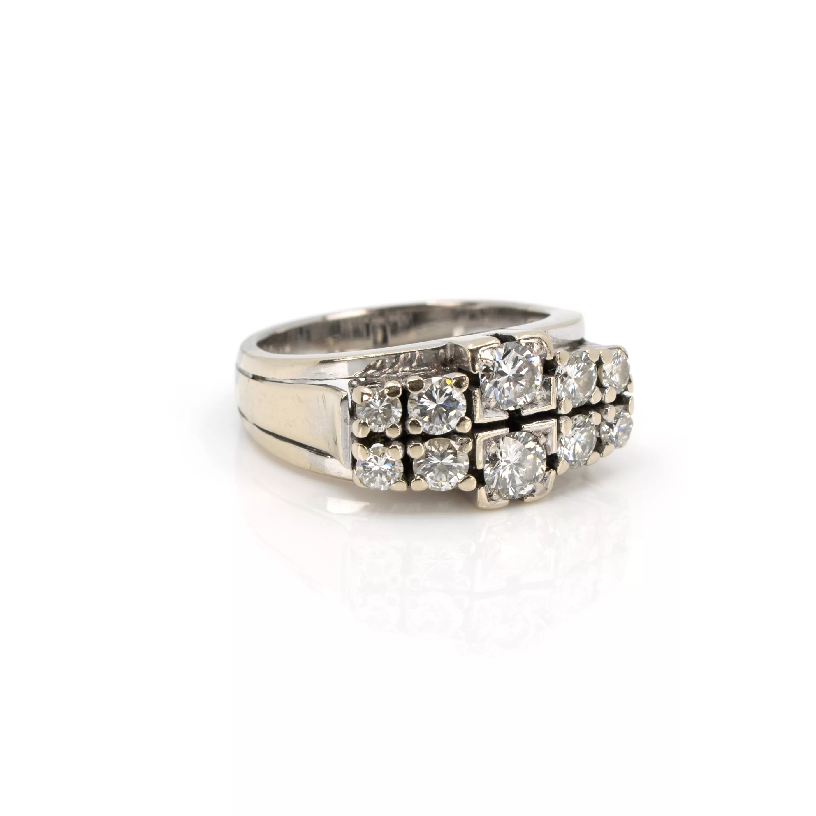750 Weißgold, geprüft, 10 Diamanten im Brillantschliff, gesamt ca. 1,10 ct, H, vs, RW 52, Gewicht ca. 9,7 g, ein Diamant seitlich mit minimaler Bestoßung