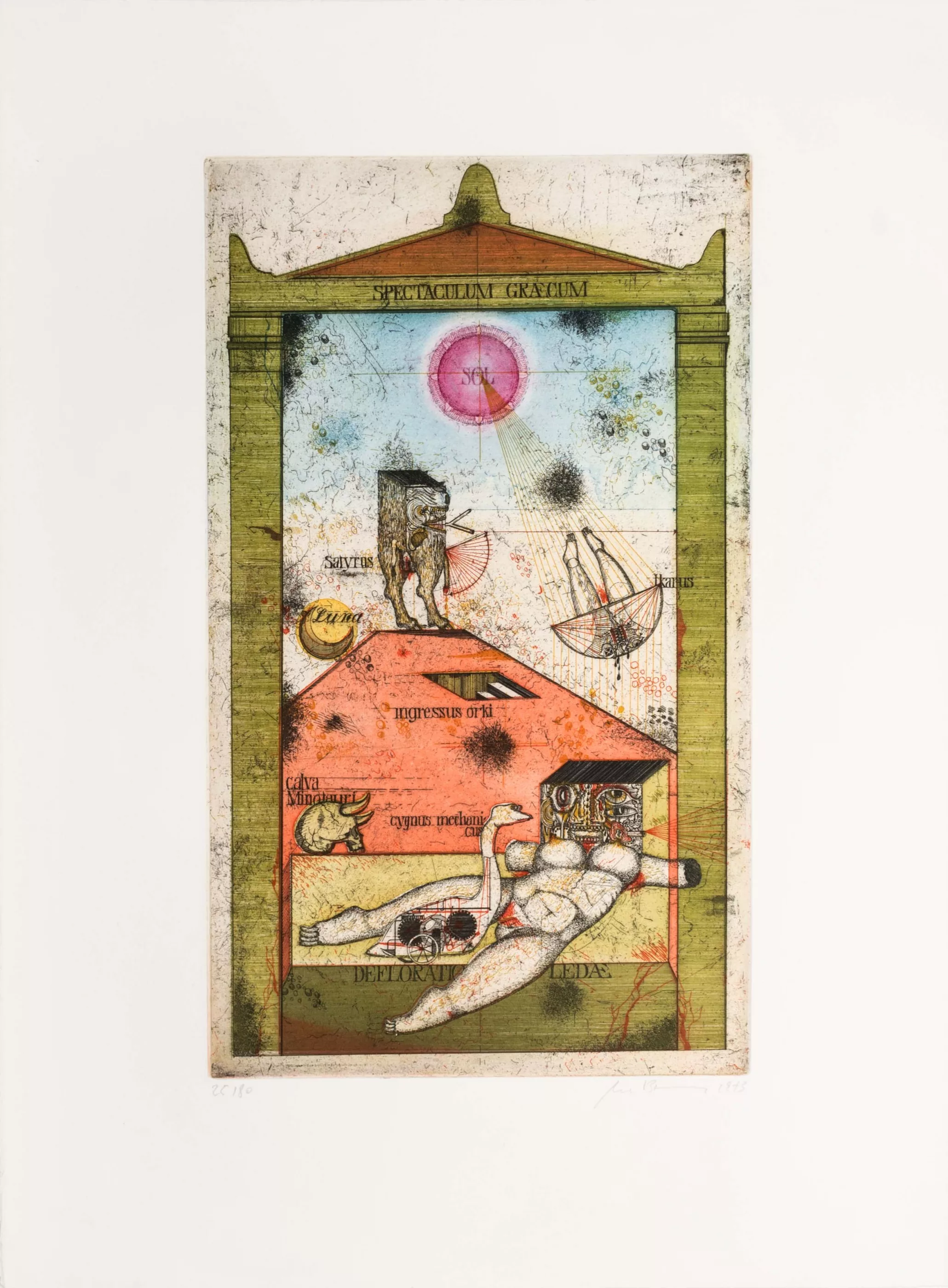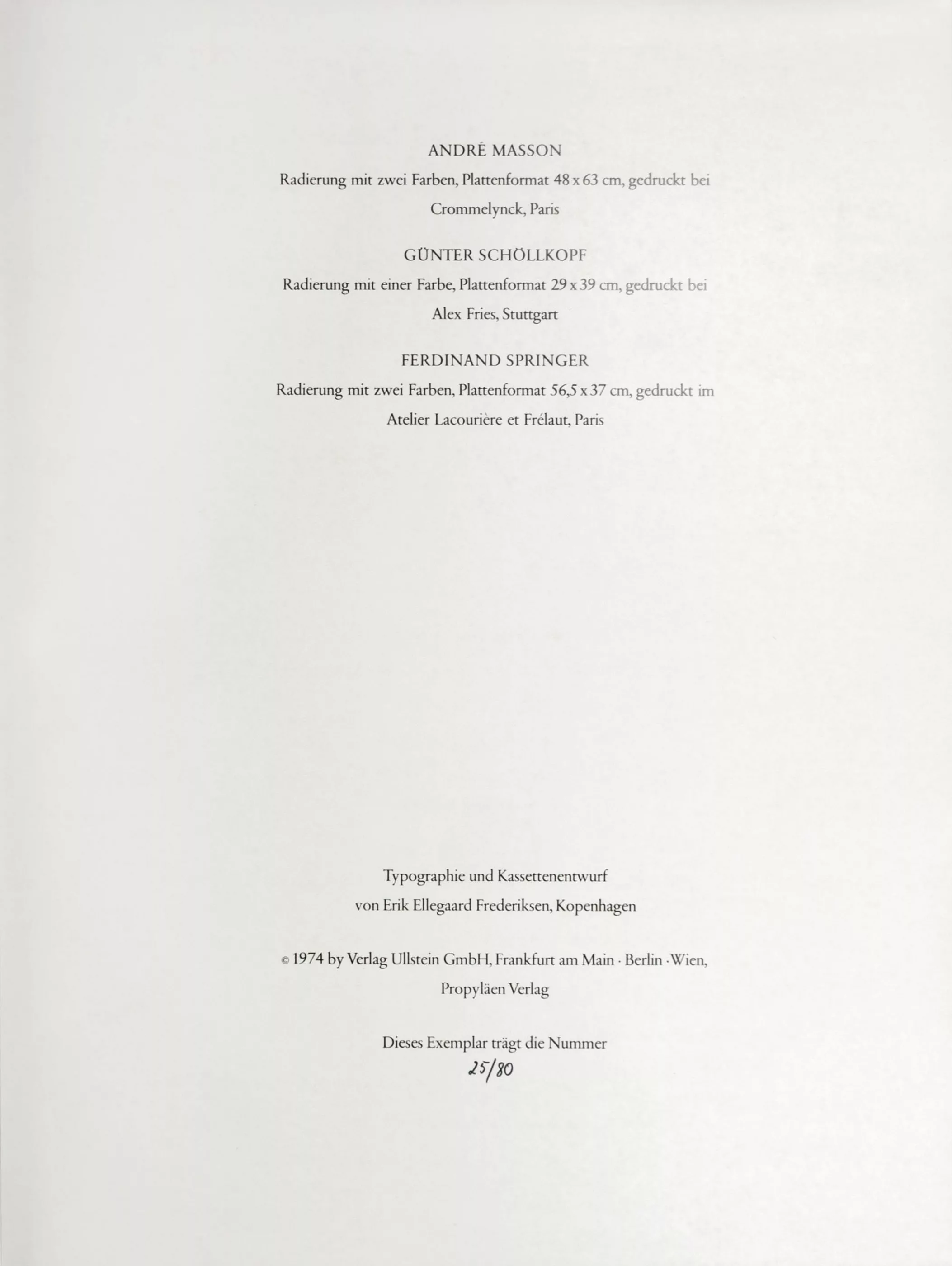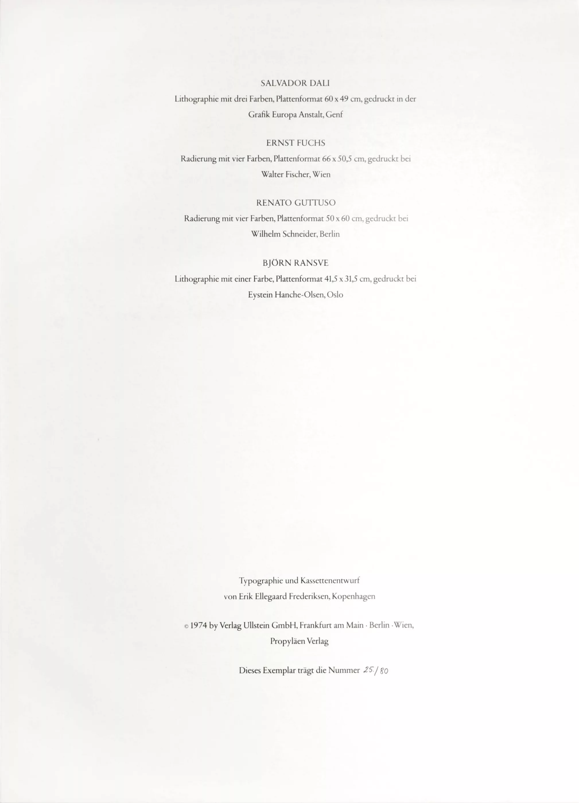 Portfolio 'Die Welt des Klassizismus', 1st portfolio & 2nd portfolio, 19 vols. by 19 artists, in 2 original wove paper portfolios, each with title page and imprint, published by Propyläen Verlag, Frankfurt/Main, Berlin and Vienna, 1974. portfolios, each with title page and imprint, published by Propyläen Verlag, Frankfurt/Main, Berlin and Vienna, 1974, various printing techniques on various papers, different sheet dimensions up to 76 cm x 56 cm, all sheets signed, 25/80 numbered, partly dated, also numbered 25/80 in the imprint, portfolio dimensions 94 cm x 69 cm and 81 cm x 62 cm, included are: 1st portfolio: Peter Ackermann, Hans Bellmer, Uwe Bremer, Camaro, Jorge Castillo, Lynn Chadwick, Fabrizio Clerici, Salvador Dali, Ernst Fuchs, Renato Guttuso and Björn Ransve, 2nd portfolio (complete): Edgar Augustin, Johannes Avramidis, Wolfgang Hutter, Fritz Janschka, Helmut Leherb, Heinrich Richter, Andre Masson, Günter Schöllkopf and Ferdinand Springer, missing: Jorge Castillo (portfolio 1)