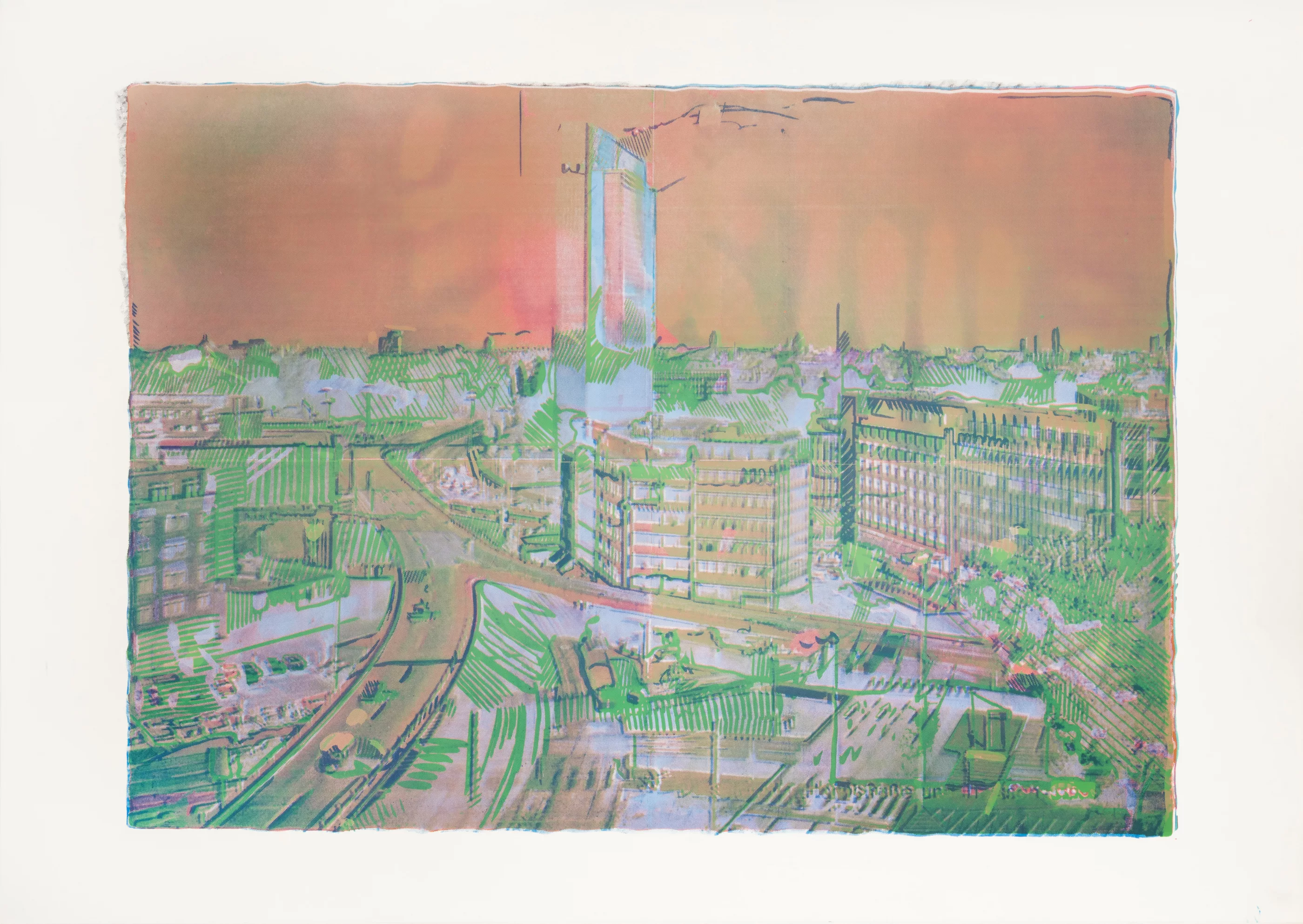 Düsseldorf, color screenprint on paper, Schoellerhammer dry stamp, 73 cm x 110 cm sheet size, partially soiled, traces of handling along the edges, traces of glue on the left edge of the sheet, small tear on the upper edge of the sheet