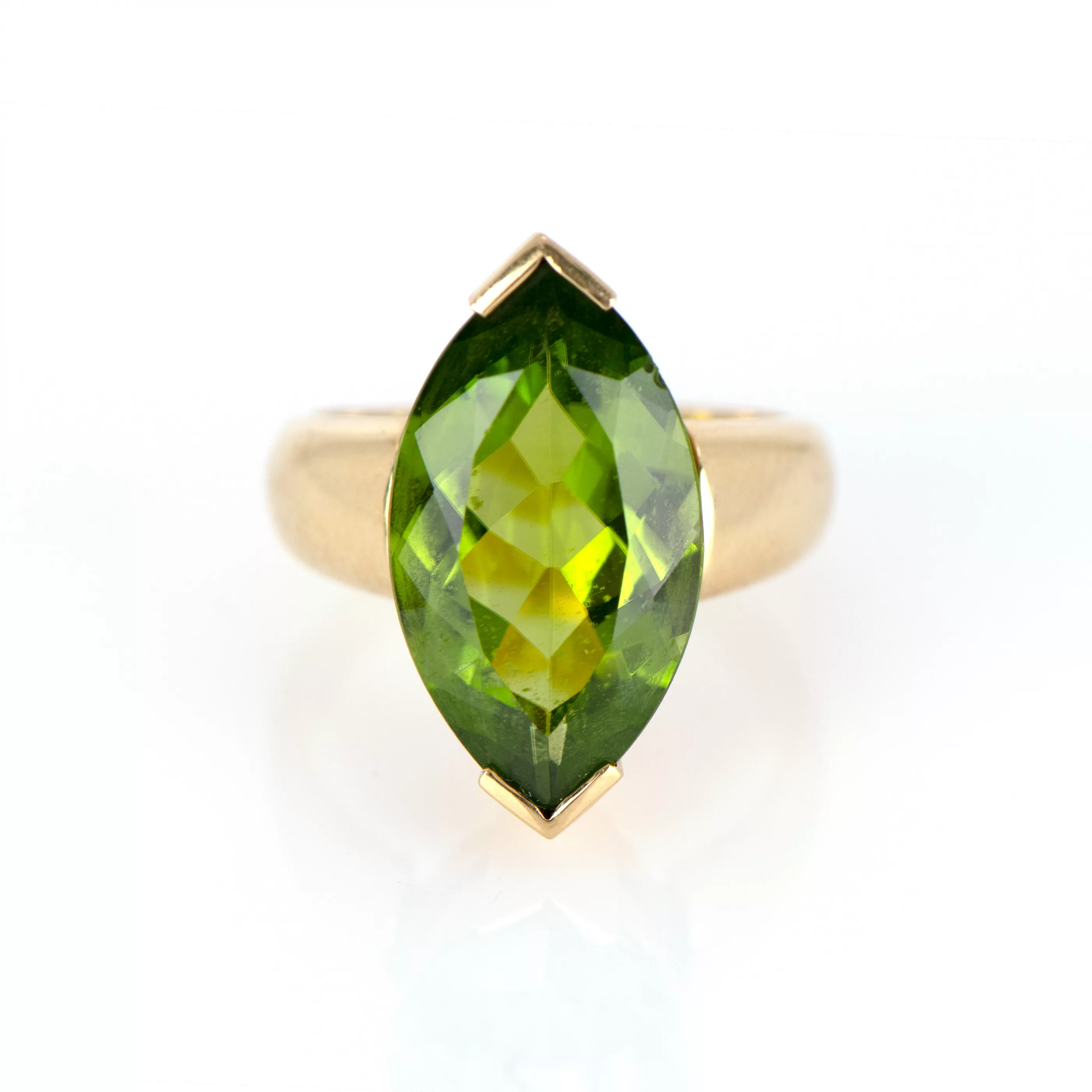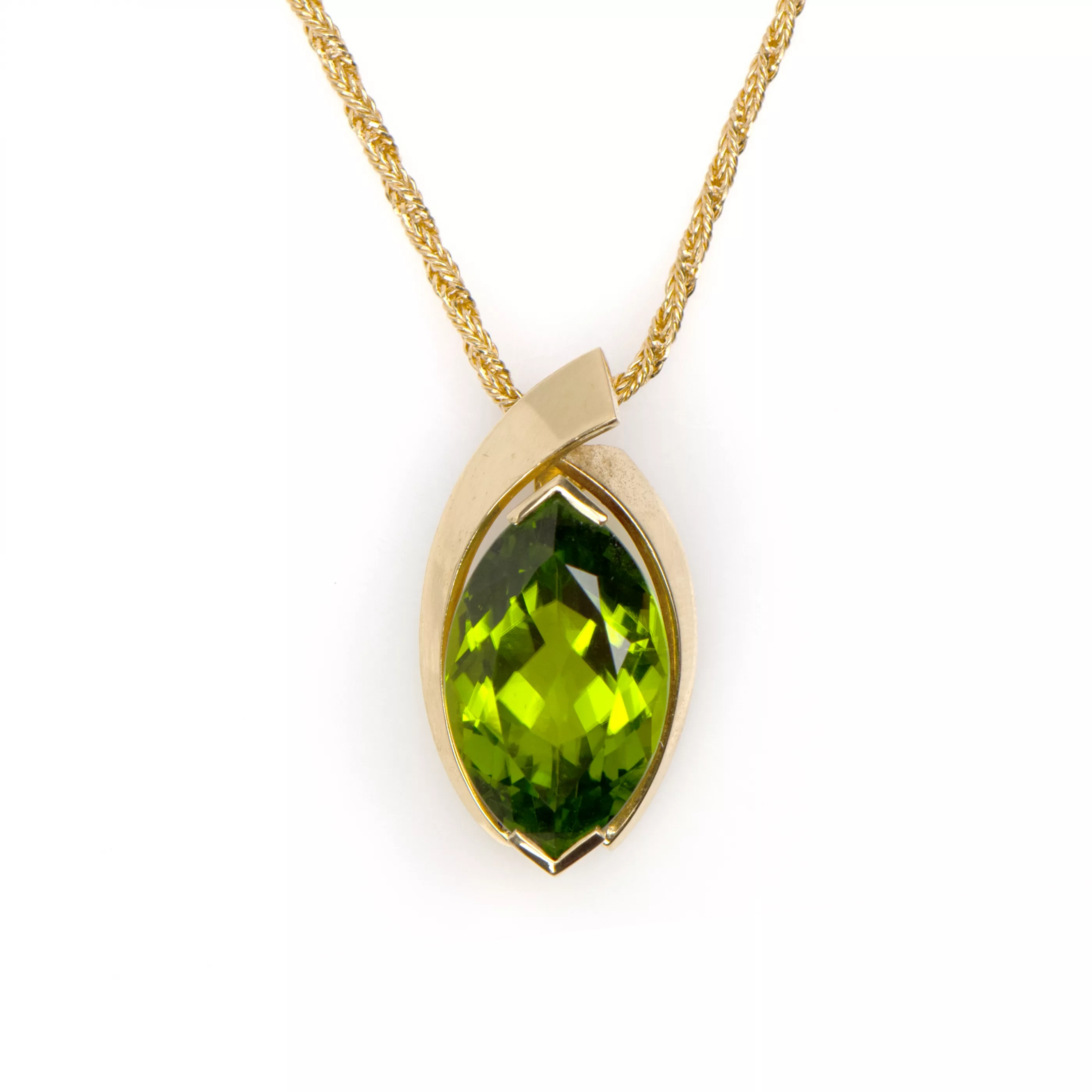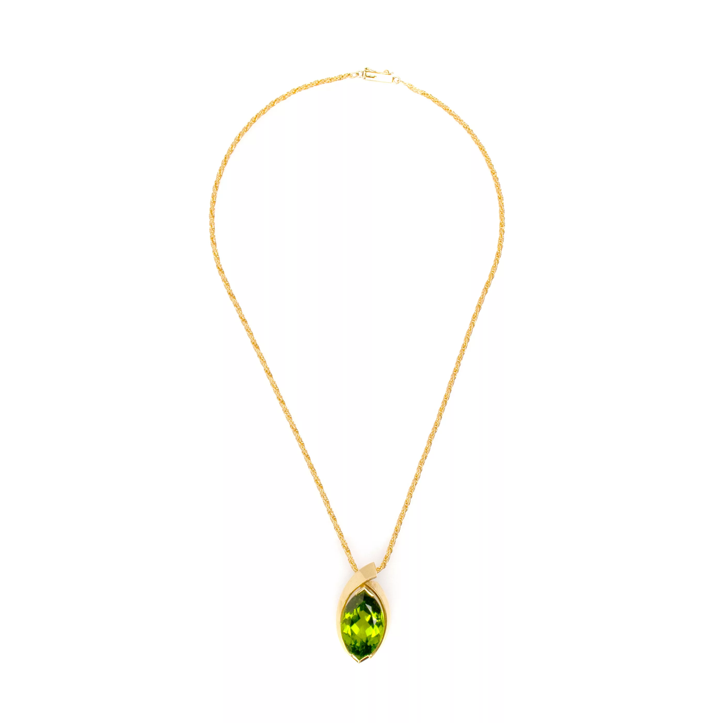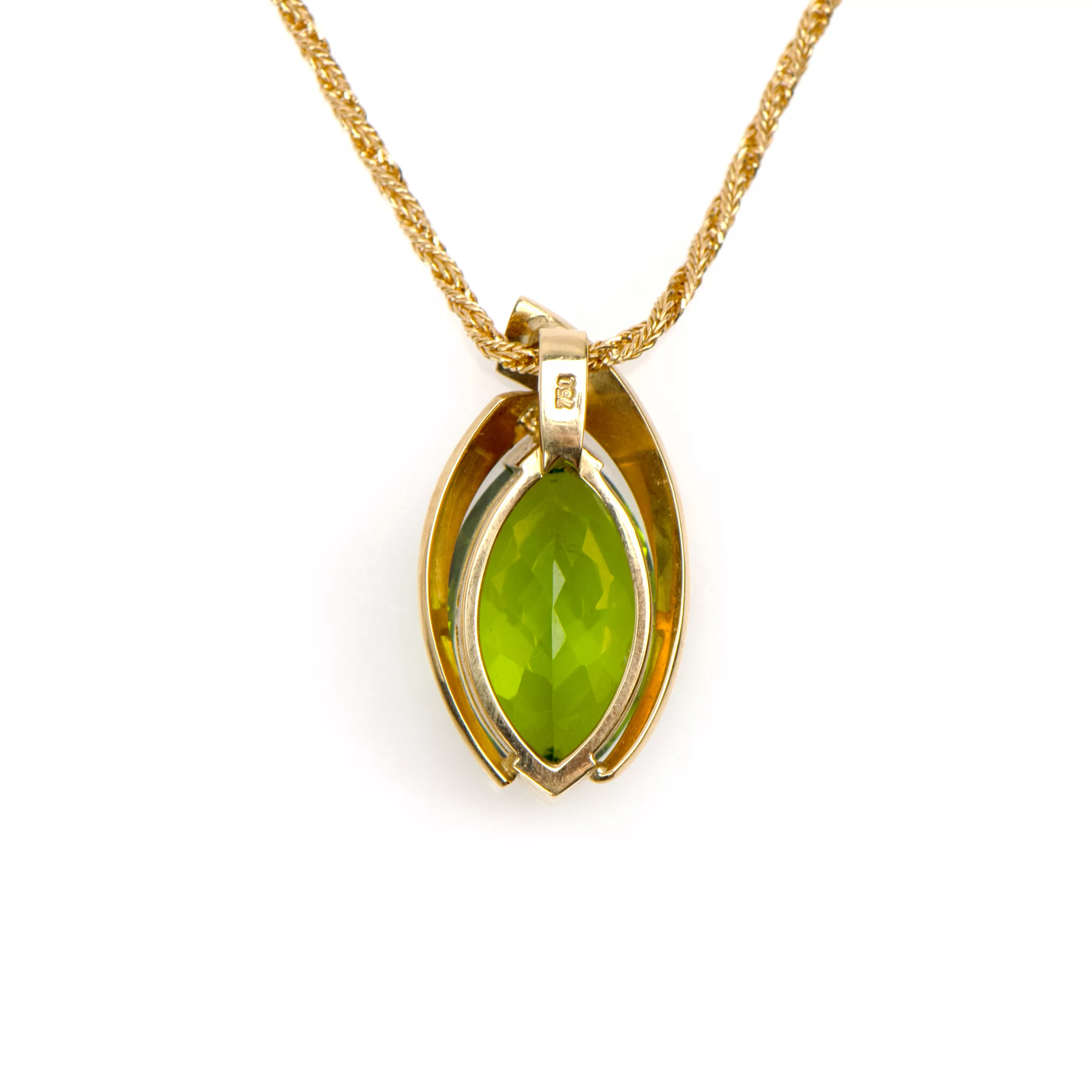 2-tlg., Kette 585 Gelbgold, punziert, Anhänger und Ring 750 Gelbgold, punziert, 2 Diopside im Navetteschliff, je 19,6 mm x 11,2 mm und 20 mm x 12,5 mm, Länge Kette 36 cm, Länge Anhänger 2,7 cm, RW 55, Gesamtgewicht ca. 25,3 g, Diopsid des Rings seitlich leicht bestoßen