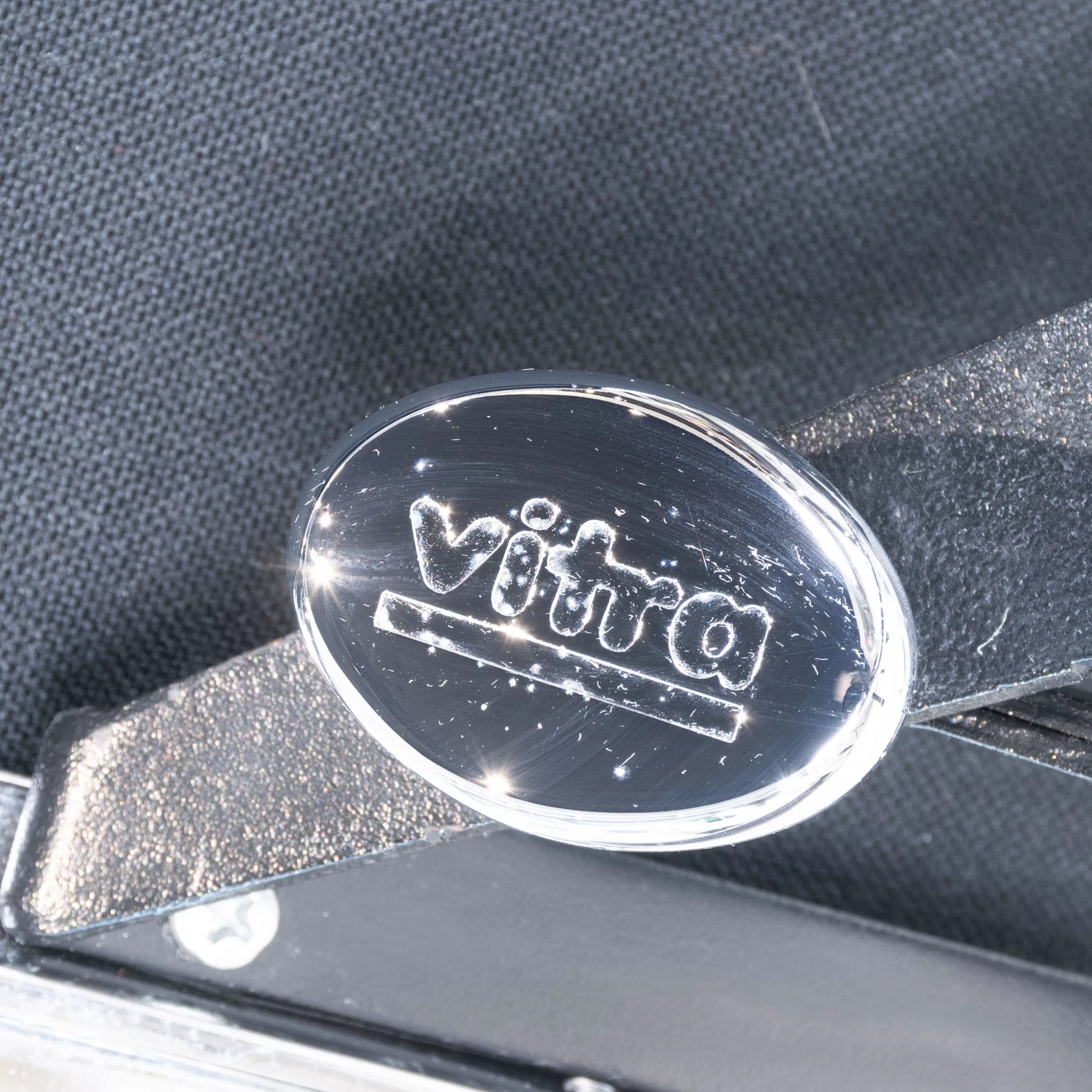 vitra, Weil am Rhein, Entwurf von Charles Eames (1907 - 1078) & Ray Eames (1912 - 1988) aus dem Jahr 1969 als Teil der 'Soft Pad Group', verchromtes Aluminium, schwarzes Leder, unterseitig mit Herstelleretikett, Herstellerpunzierung und Produktionsort, Sessel Höhe 102 cm, Sitzhöhe 40 cm, Ottomane Höhe 42 cm, Zustand A