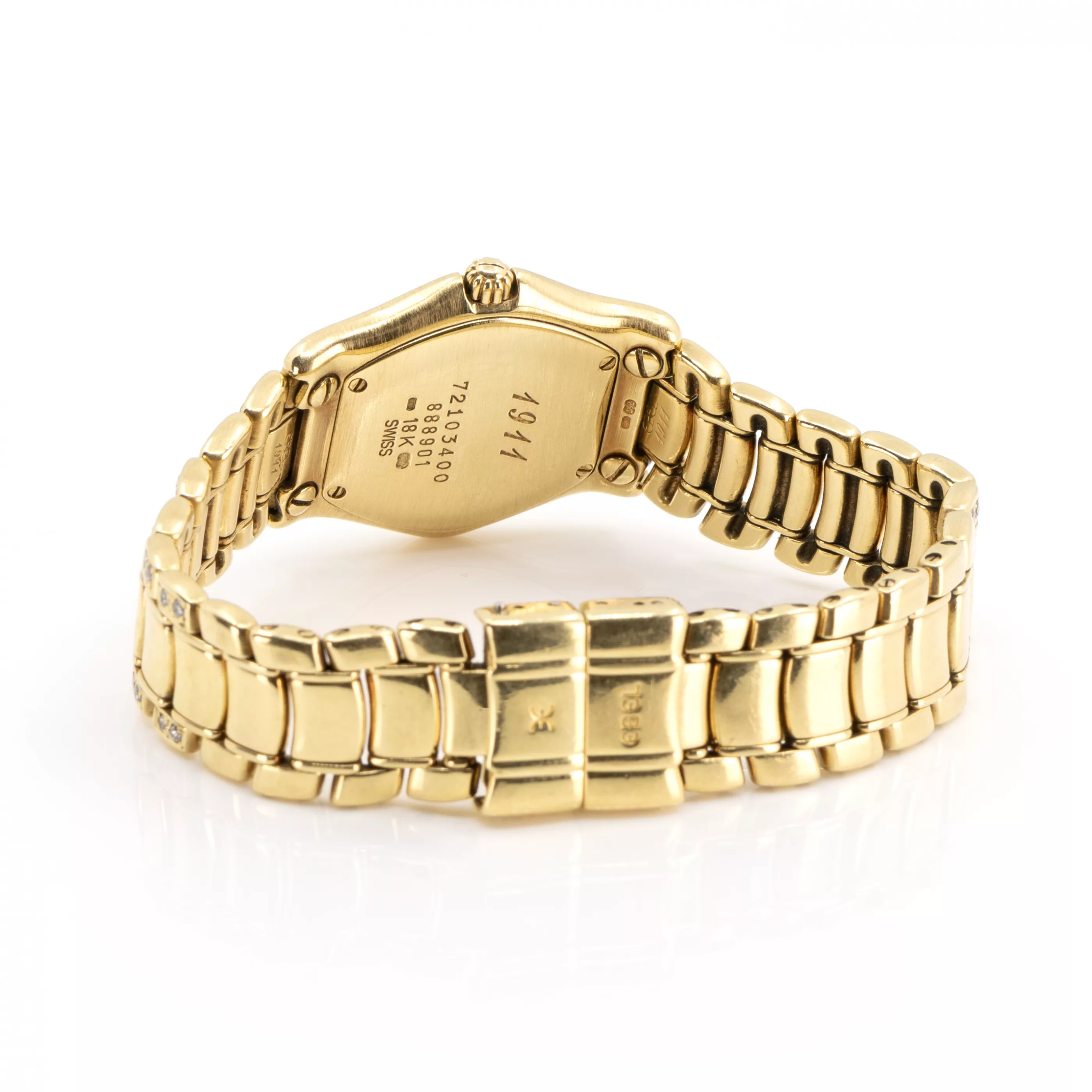Quartz, case no. 72103400 888901 | Ref. No. 1911, case 750 yellow gold, hallmarked, mother-of-pearl dial, bracelet and dial with 105 brilliant-cut diamonds, total approx. 1.50 ct, date display, diameter 25 mm, original bracelet, 750 yellow gold, original clasp, 750 yellow gold, hallmarked, length 15 cm, total weight approx. 77.8 g, function tested, not working, battery change required, condition good, glass minimally spotted, without original box or papers