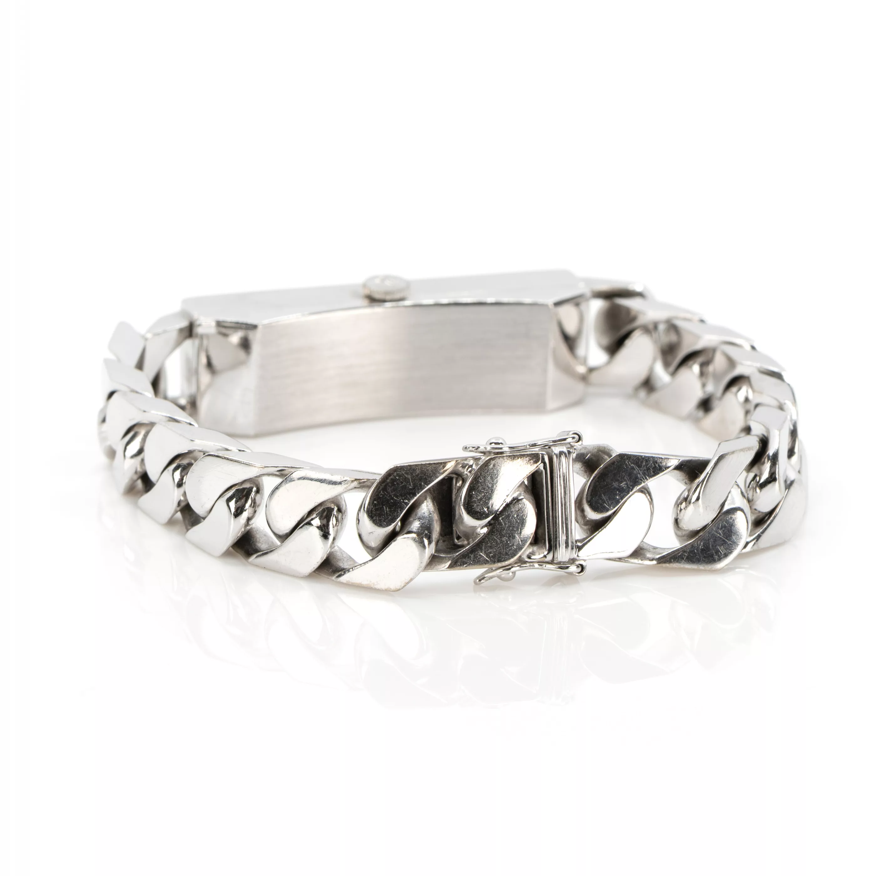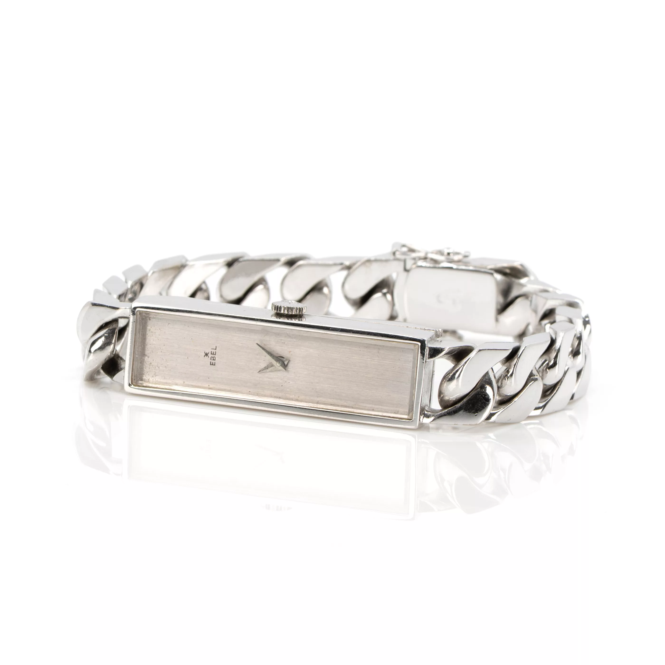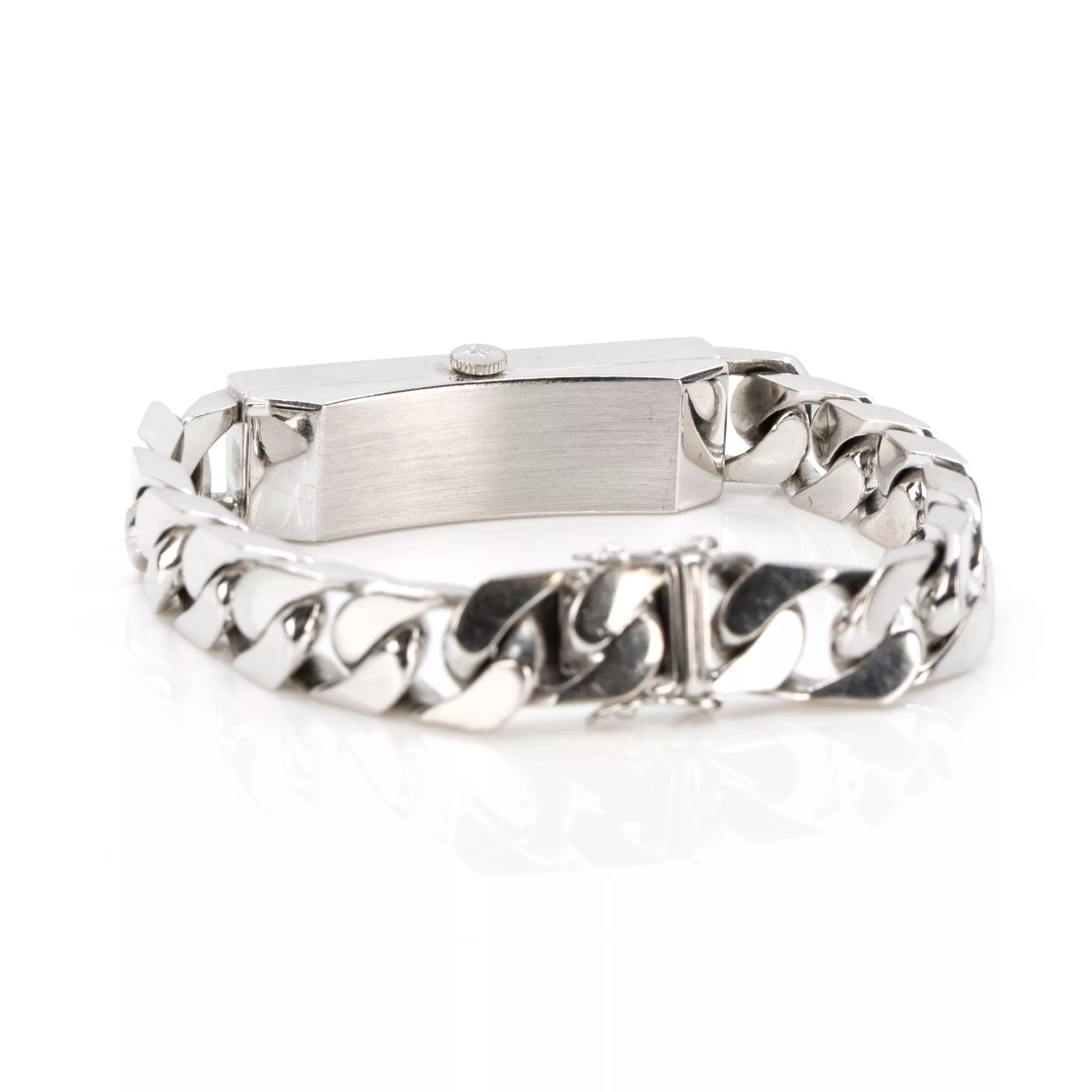Handaufzug, Gehäuse 750 Weißgold, 40 x 11 mm, Original-Armband, 750 Weißgold, Original-Schließe, 750 Weißgold, punziert, Länge 19 cm, Gewicht ca. 82,5 g, Funktion gangbar, geprüft, Zustand gut, leichte Tragespuren, Zifferblatt reinigungsbedürftig, ohne Original-Box oder -Papiere