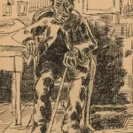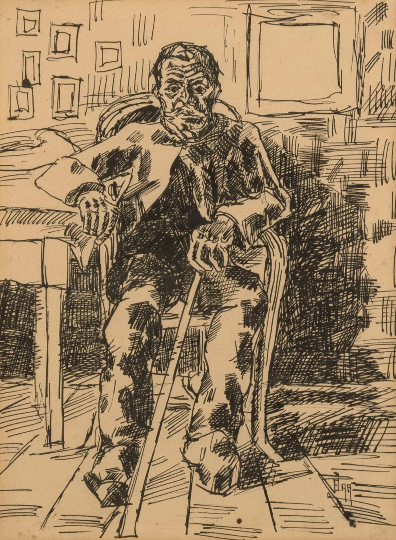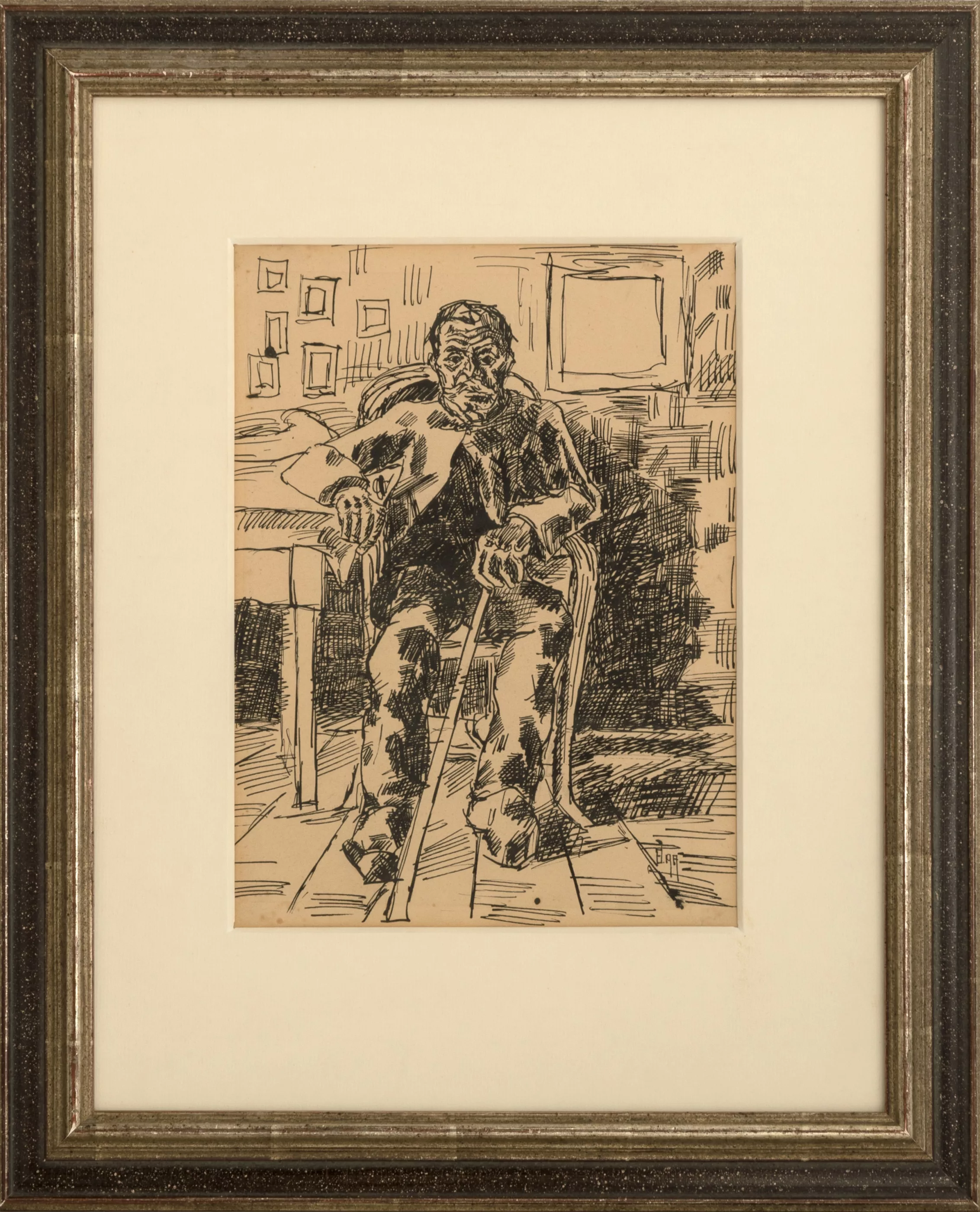 Der Schnapstrinker, Tuschfeder auf Papier, 30 cm x 22 cm Sichtmaß, monogrammiert, 1917 datiert, partiell leicht fleckig, minimal stockfleckig