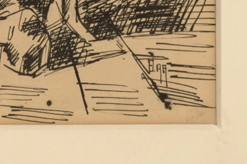 Der Schnapstrinker, Tuschfeder auf Papier, 30 cm x 22 cm Sichtmaß, monogrammiert, 1917 datiert, partiell leicht fleckig, minimal...