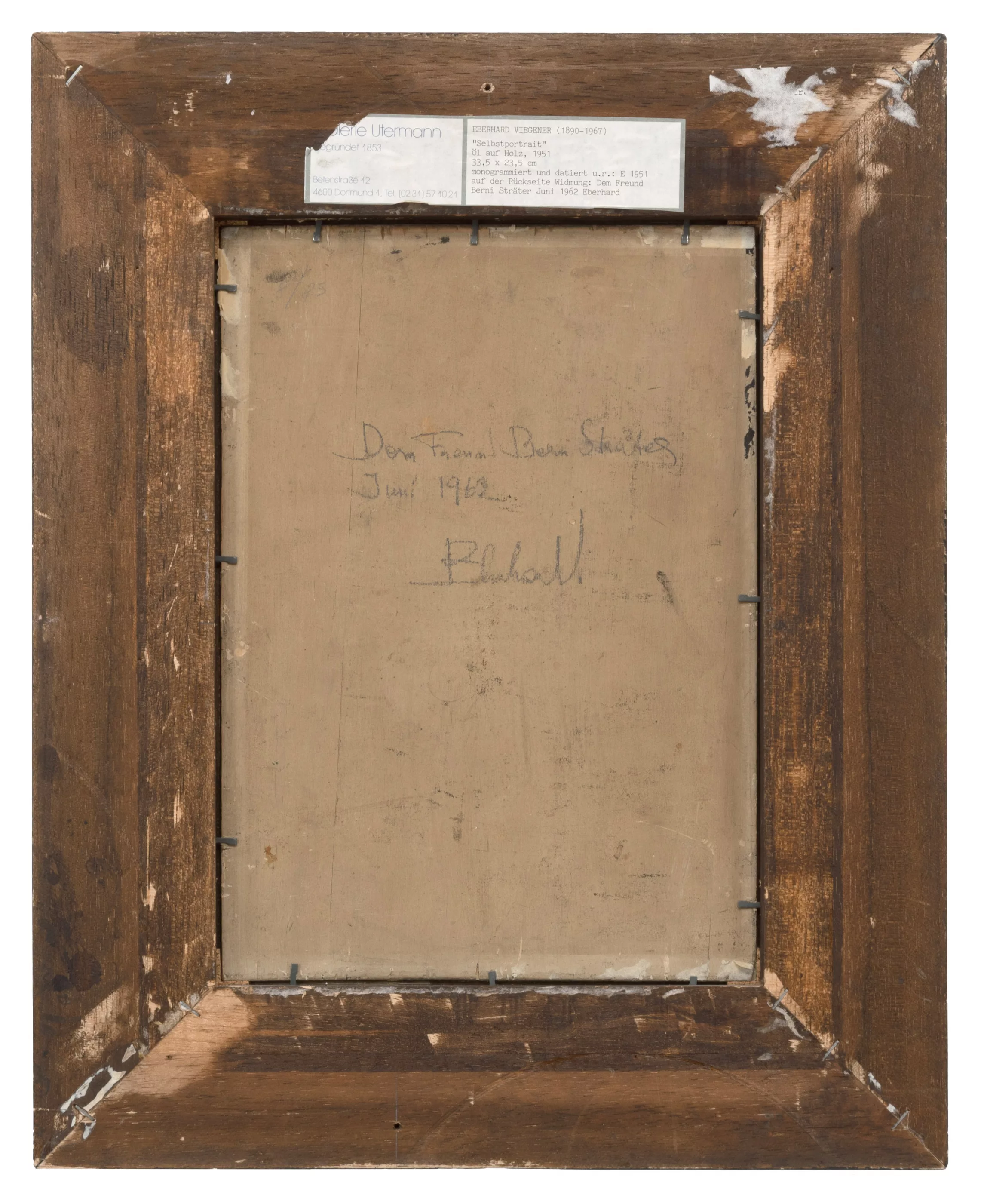Self-portrait, oil on wood, 34 cm x 24 cm plate dimensions, monogrammed, dated 1951, verso dedicated 'Dem Freund Berni Sträter Juni 1962 Eberhard' Provenance: Gallery Utermann, Dortmund (verso gallery label)