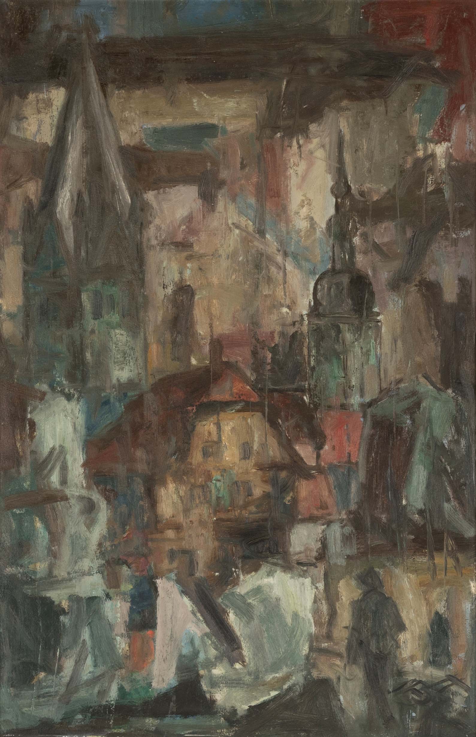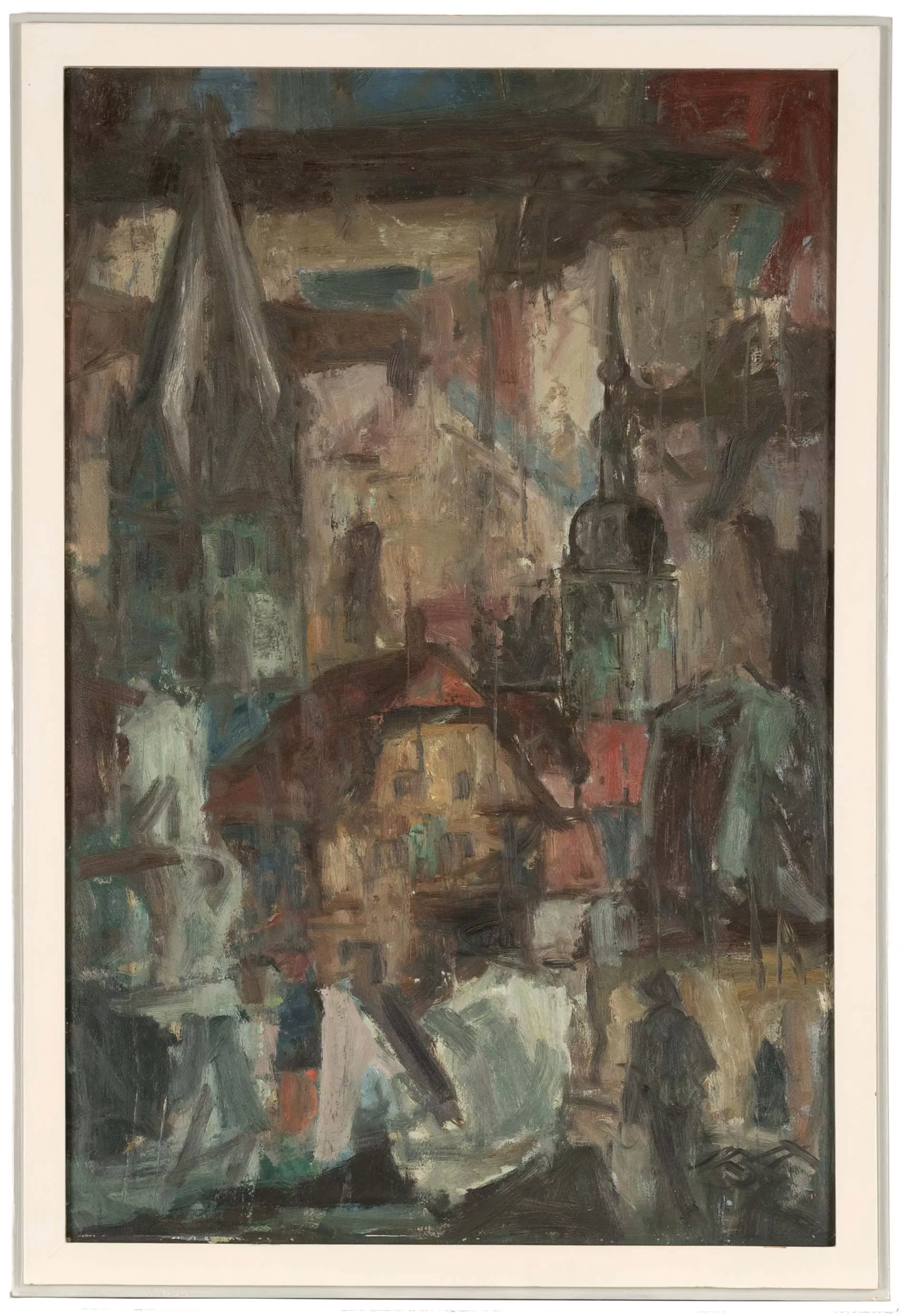 City view of Soest, oil on hardboard, 63 cm x 42 cm object dimensions, signed on verso, dedicated