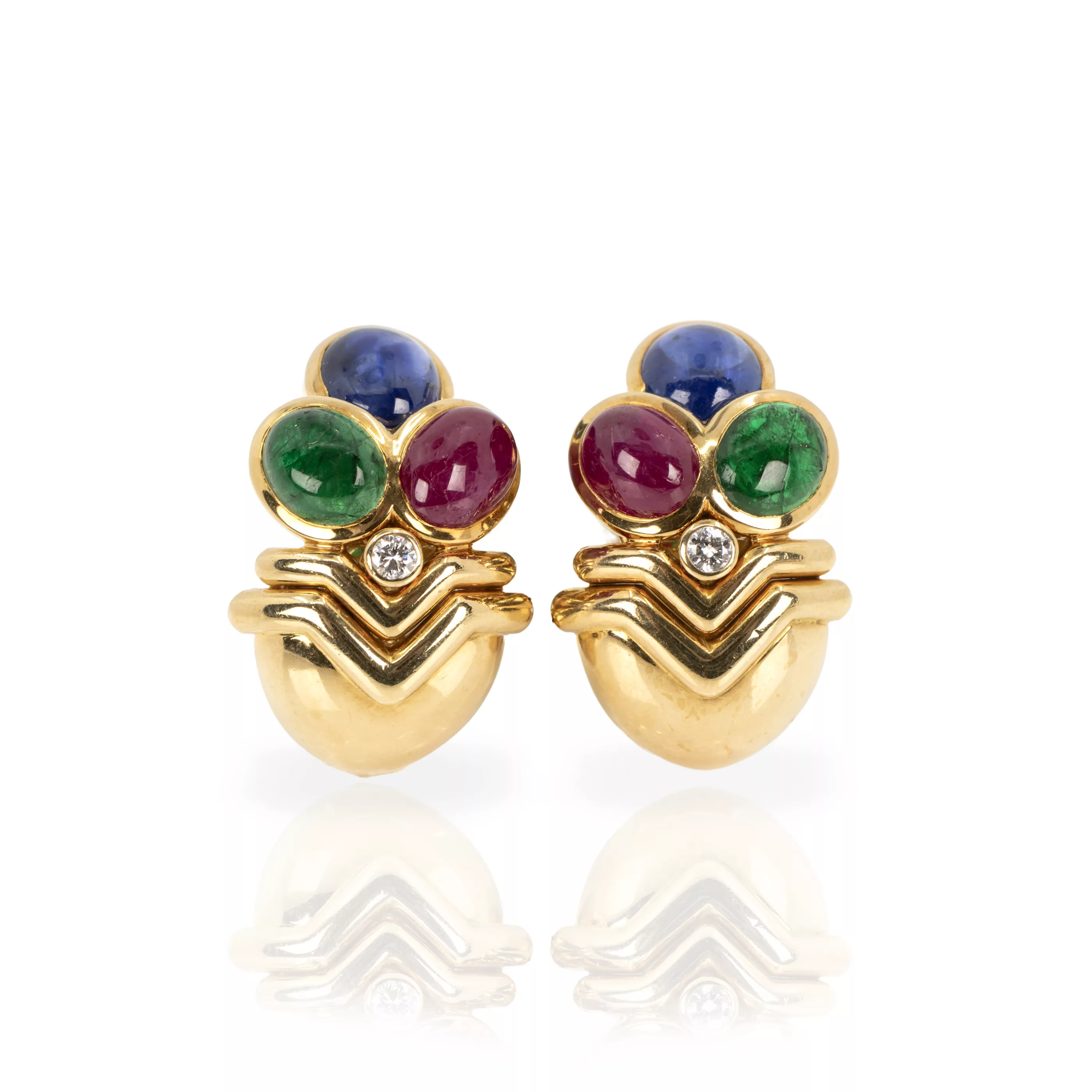 750 yellow gold hallmarked, each with 1 brilliant-cut diamond, total approx. 0.10 ct, each with one ruby, one sapphire and one cabochon-cut emerald, each approx. 1.85 ct, total approx. 3.70 ct, length 2.4 cm, total weight approx. 19.1 g, one emerald with studs