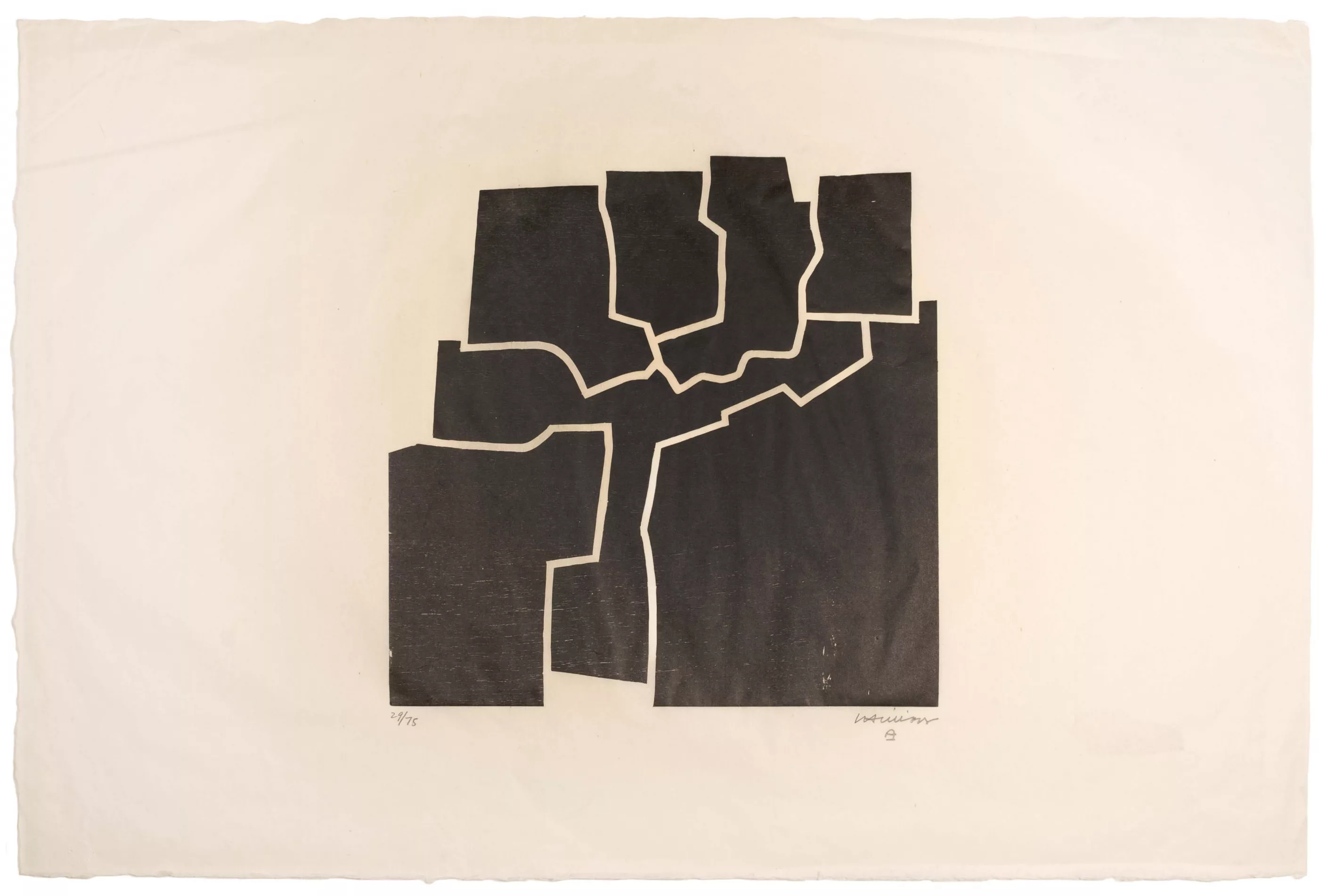 Blatt fünf aus der Mappe 'Beltza', Holzschnitt auf Japanpapier, 1969, 40 cm x 40 cm Plattenmaß, 63 cm x 94 cm Blattmaß, signiert, 29/75 nummeriert, Trockenstempel 'Erker Presse St. Gallen', partiell knickfaltig, Literatur: Wvz. Van der Koelen 69008