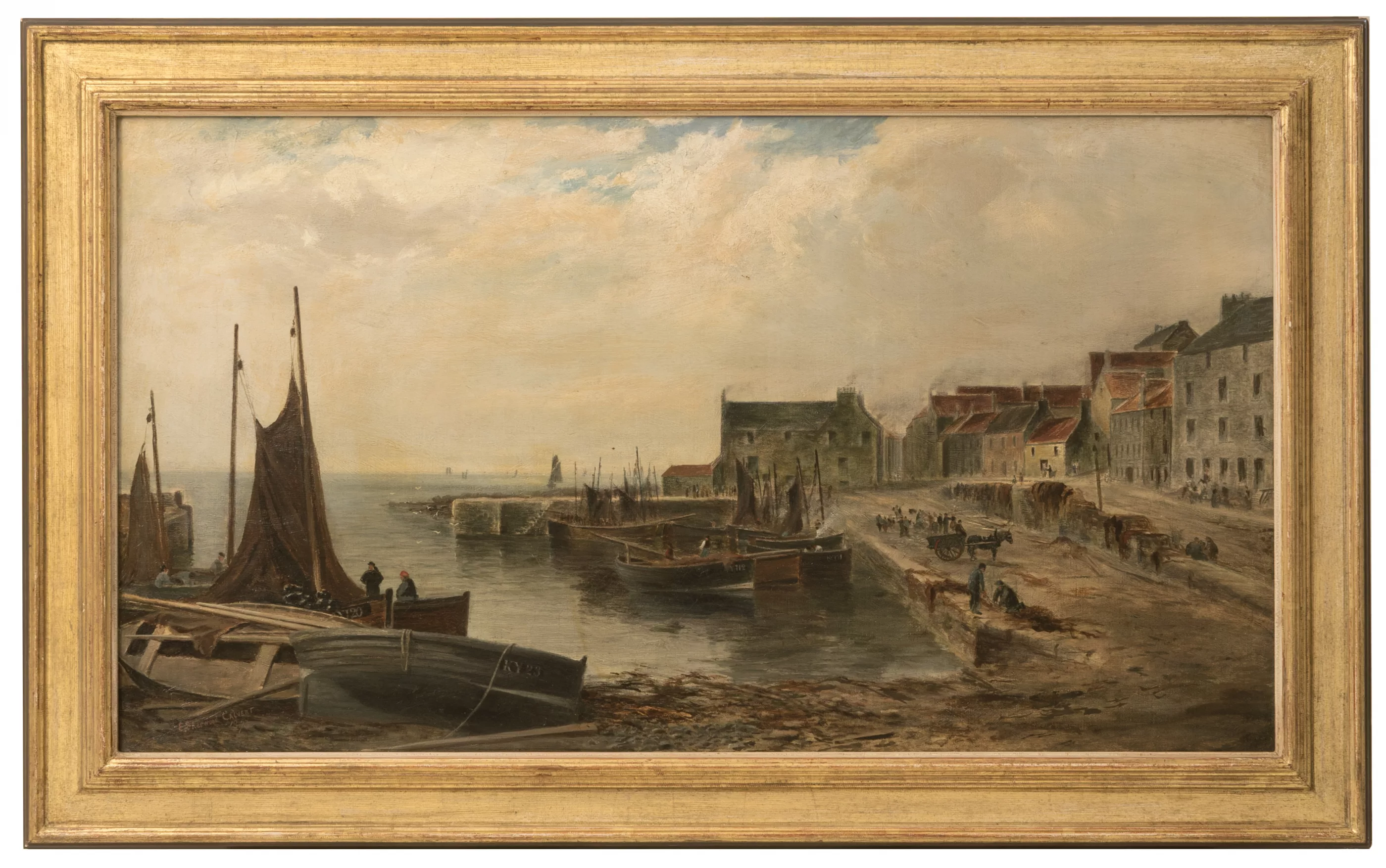 Harbor view, oil on canvas, 51 cm x 91.5 cm canvas size, signed, dated 1873, relined, partially craquelured, some small retouches, slightly in need of cleaning