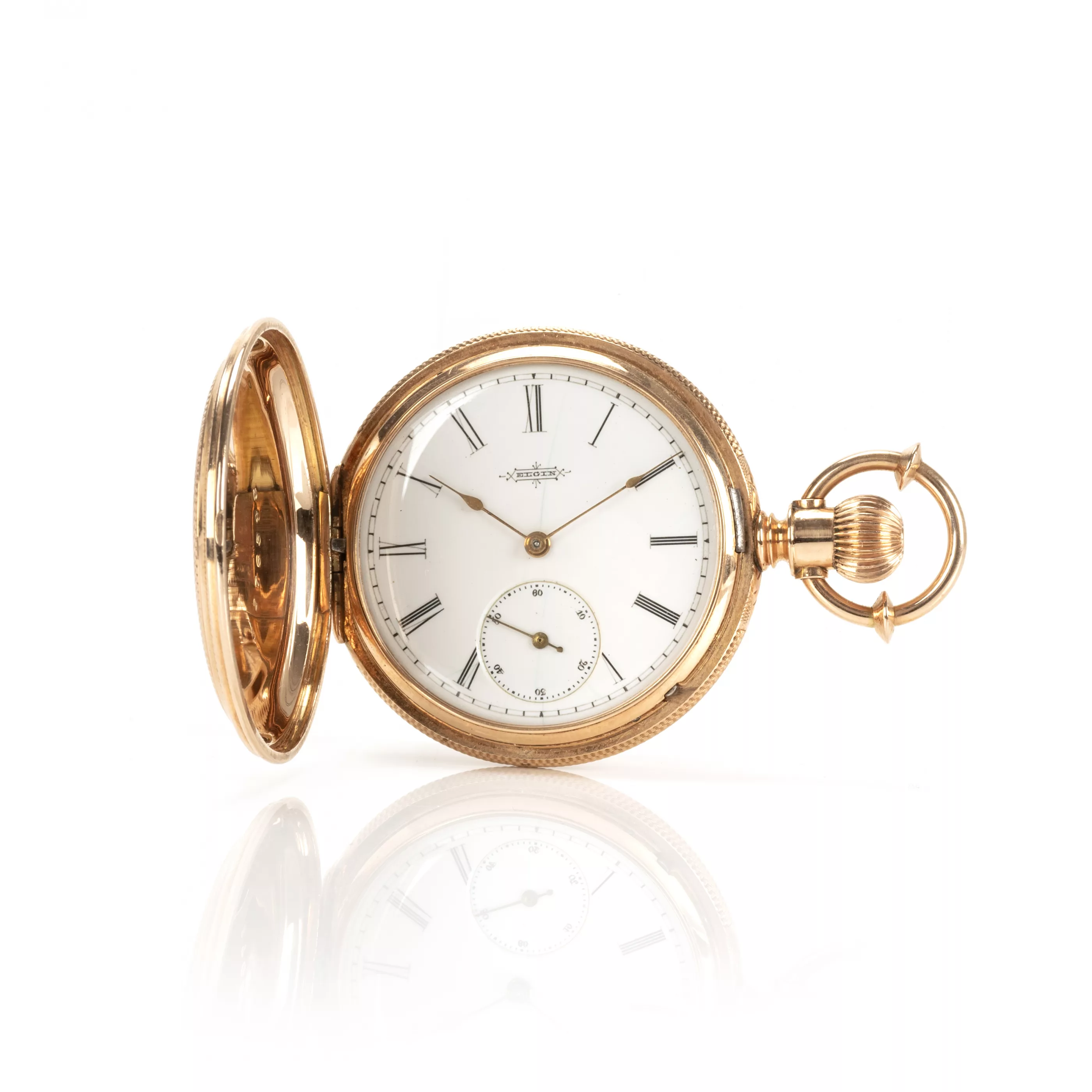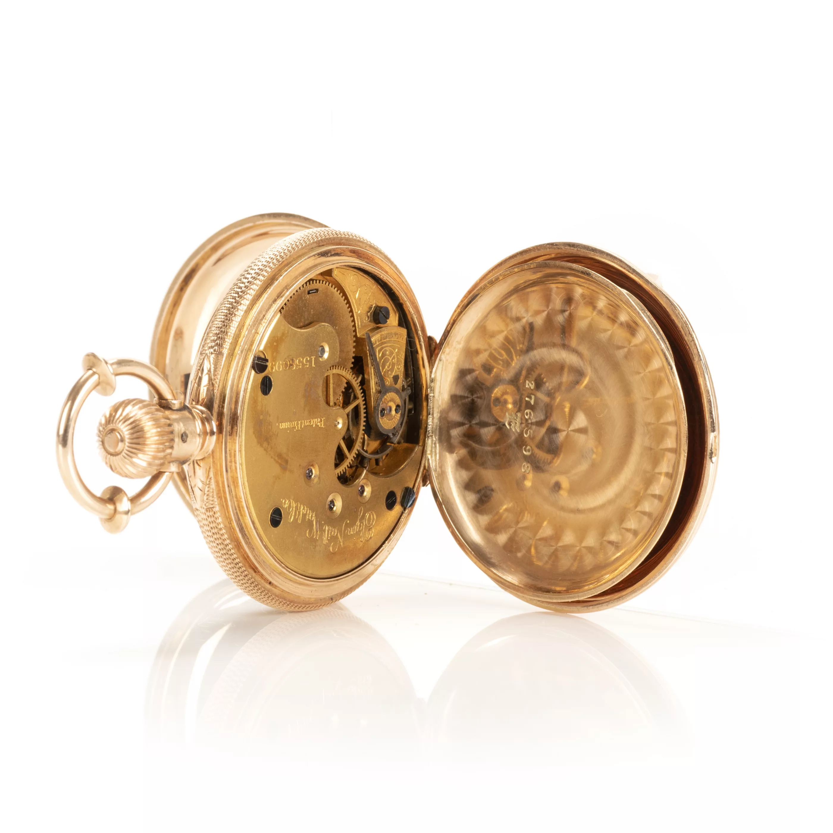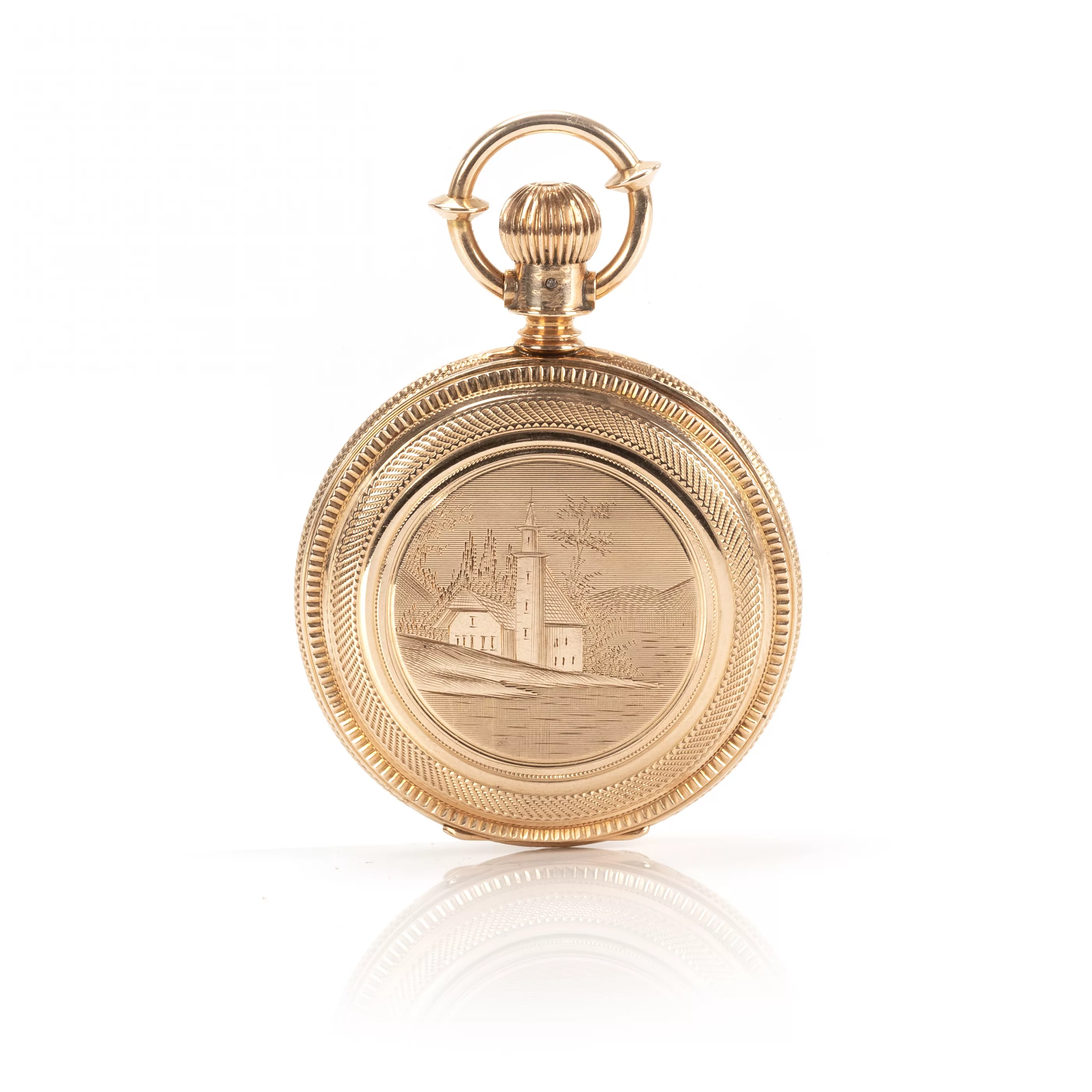 um 1850, Kronenaufzug, Gehäuse mit gravierter Landschaft, Emaille-Zifferblatt mit römischen Ziffern, kleine Sekunde mit arabischen Ziffern, Gehäuse-Nr. 276598 | Werk-Nr. 1558099, Gehäuse 585 Rotgold, punziert, Zwischendeckel 585 Rotgold, geprüft, Durchmesser 42 mm, Gesamtgewicht ca. 67,5 g, Funktion gangbar, geprüft, Zustand gut, Gehäuse TW monogrammiert, Zifferblatt mit feinen Haarrissen, Zustand und Funktionalität durch unseren Uhrmachermeister geprüft, Anmerkung: Das Aufgeld beträgt 25% inkl. MwSt. Für die Nutzung der Online-Bietkonsolen fällt eine zusätzliche Gebühr in Höhe von 3% zzgl. MwSt. (3,57%) an.
