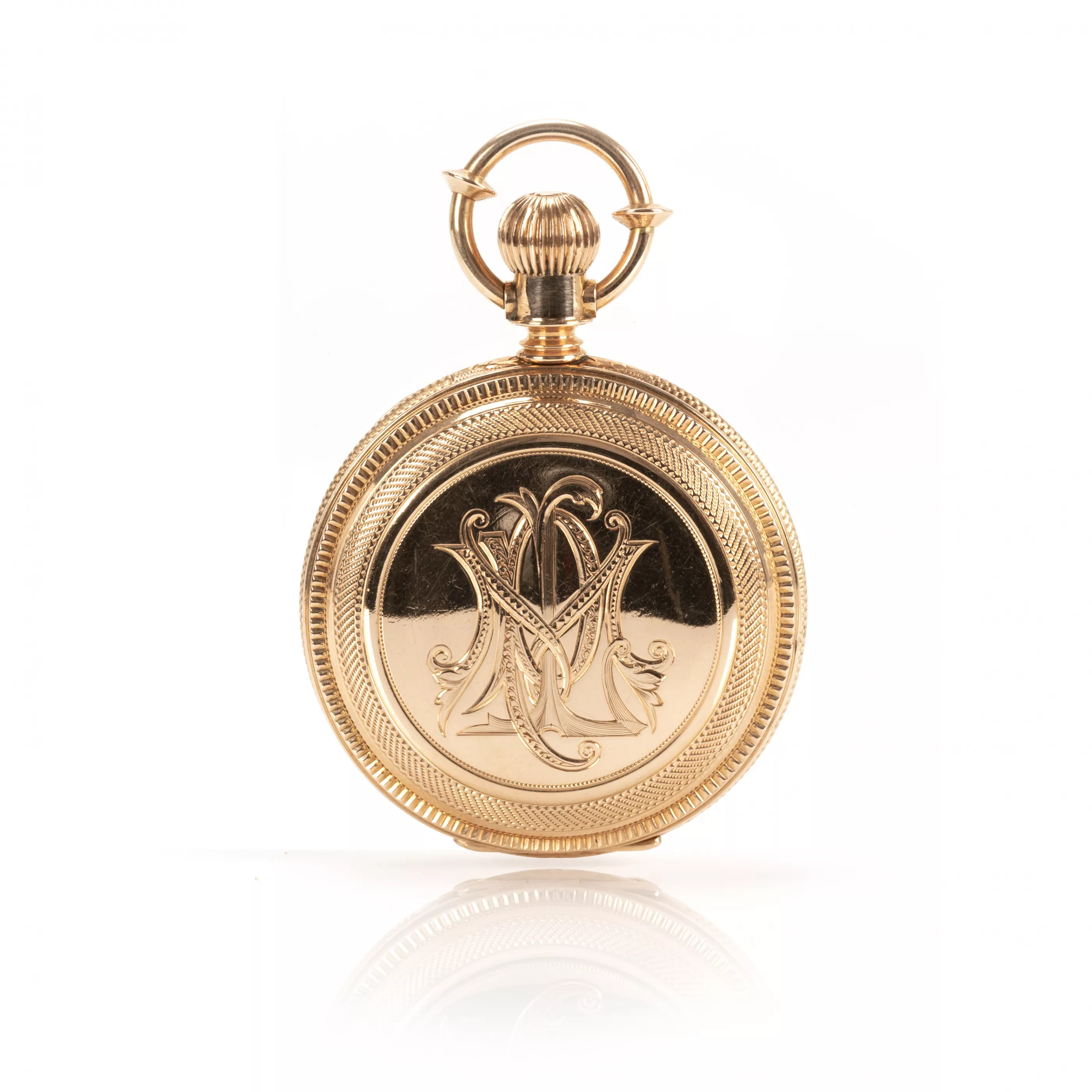 Circa 1850, crown-wound, case with engraved landscape, enamel dial with Roman numerals, small seconds with Arabic numerals, case no. 276598 | movement no. 1558099, case 585 red gold, hallmarked, intermediate cover 585 red gold, tested, diameter 42 mm, total weight approx. 67.5 g, functional, tested, condition good, case TW monogrammed, dial with fine hairline cracks, condition and functionality tested by our master watchmaker, note: The buyer's premium is 25% incl. VAT. For the use of the online bidding consoles there is an additional fee of 3% plus VAT (3.57%).