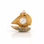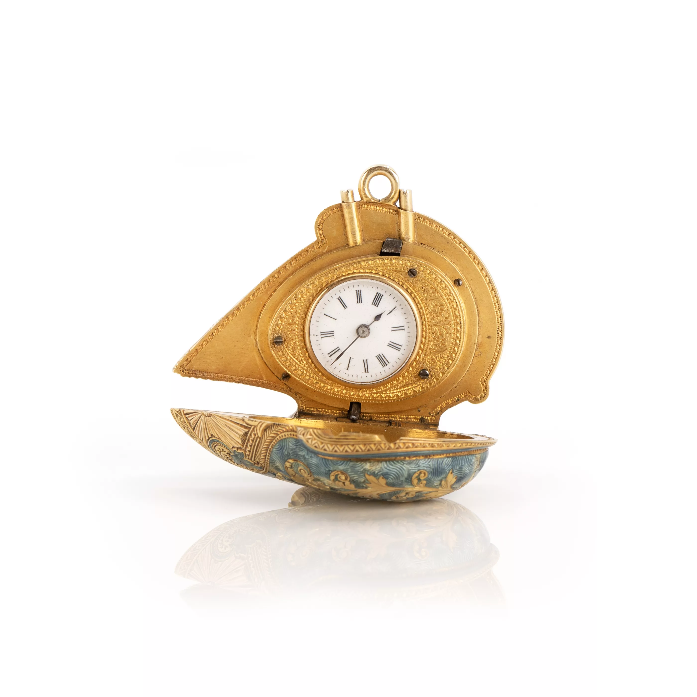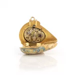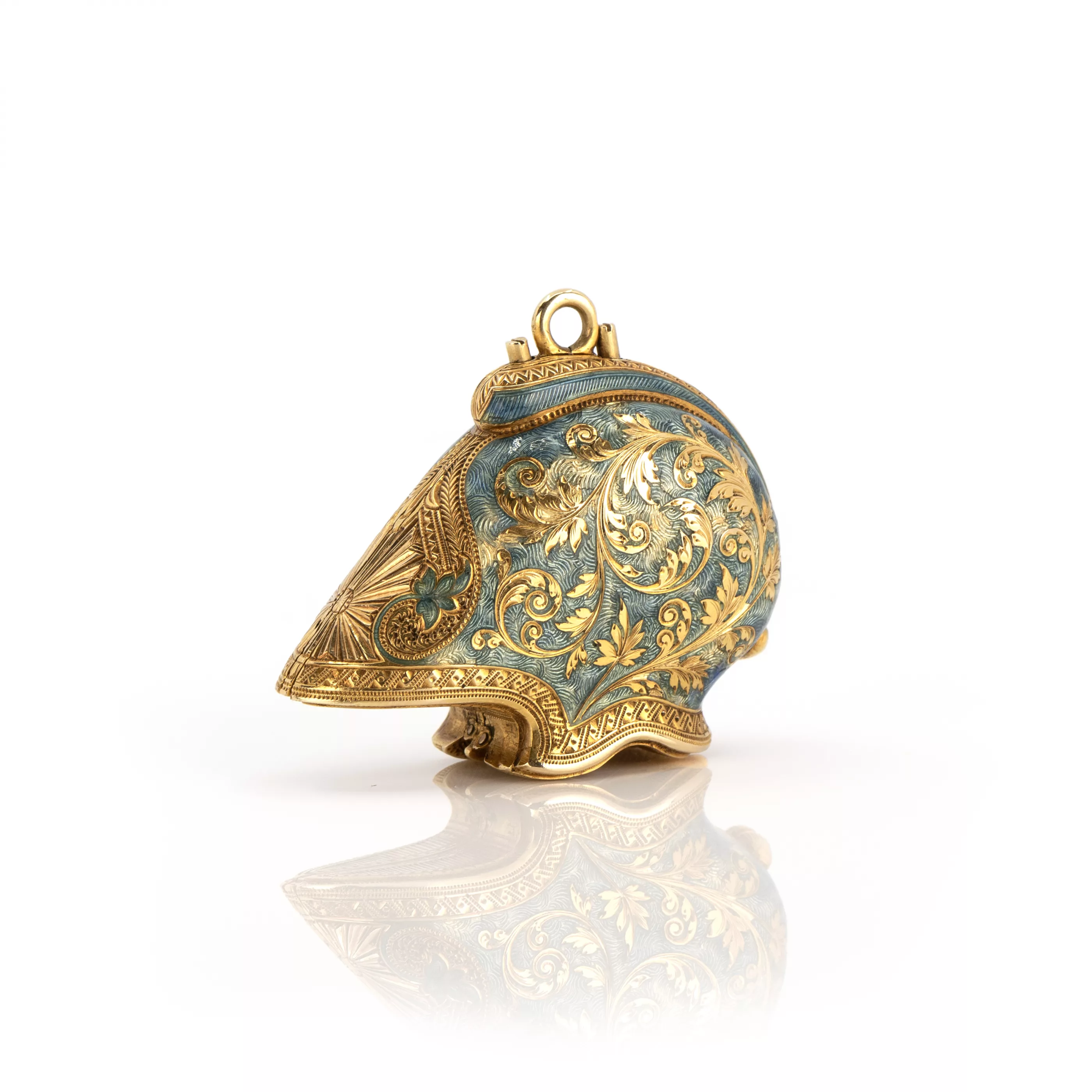 Gehäuse 750 Gelbgold, geprüft, Zwischendeckel Gelbgold, 2255 nummeriert, Gehäuse in Form eines antiken Kriegerhelmes, feine Rocaille- und Bändergravuren, blau emailliert, zu beiden Seiten aufklappbar, mittig Uhrwerk, weißes Zifferblatt mit schwarzen römischen Ziffern, umrahmt von feinen Gravuren, Anhängeröse, 44 mm x 36 mm, Gewicht ca. 36,2 g, Funktion nicht geprüft, Uhrenschlüssel nicht anbei, Zustand gut, Emaille partiell berieben, Anmerkung: Das Aufgeld beträgt 25% inkl. MwSt. Für die Nutzung der Online-Bietkonsolen fällt eine zusätzliche Gebühr in Höhe von 3% zzgl. MwSt. (3,57%) an.