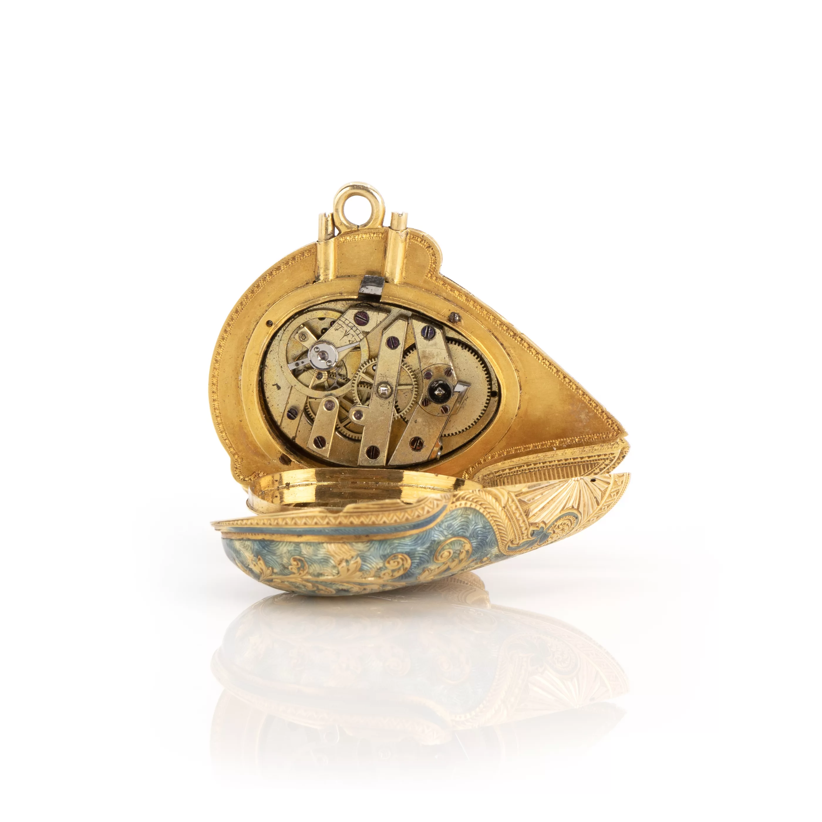 Case 750 yellow gold, tested, intermediate cover yellow gold, numbered 2255, case in the shape of an antique warrior's helmet, fine rocaille and ribbon engravings, blue enamel, hinged on both sides, central movement, white dial with black Roman numerals, framed by fine engravings, pendant eyelet, 44 mm x 36 mm, weight approx. 36.2 g, function not tested, watch key not attached, good condition, enamel partially rubbed, note: The buyer's premium is 25% incl. VAT. For the use of the online bidding consoles there is an additional fee of 3% plus VAT (3.57%).