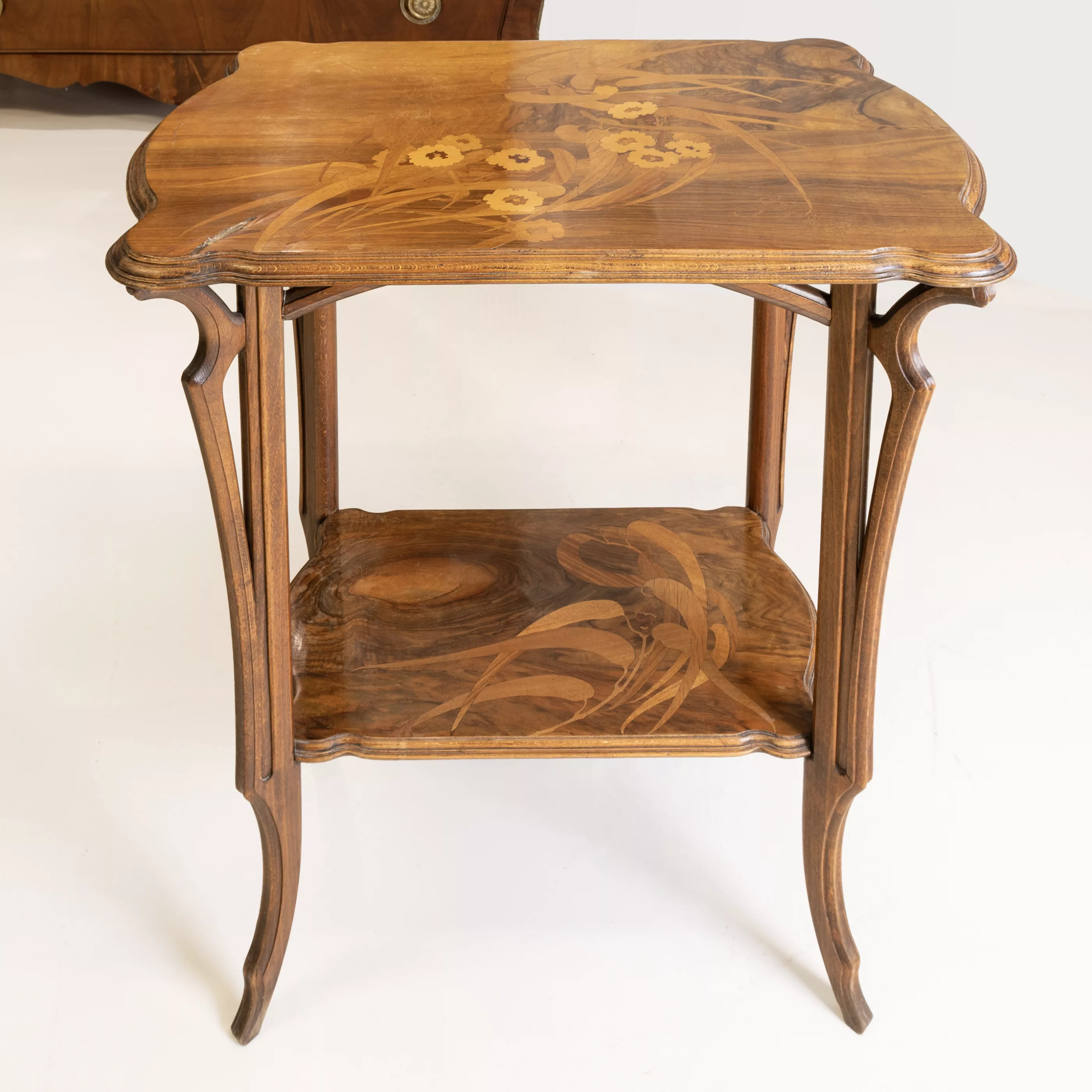 Frankreich, um 1900, signiert, Gestell Nussbaum, Platte mit intarisiertem, lisianthusähnlichem Dekor aus Edelhölzern, 76 x 76 x 49,5 cm, Zustand B, partiell kleine Furnierschäden, eine Absplitterung