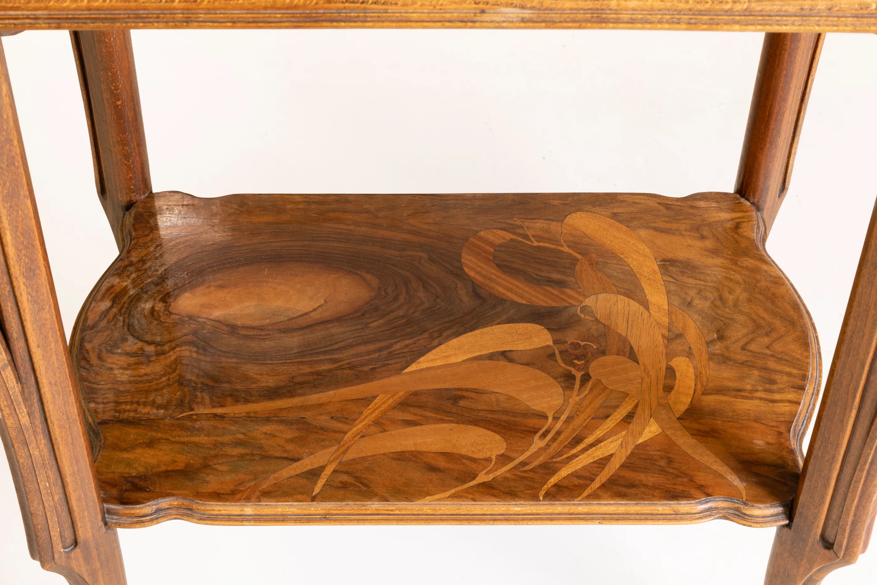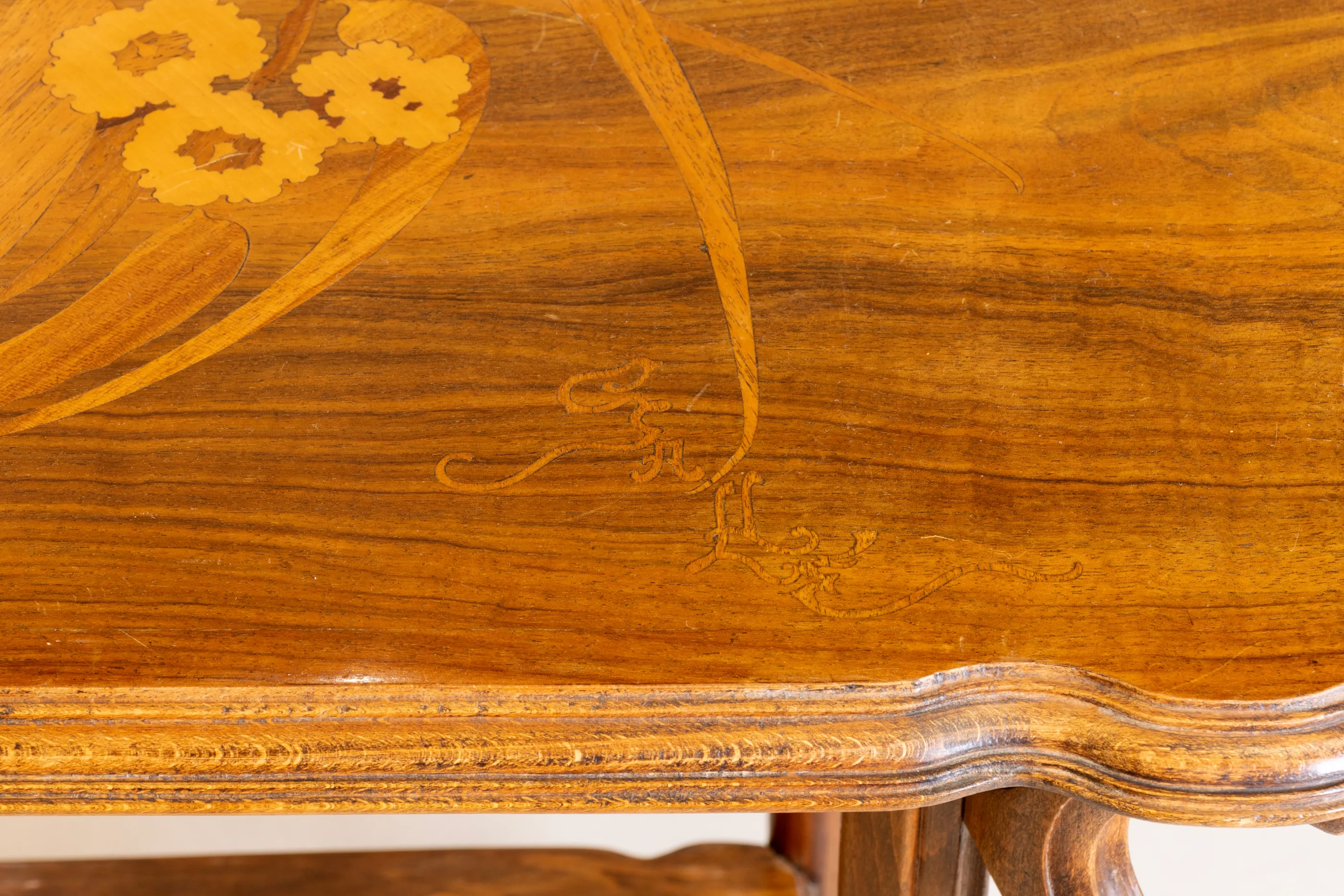 France, c. 1900, signed, walnut frame, top with inlaid lisianthus-like decoration of precious woods, 76 x 76 x 49.5 cm, condition B, minor veneer damage in places, one chip