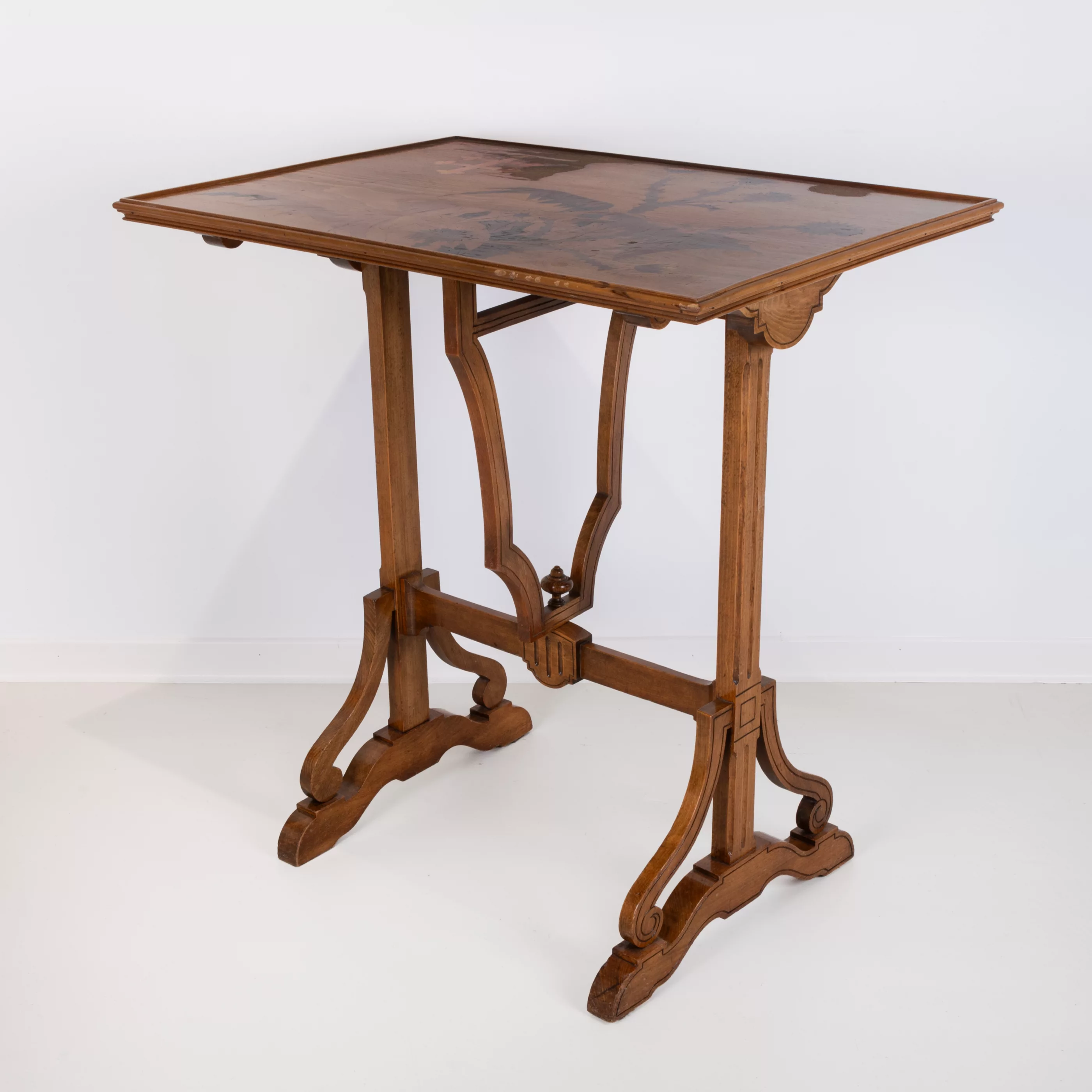 Frankreich, Nancy, um 1900, signiert, Nancy ortsbezeichnet, Gestell Nussbaum, Platte mit intarisiertem Diseldekor aus Edelhölzern, mit...
