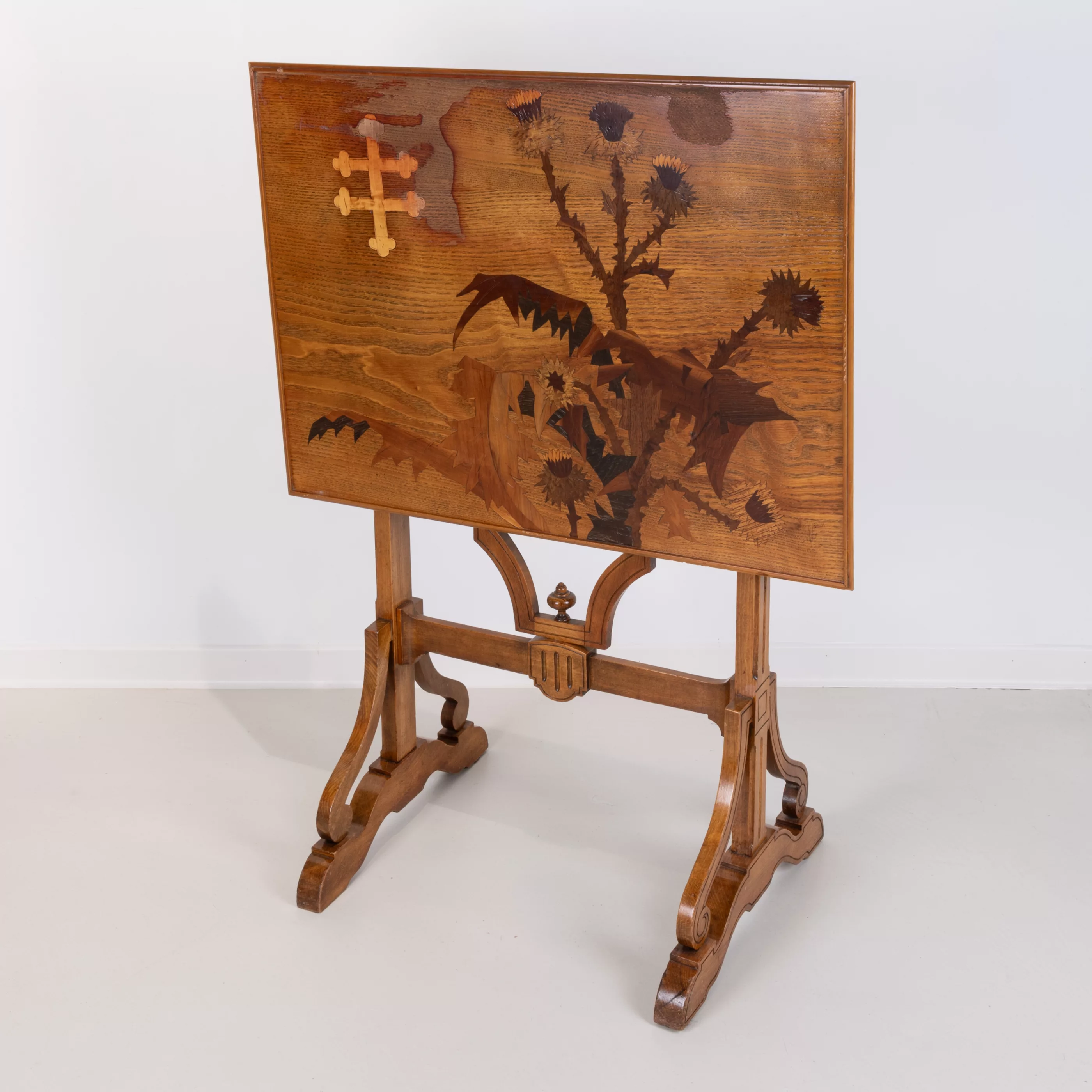 Frankreich, Nancy, um 1900, signiert, Nancy ortsbezeichnet, Gestell Nussbaum, Platte mit intarisiertem Diseldekor aus Edelhölzern, mit drehbarem Element zum Arretieren der Tischplatte, aufgeklappt 75 x 72 x 52 cm, partiell bestoßen, Tischplatte mit Lackschaden, Zustand C