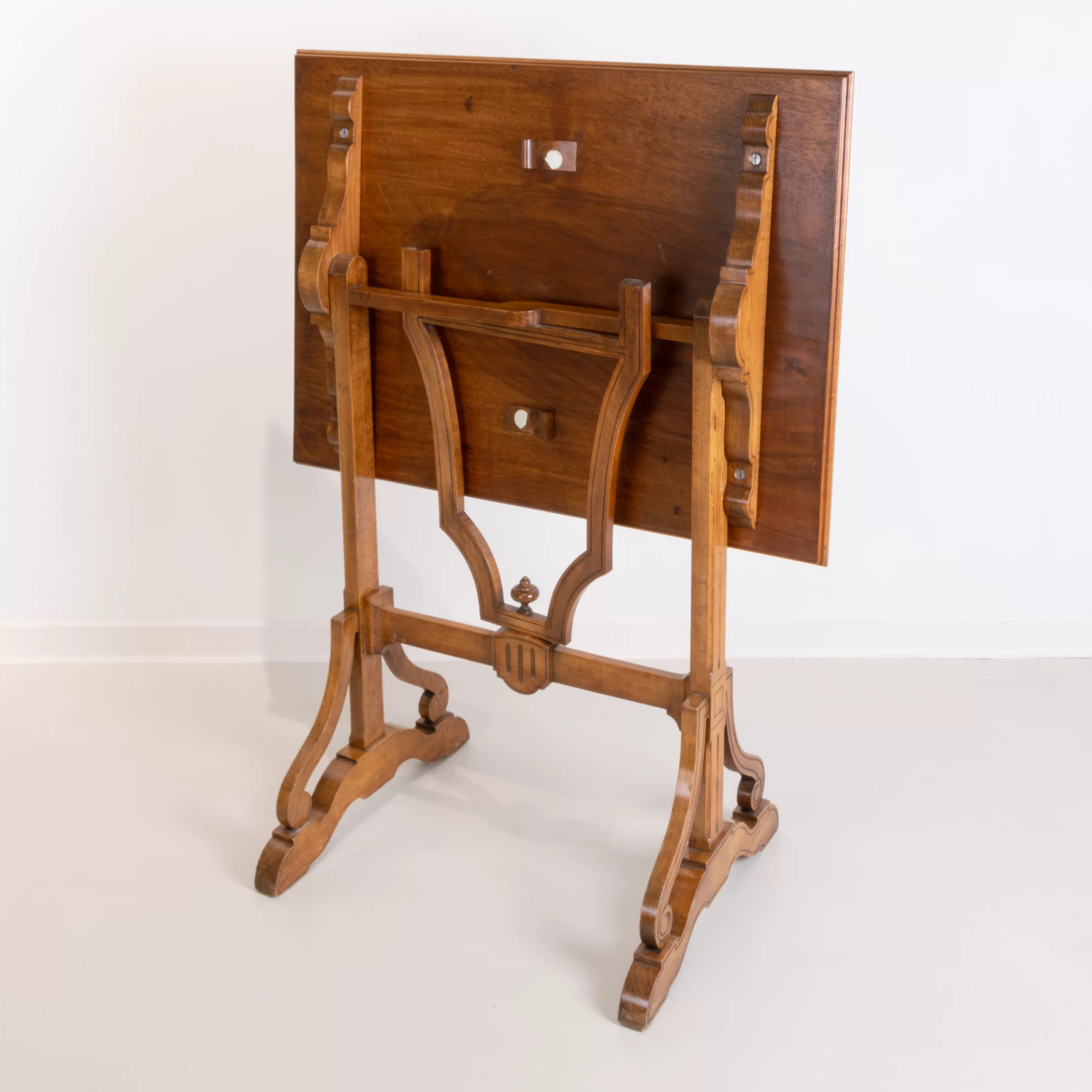 France, Nancy, c. 1900, signed, Nancy inscribed, walnut frame, top with inlaid disel decor of precious woods, with swivel element to lock the table top, unfolded 75 x 72 x 52 cm, partially bumped, table top with lacquer damage, condition C
