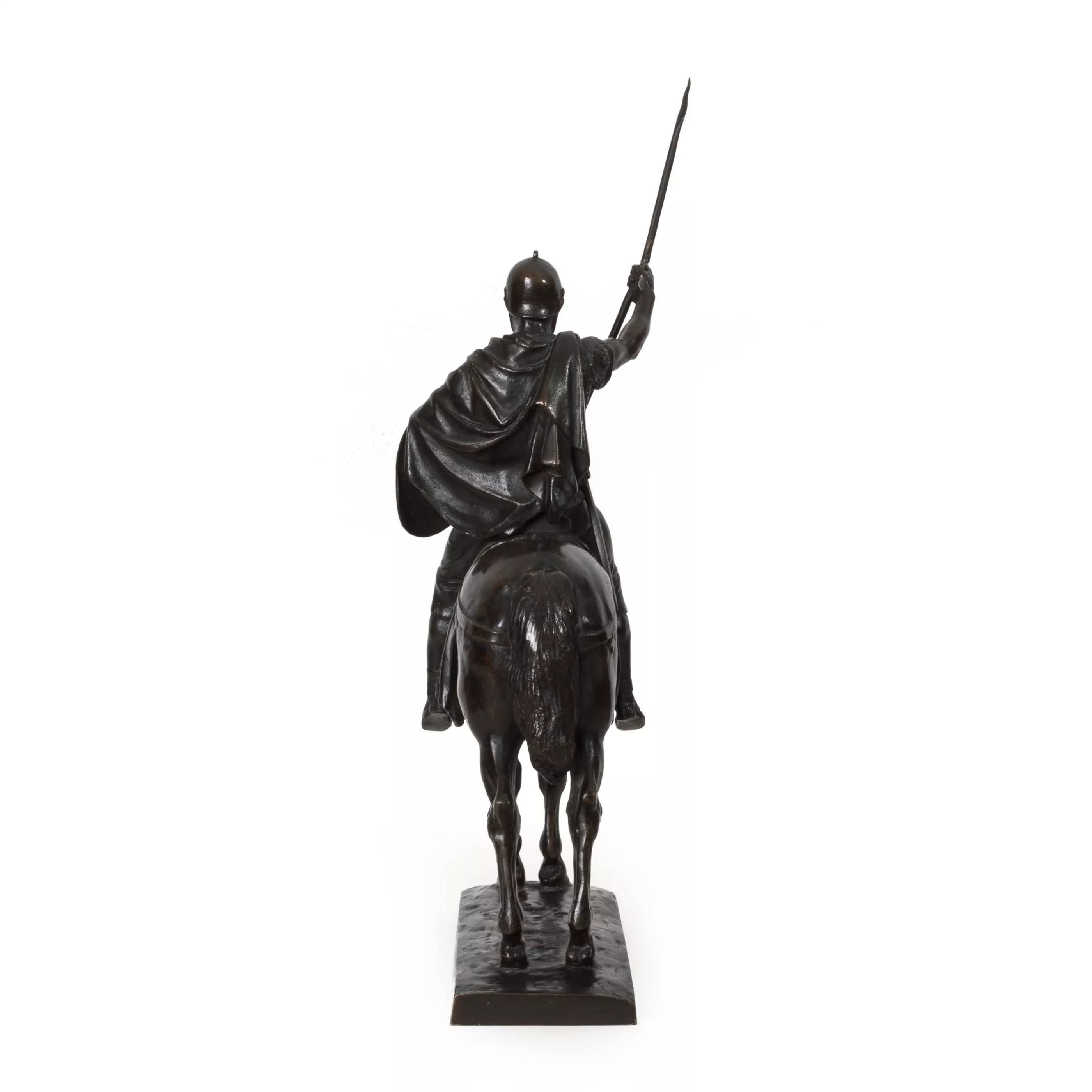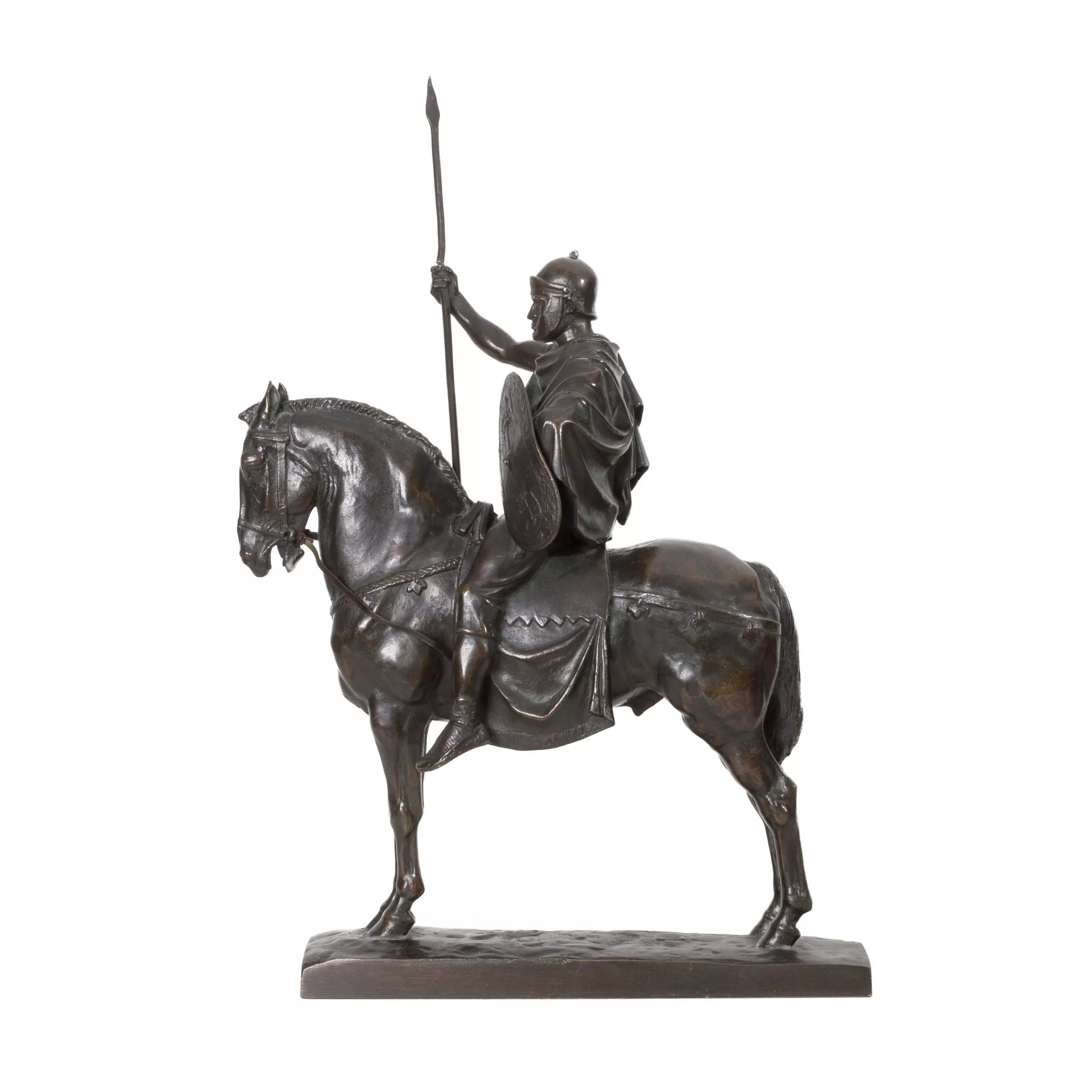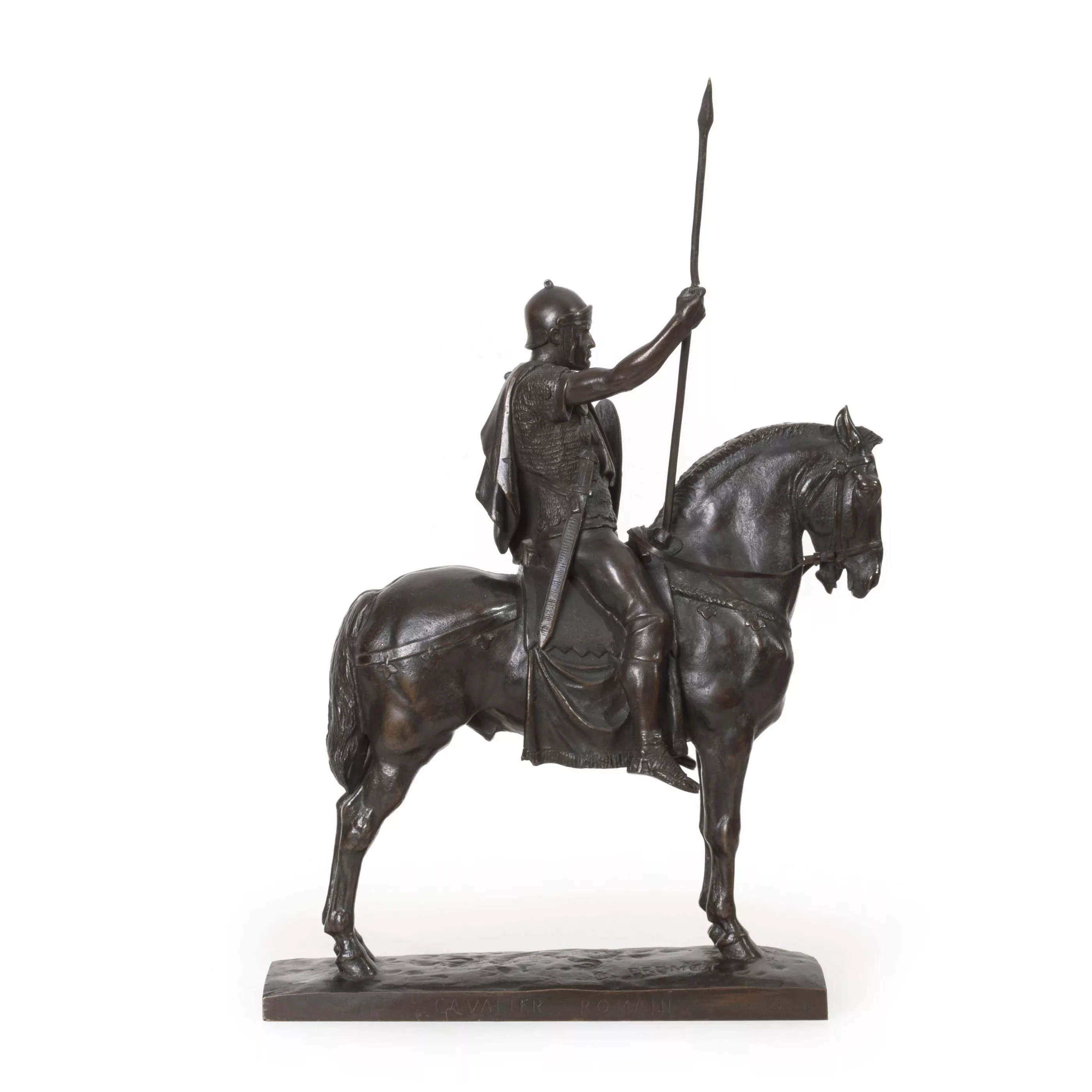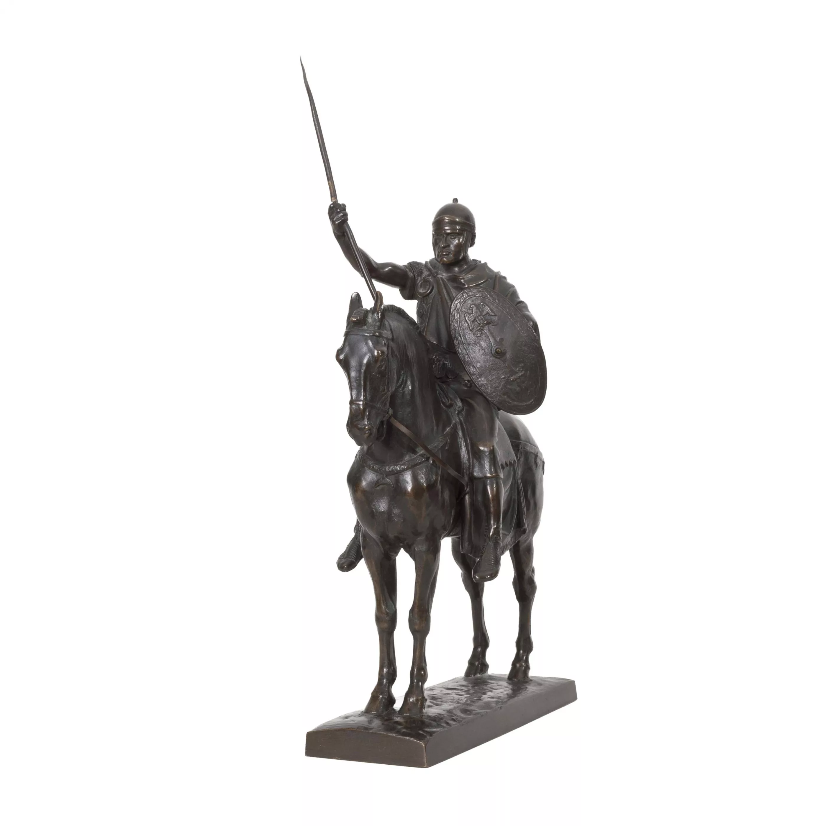 'Cavalier romain', Bronze, dunkelbraun patiniert, Höhe 42 cm, im Guss signiert, betitelt, Gießerstempel 'F. Barbedienne', Zügel gebrochen, Lanze gebrochen, Arm beweglich, partiell kleine oberflächliche Kratzer und Bereibungen