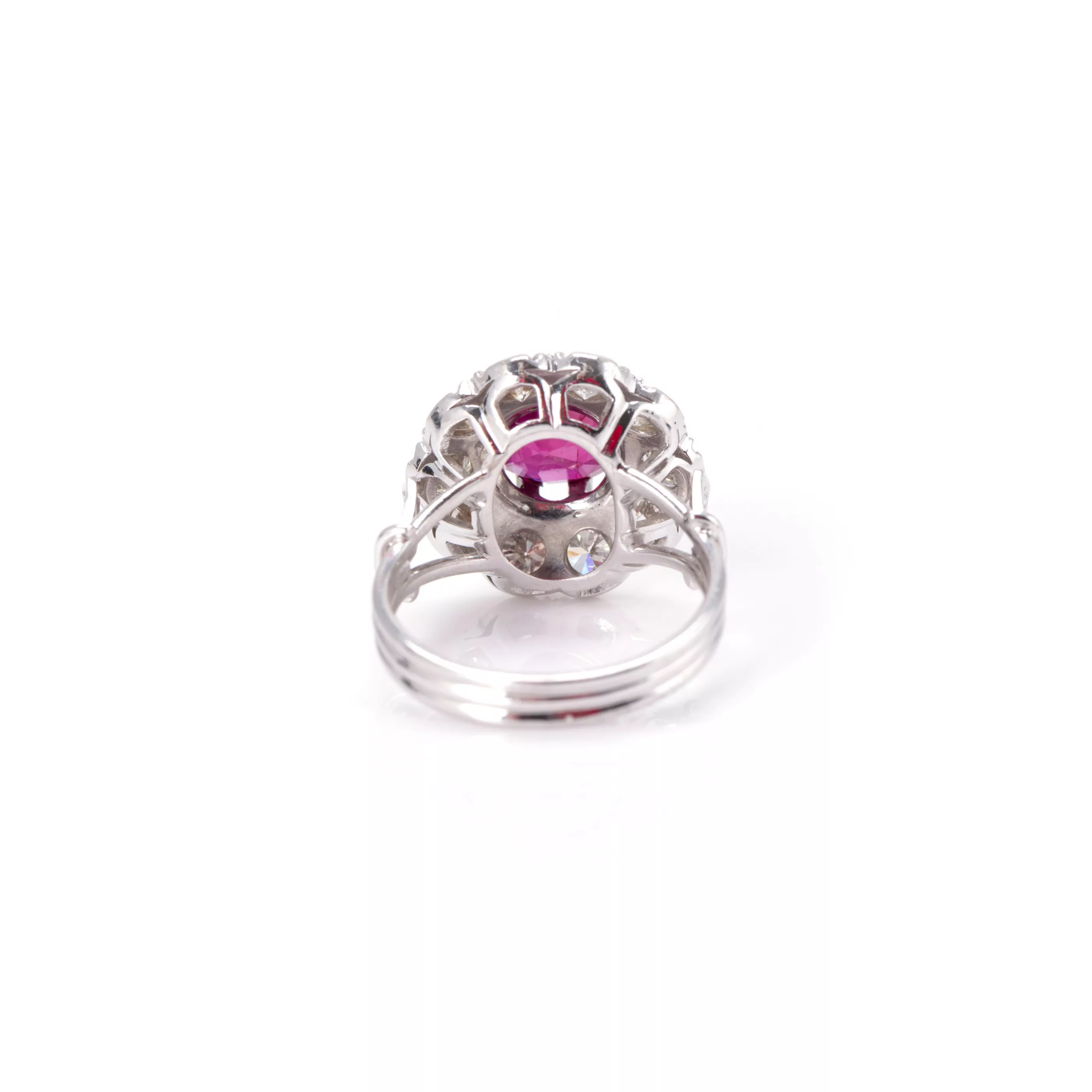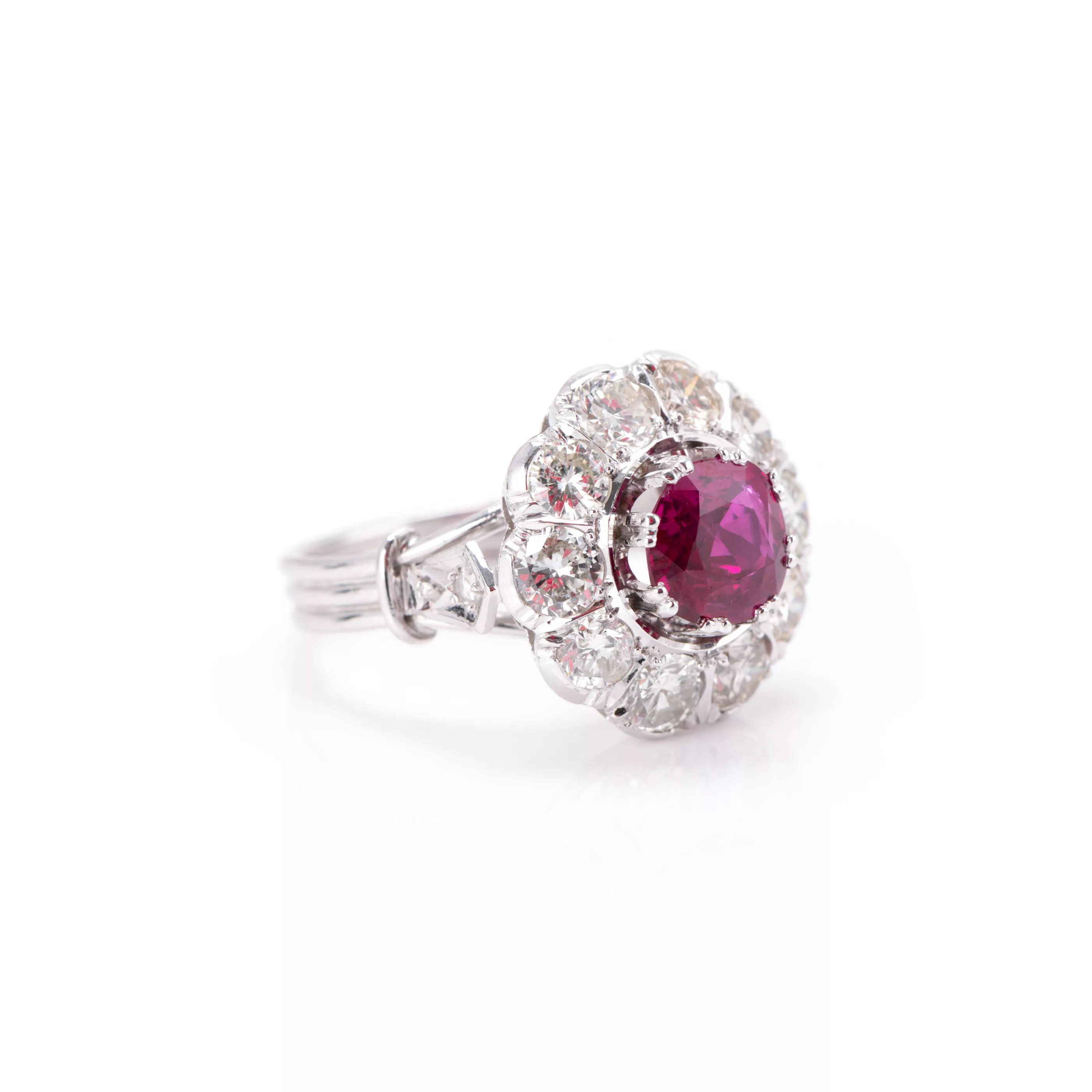 585 Weißgold, punziert, 10 Diamanten im Brillantschliff, gesamt ca. 2,00 ct, seitlich Diamantrosen, gesamt ca. 0,06 ct, G-I, vvs-vs, zentraler, rund facettierter Rubin, ca. 1,75 ct, RW 56, Gewicht ca. 7 g, Rubin seitlich mit minimaler Bestoßung und oberflächlichen Tragespuren
